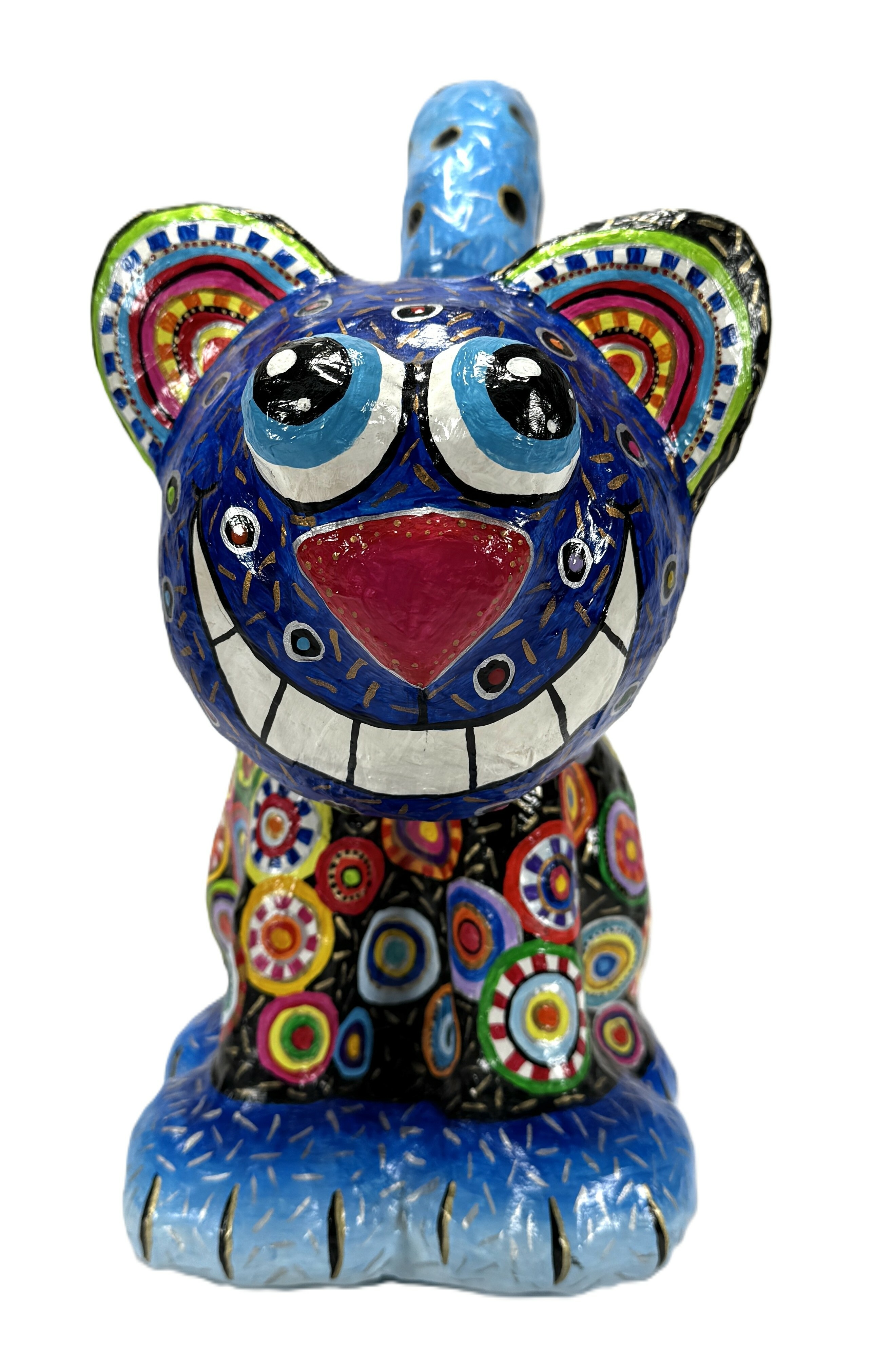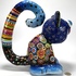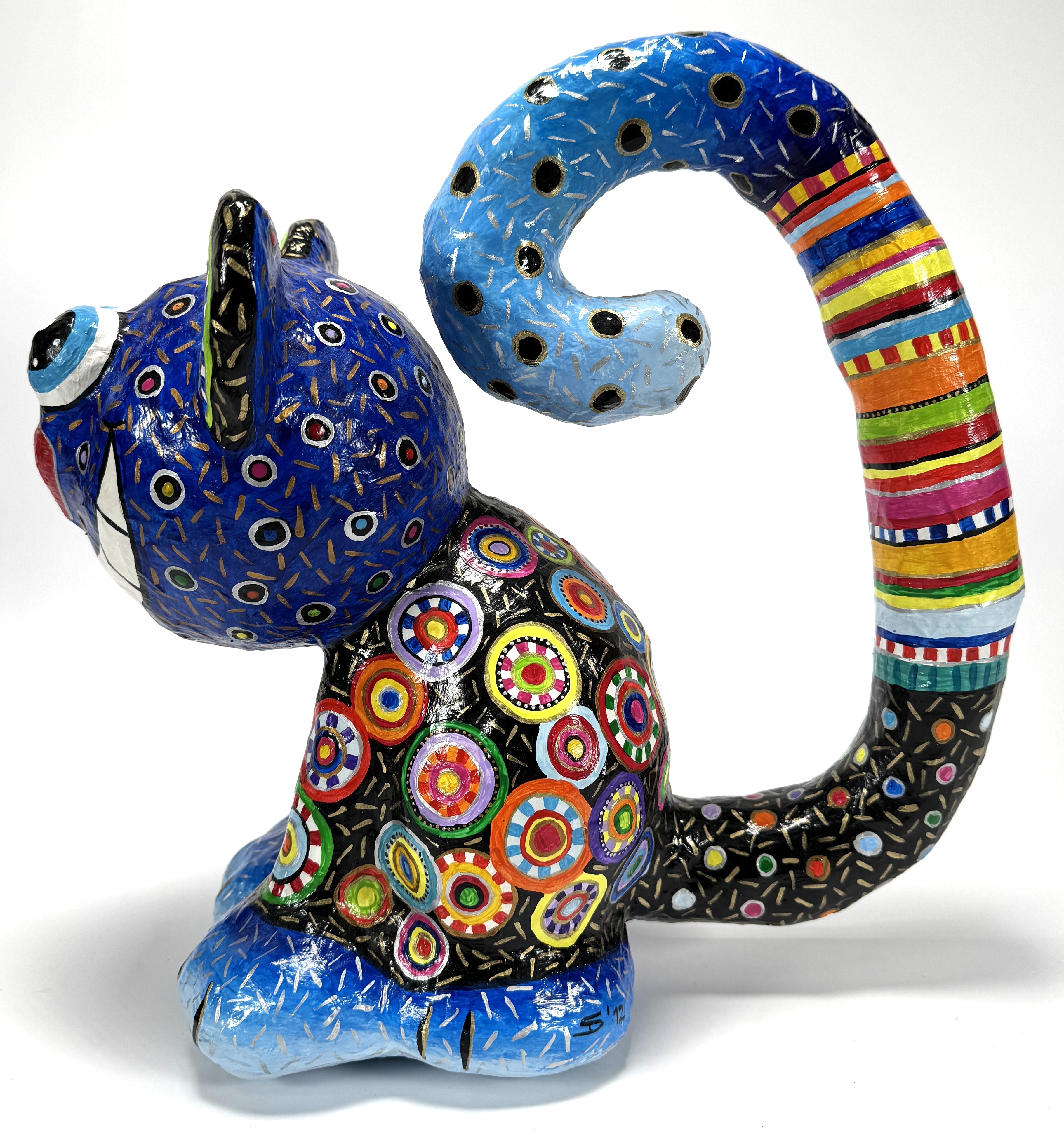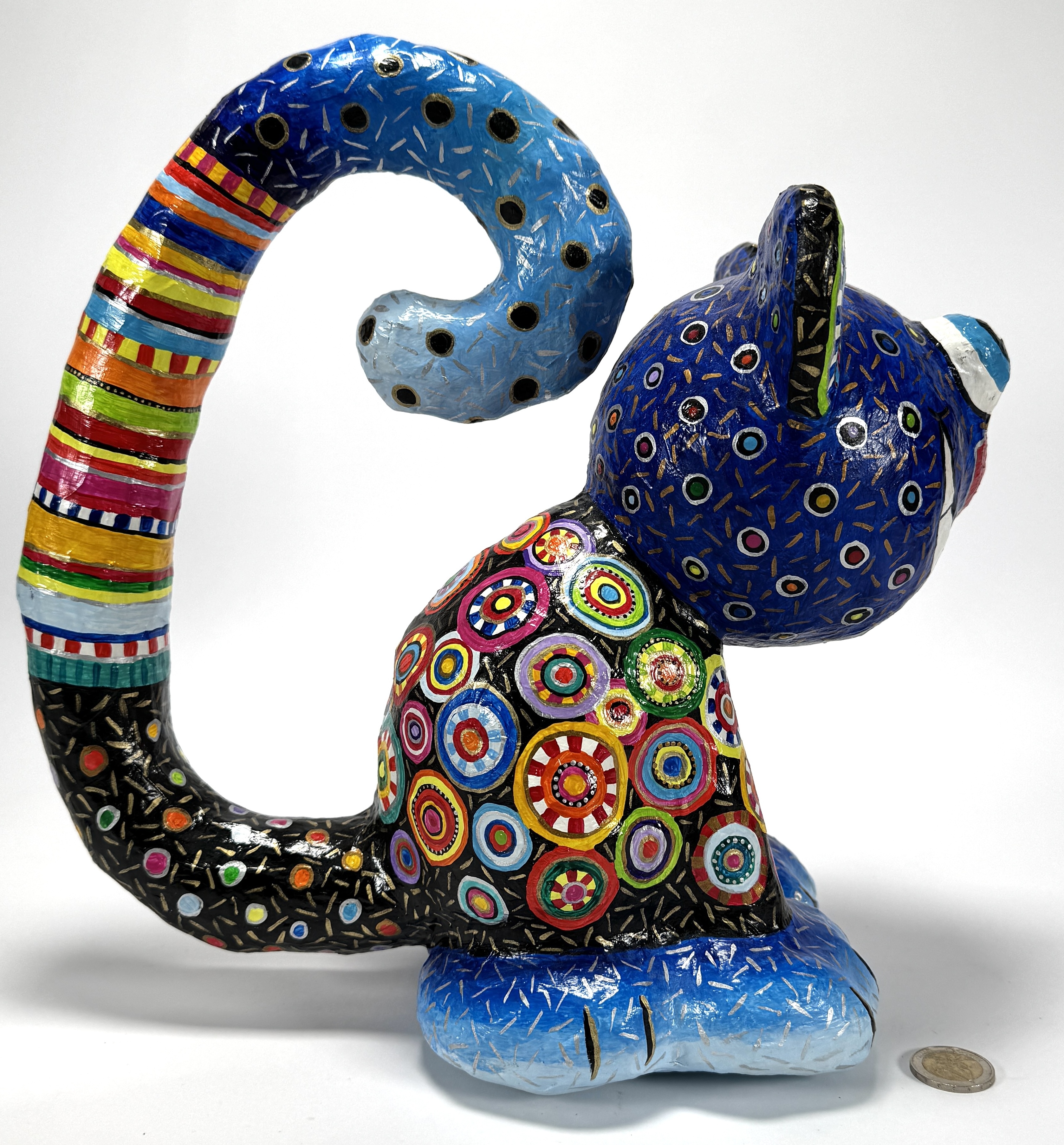 Hedendaags beeld van een kat, vervaardigd uit papier-maché en met de hand beschilderd. Het beeld is gesigneerd met SI '12' (2012). Kenmerkend is de expressieve, popartachtige stijl met een overdadige decoratie van meerkleurige, concentrische cirkels op een zwarte en blauwe ondergrond. Het beeld toont een zittende kat met een lachende uitdrukking en een gebogen gestreepte staart. Eerst de kat zien voordat je biedt? Bezoek onze kijkdagen op 28, 29 en 30 november van 11:00 tot 17:00 uur! |