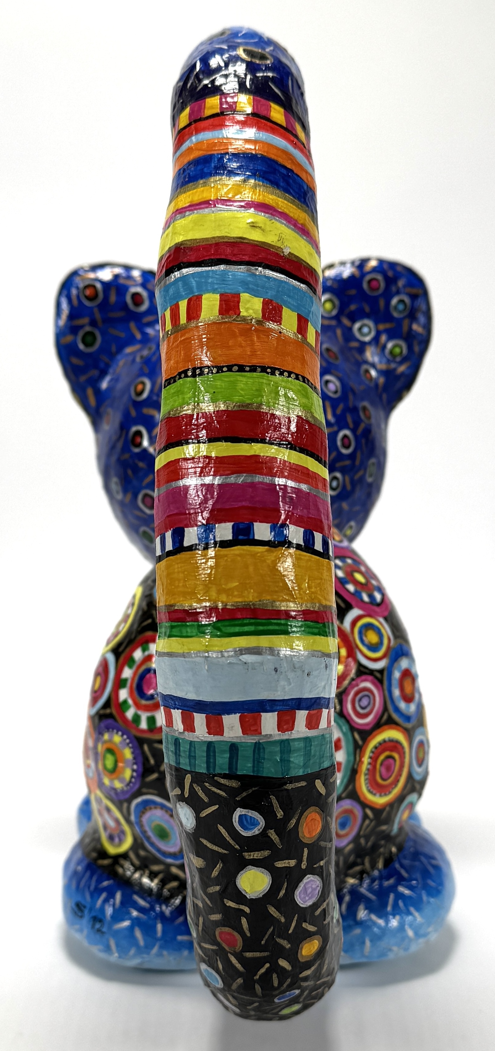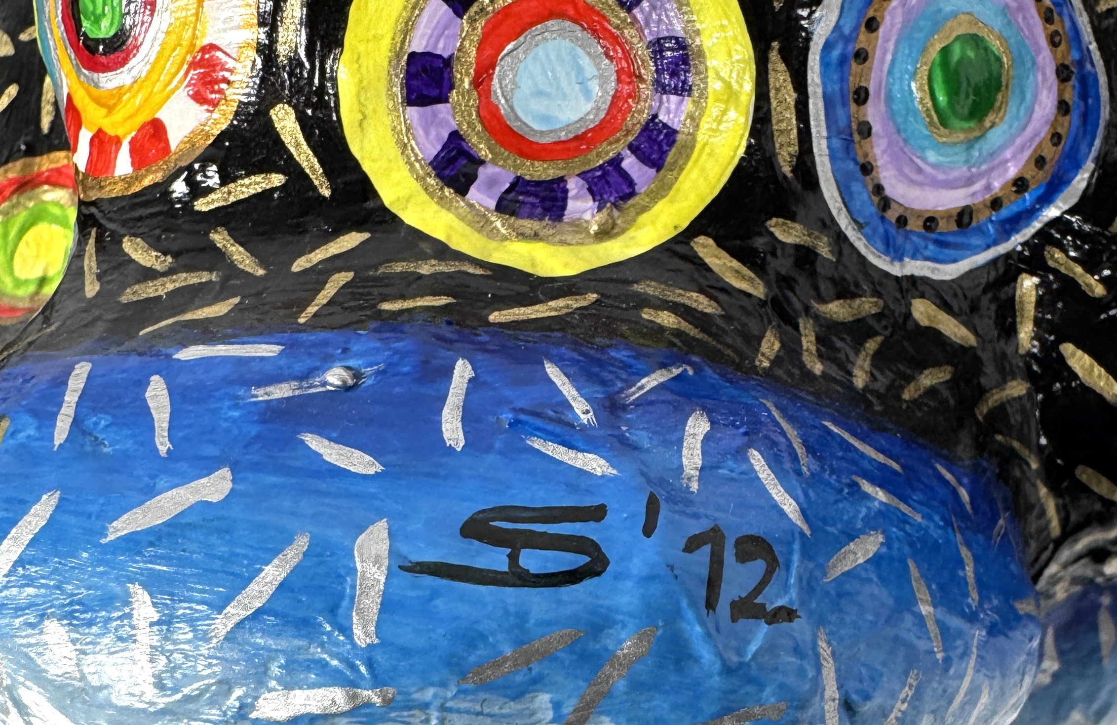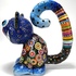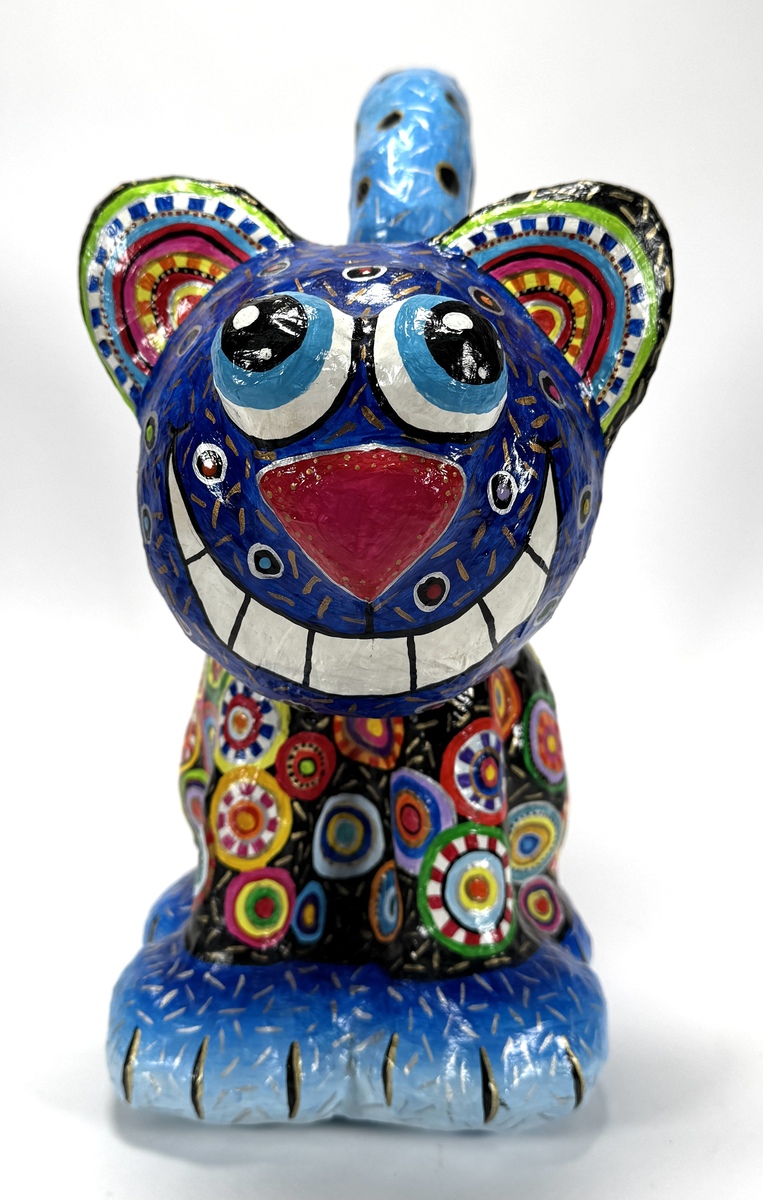 Hedendaags beeld van een kat, vervaardigd uit papier-maché en met de hand beschilderd. Het beeld is gesigneerd met SI '12' (2012). Kenmerkend is de expressieve, popartachtige stijl met een overdadige decoratie van meerkleurige, concentrische cirkels op een zwarte en blauwe ondergrond. Het beeld toont een zittende kat met een lachende uitdrukking en een gebogen gestreepte staart. Eerst de kat zien voordat je biedt? Bezoek onze kijkdagen op 28, 29 en 30 november van 11:00 tot 17:00 uur! |