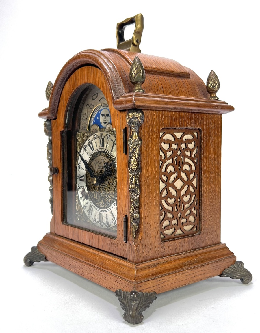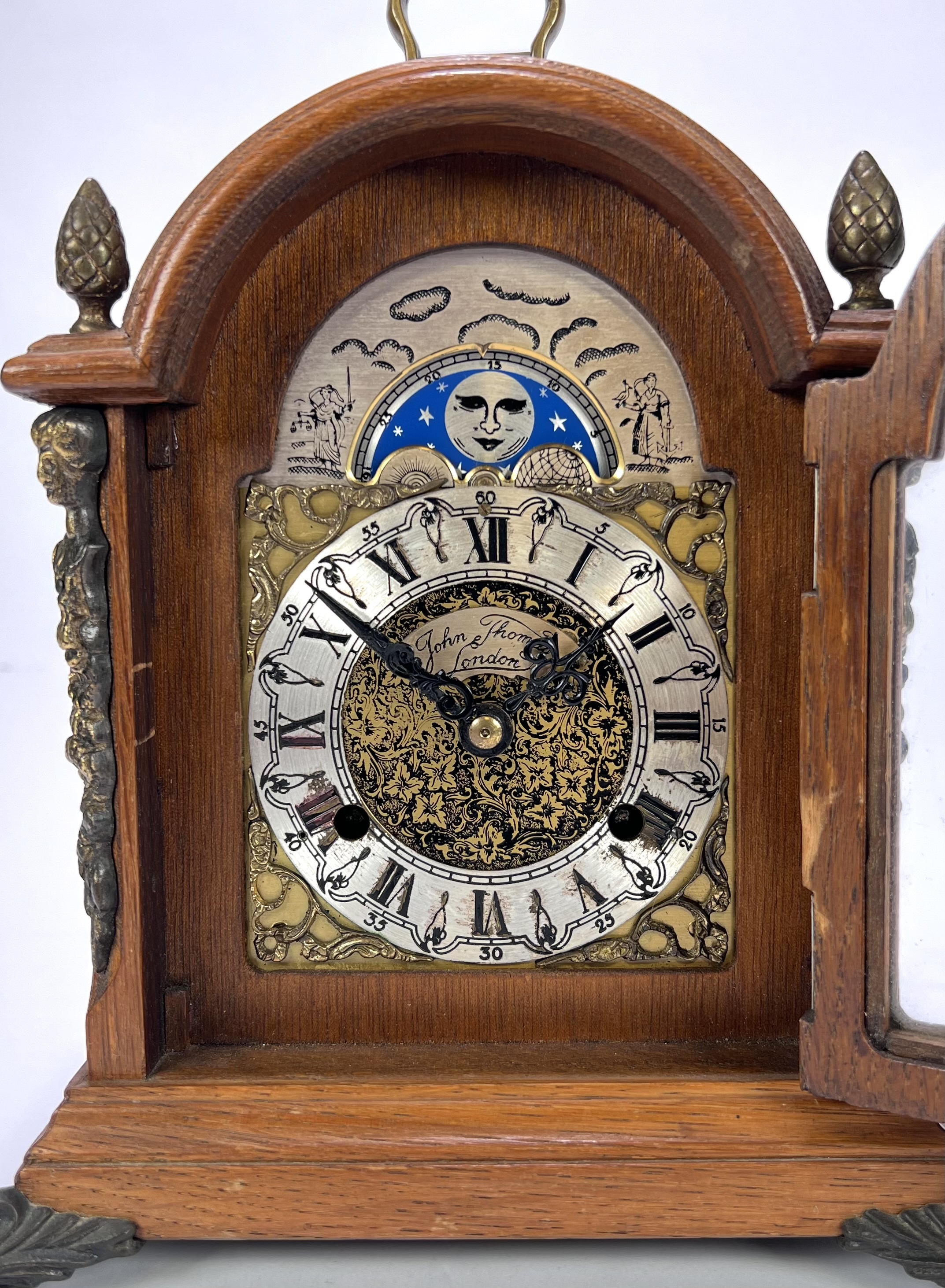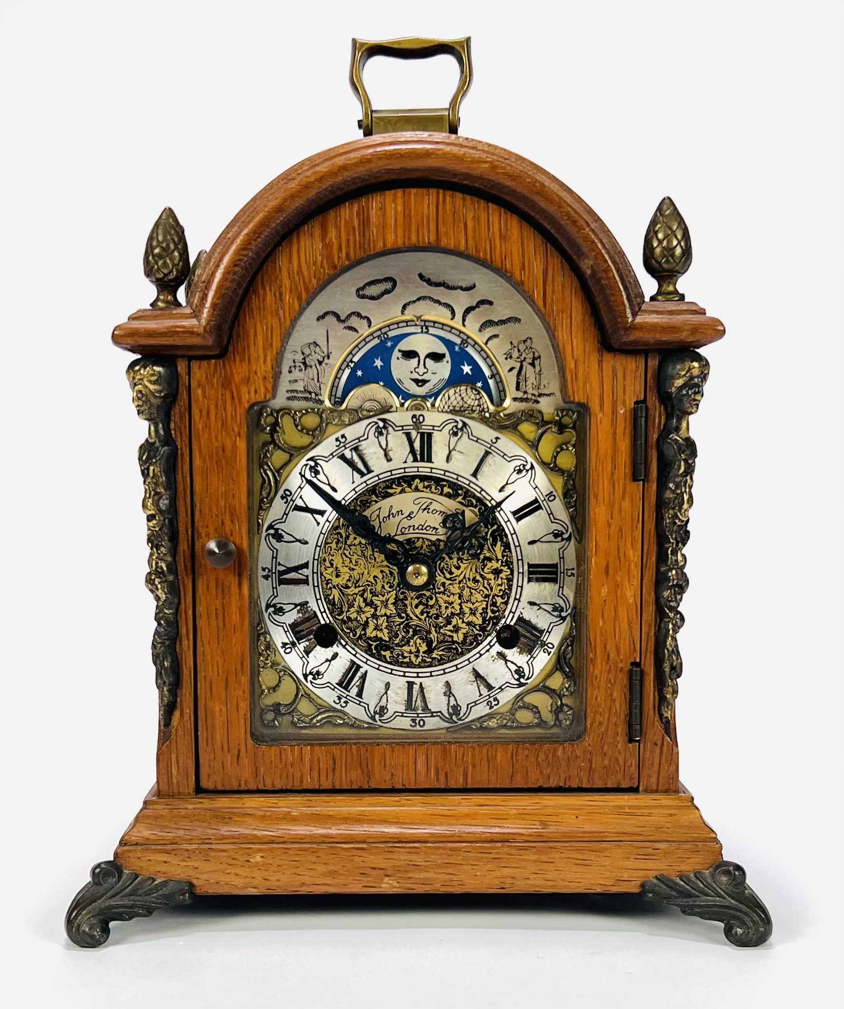 Tafelklok van eikenhout en messing met de handelsnaam 'John E. Thorn London', vervaardigd door Warmink (WUBA) in Nederland, gedateerd laatste kwart 20e eeuw. Kenmerkend is de neobarokke vormgeving met gegoten messing applicaties en een zilverkleurige wijzerplaat met florale gravures. De klok beschikt over een mechanisch slagwerk en een maanfase-aanduiding. Klaar om te bieden? Registreer je nu en doe mee aan de veiling! |