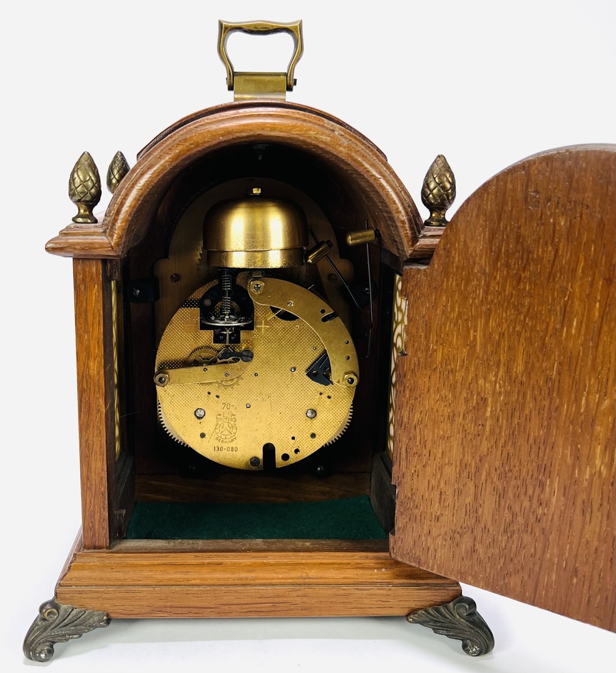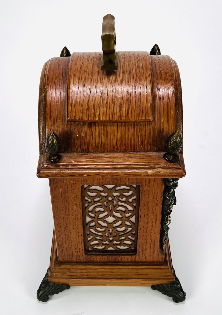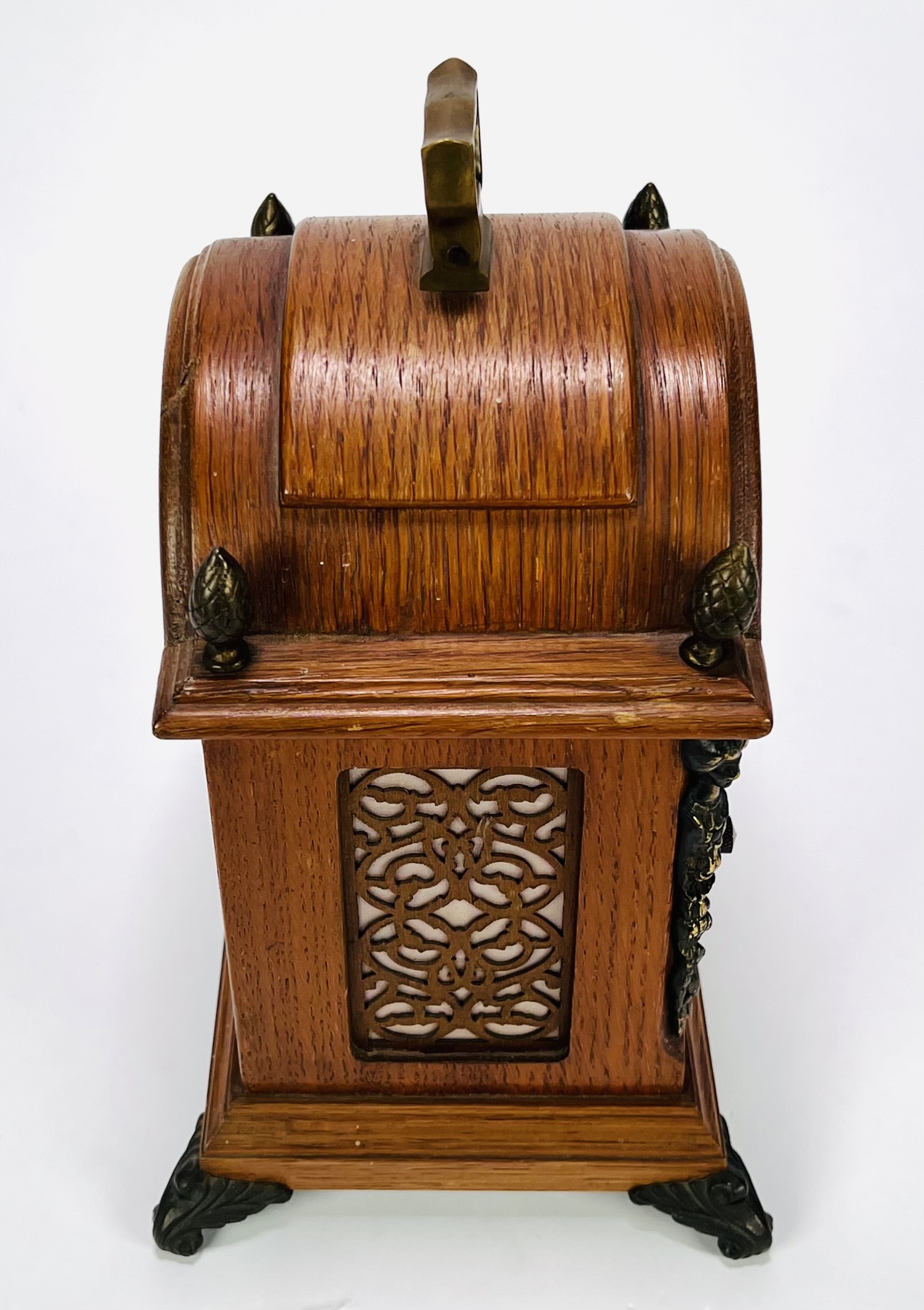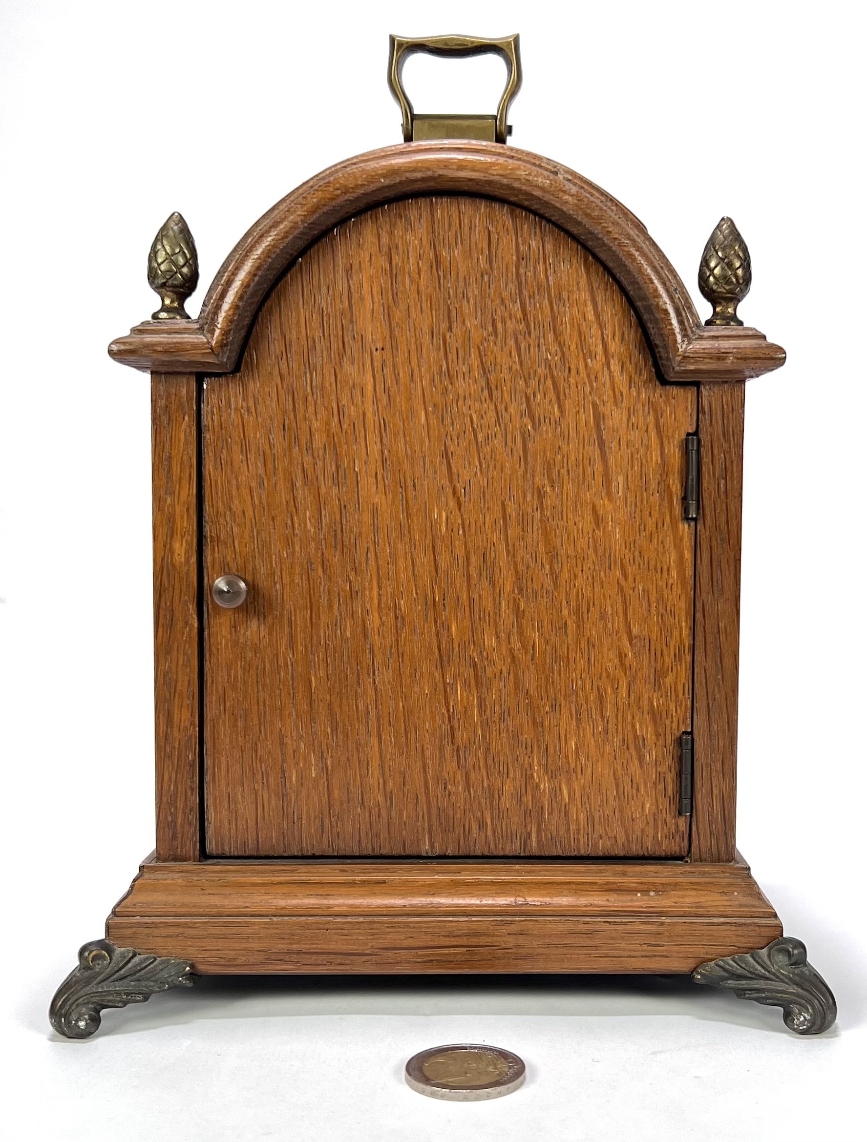 Tafelklok van eikenhout en messing met de handelsnaam 'John E. Thorn London', vervaardigd door Warmink (WUBA) in Nederland, gedateerd laatste kwart 20e eeuw. Kenmerkend is de neobarokke vormgeving met gegoten messing applicaties en een zilverkleurige wijzerplaat met florale gravures. De klok beschikt over een mechanisch slagwerk en een maanfase-aanduiding. Klaar om te bieden? Registreer je nu en doe mee aan de veiling! |