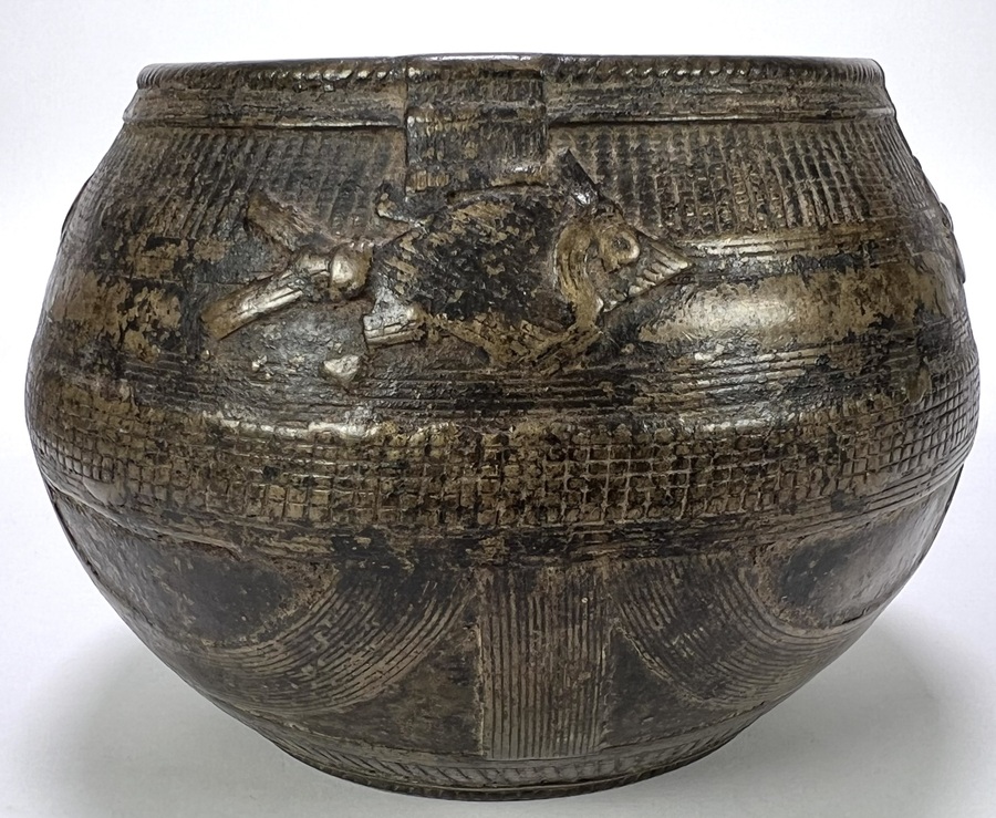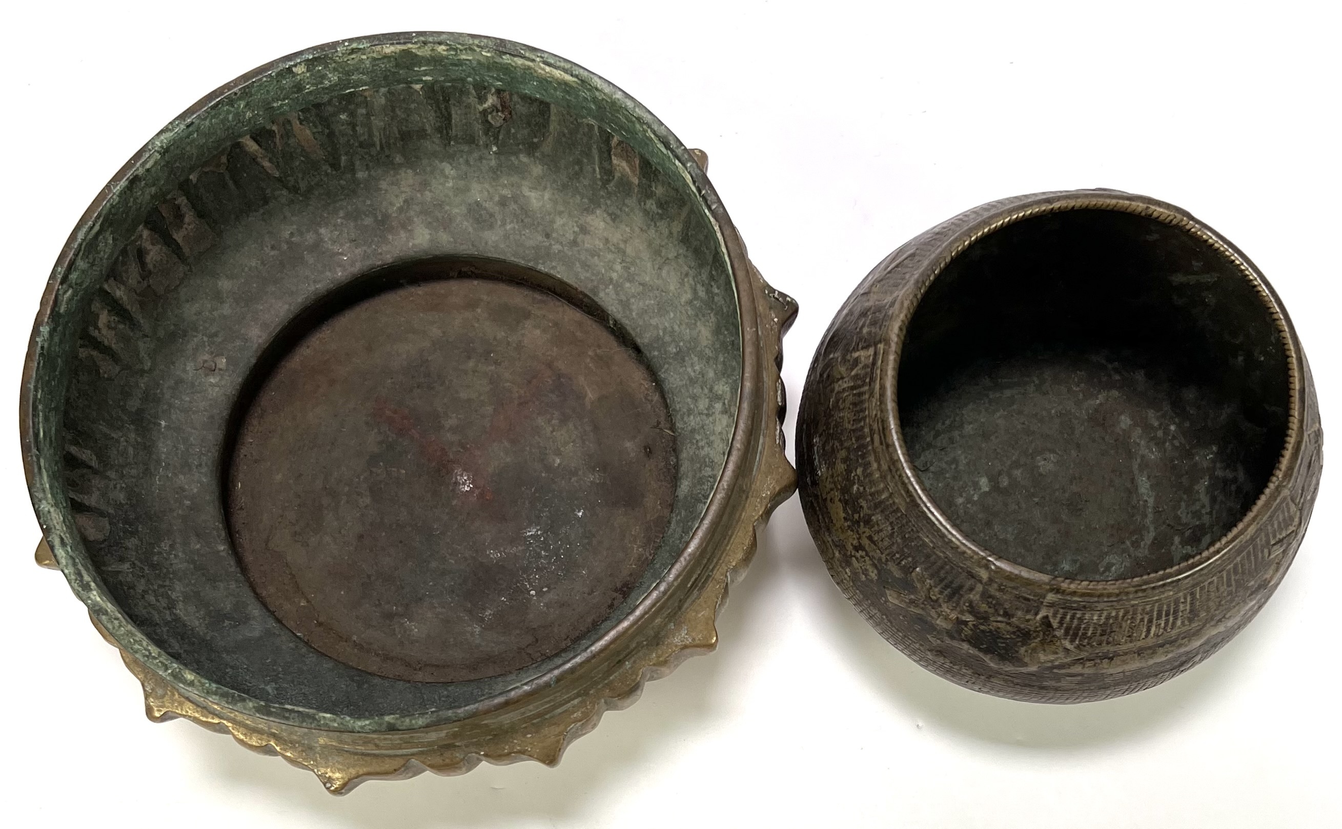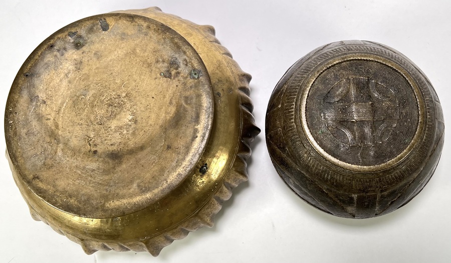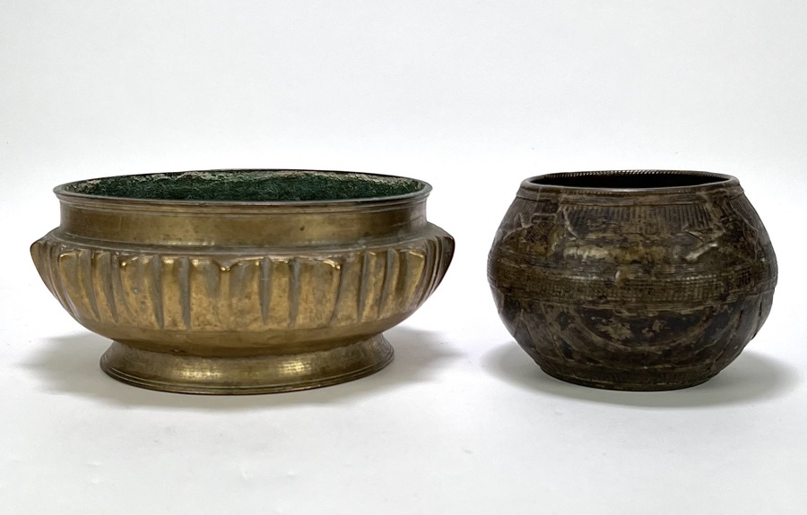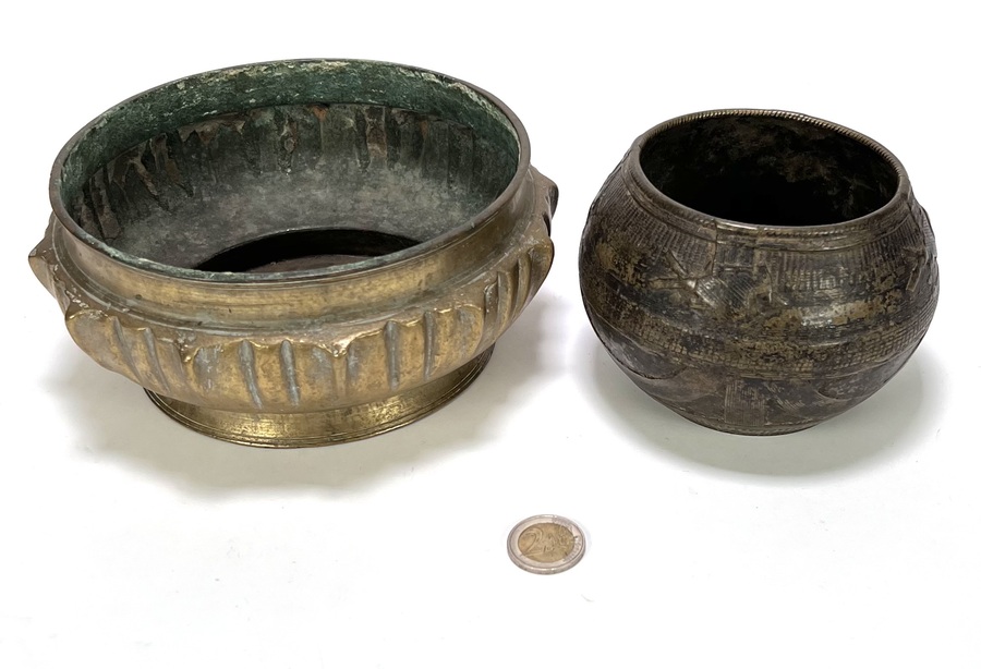 Twee kommen uit Azië, gedateerd circa 1880–1930, een kom is van messing, gedraaid en voorzien van verticale ribben en een kom is van brons, gedreven en volledig bewerkt. Dit exemplaar vertoont symboliek uit het Himalayagebied en bezit een karakteristieke donkere patina aan de buitenzijde. Wil je direct deelnemen? Plaats vanaf 21 november alvast een schriftelijk bod via onze website! |