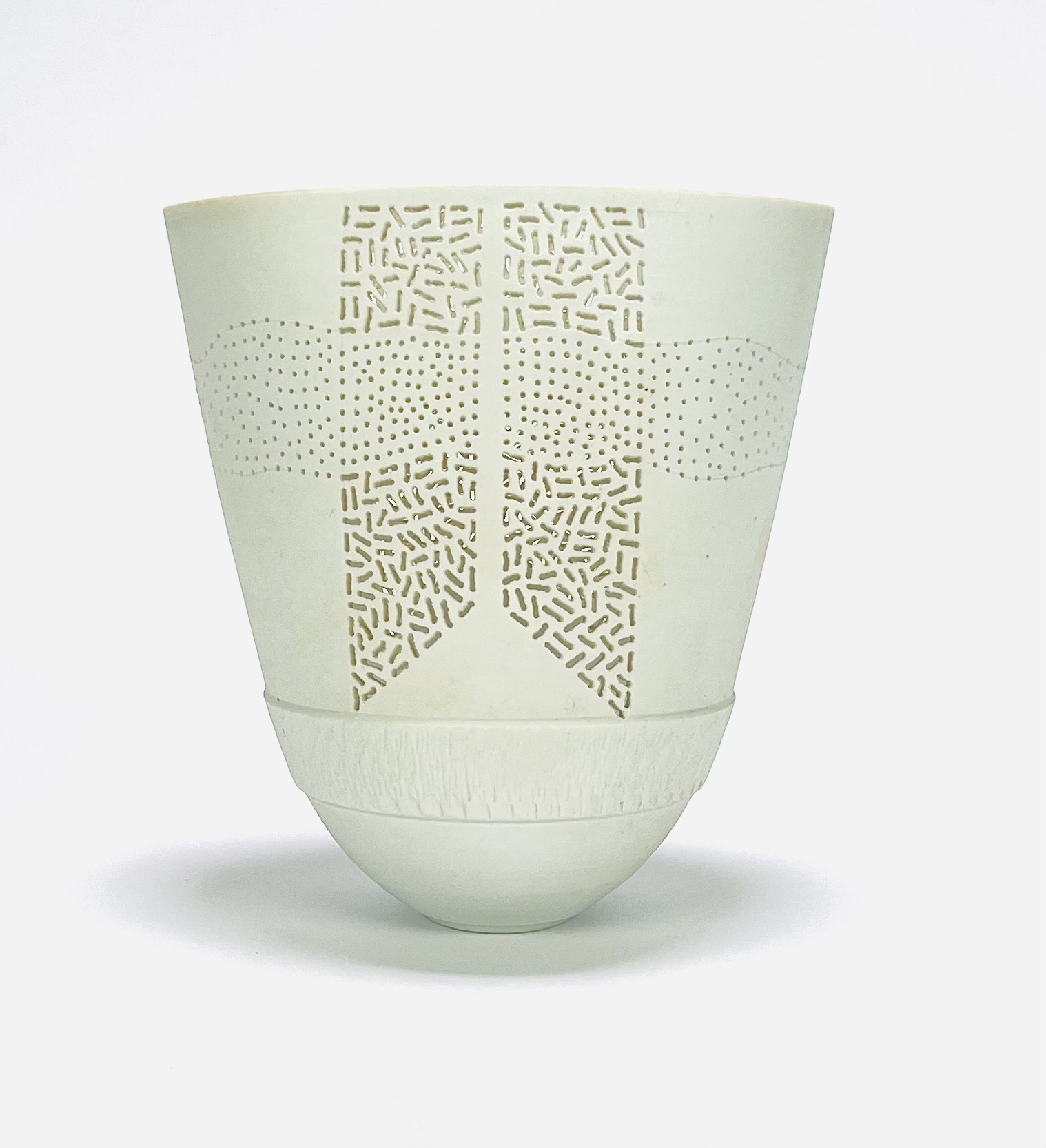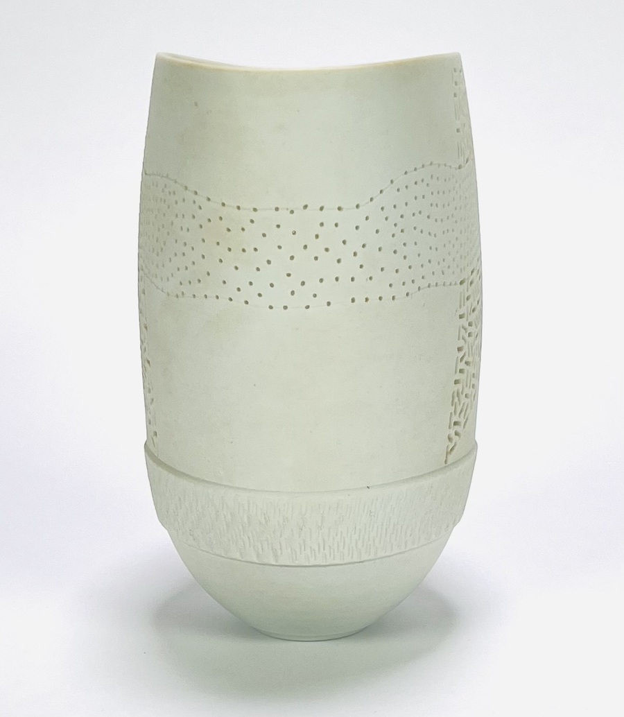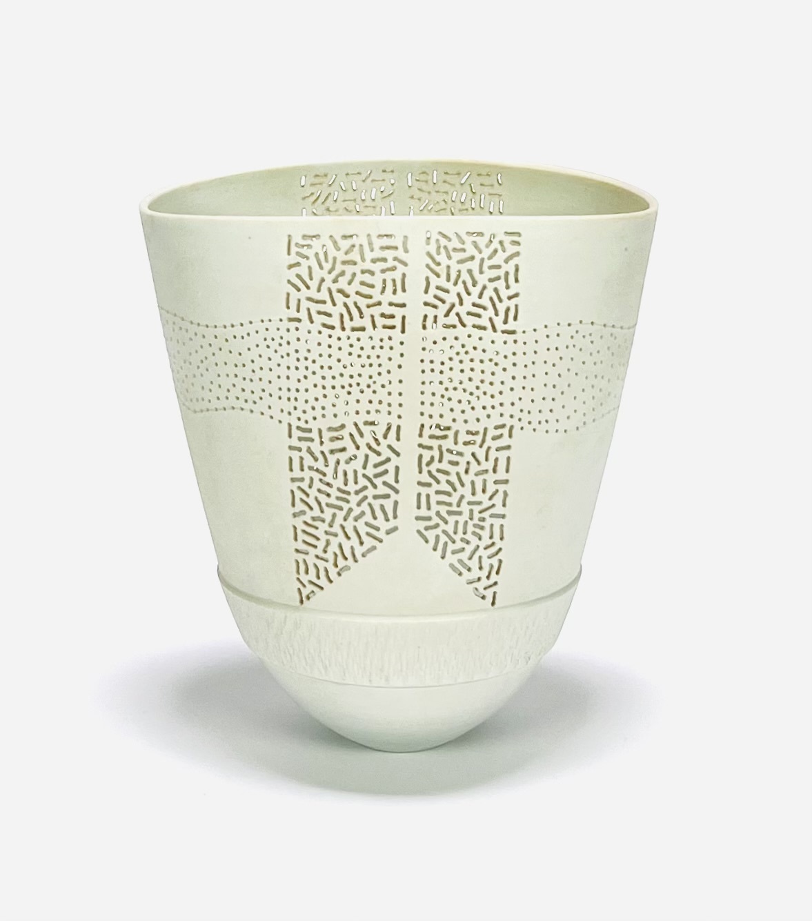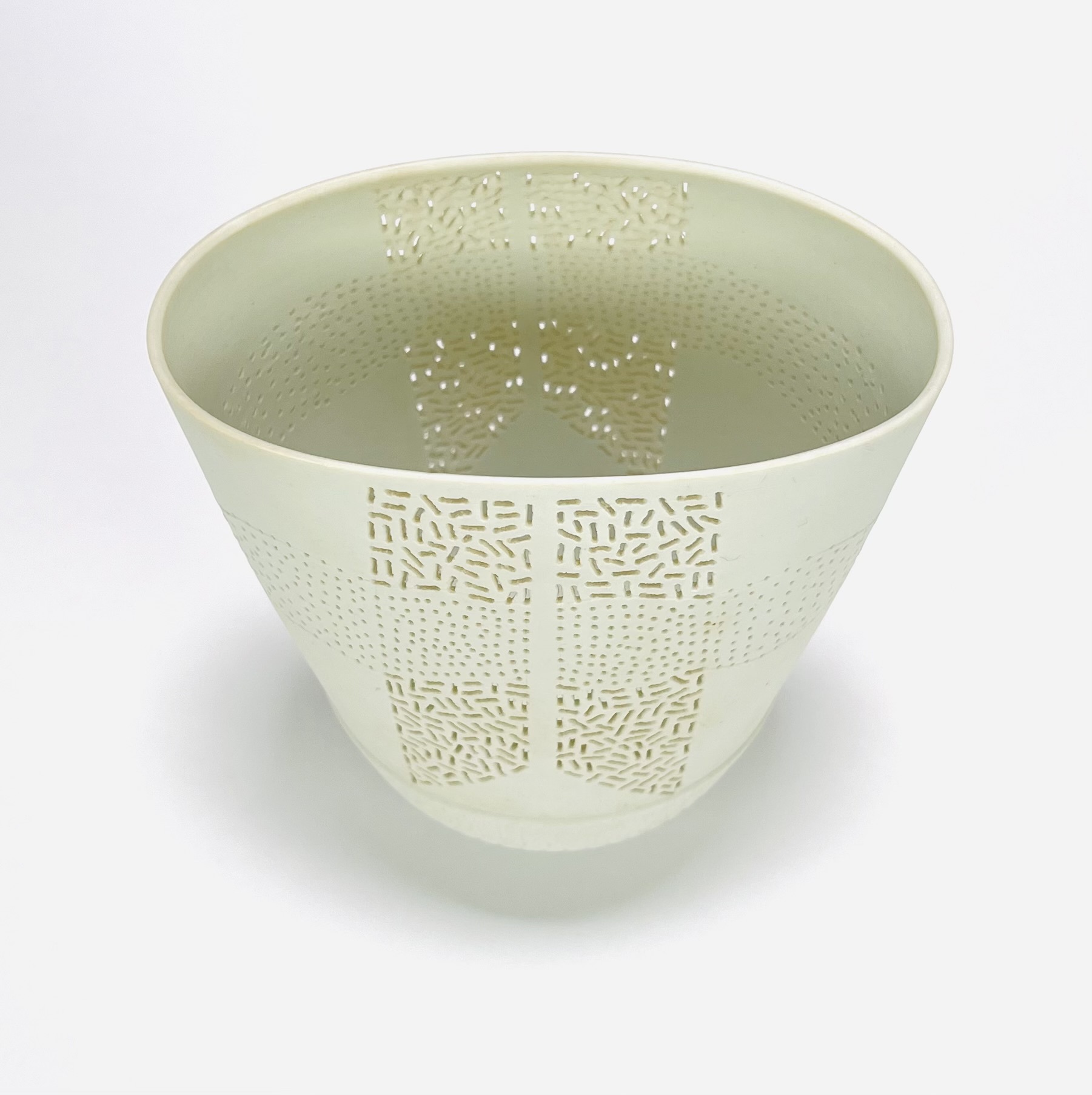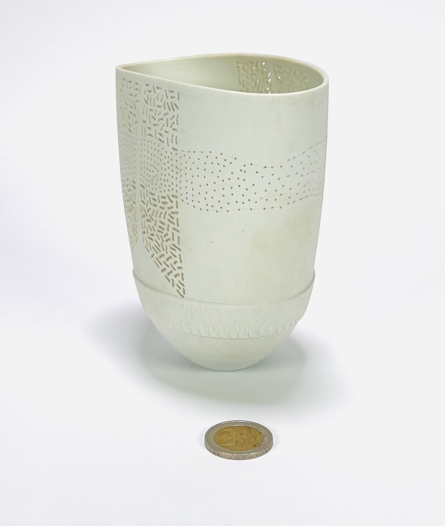 Keramische vaas vervaardigd uit wit porselein door de Duitse keramist Horst Göbbels (1936). De vaas is handgedraaid met een bolvormige basis en taps toelopende kegel, in een minimalistische stijl. Kenmerkend is de ajourtechniek met fijne perforaties in geometrische patronen. Het gesigneerde werk is van Duitse herkomst en dateert uit de periode ca. 1980–2000. Registreer nu en bied eenvoudig online mee op de vaas! |