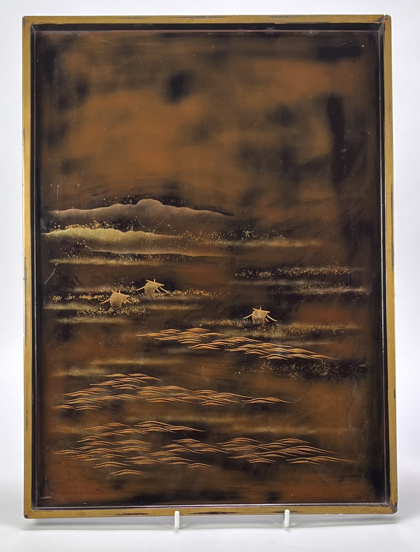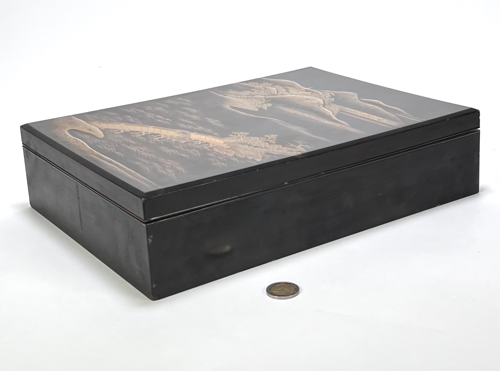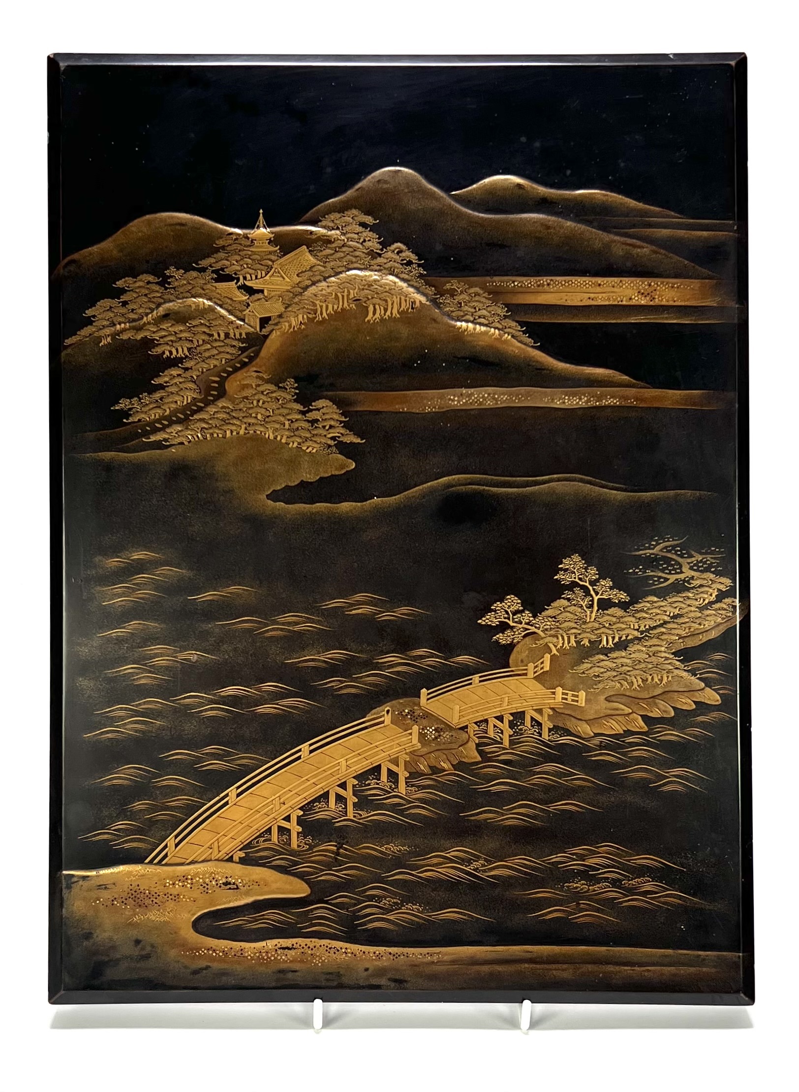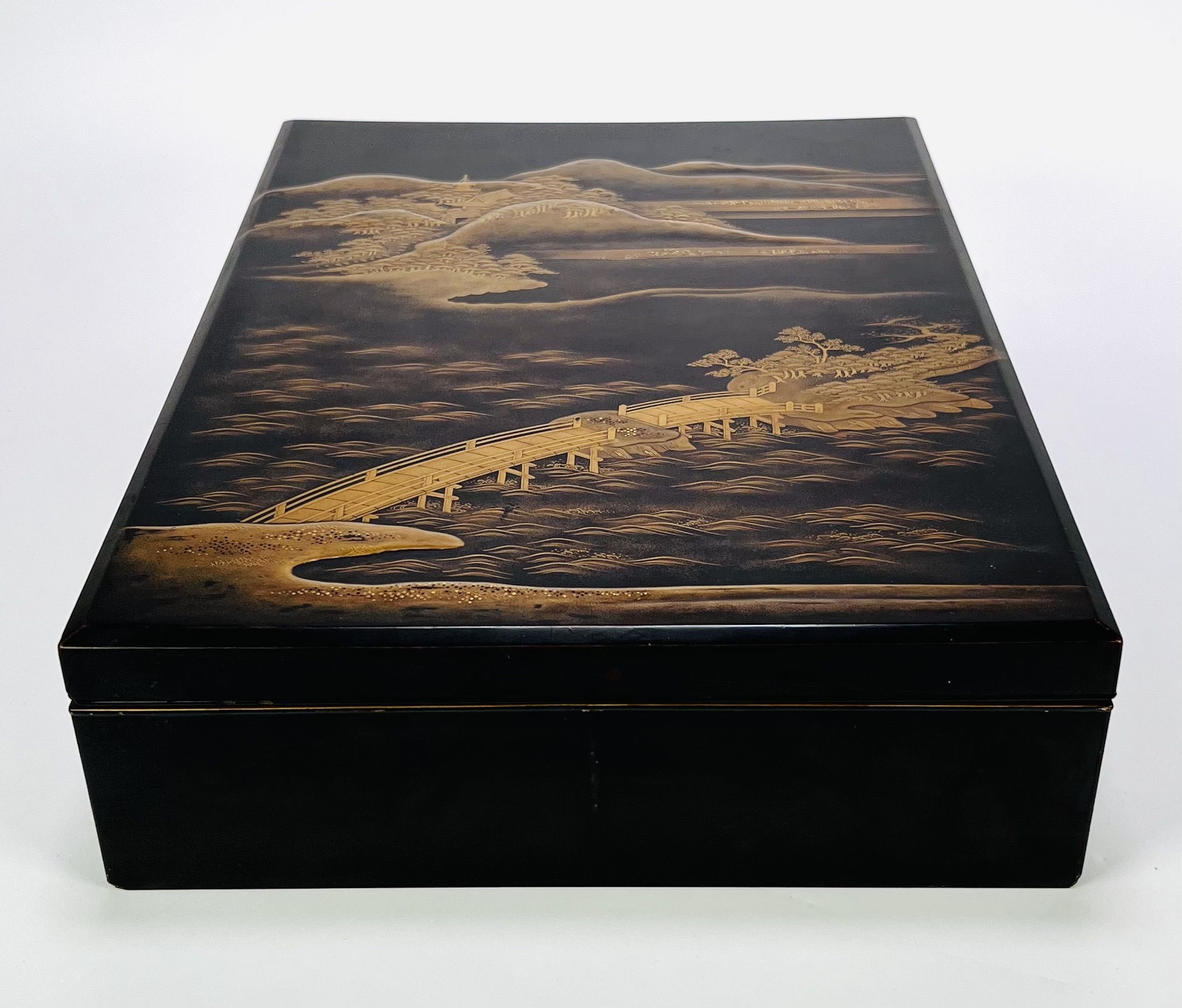 Lakwerkdoos uit Japan, vervaardigd uit hout met zwarte urushi-lak en goudkleurige maki-e-decoratie. Te zien is een traditioneel Japans landschap met brug, rivier, heuvels en pagode. De decoratie is in fijne maki-e-techniek (gestrooid goudpoeder) uitgevoerd. Datering tweede helft 19e eeuw, Meiji-periode. Geïnteresseerd? Bezoek onze kijkdagen op 28, 29 of 30 november van 11:00 tot 17:00 uur! |