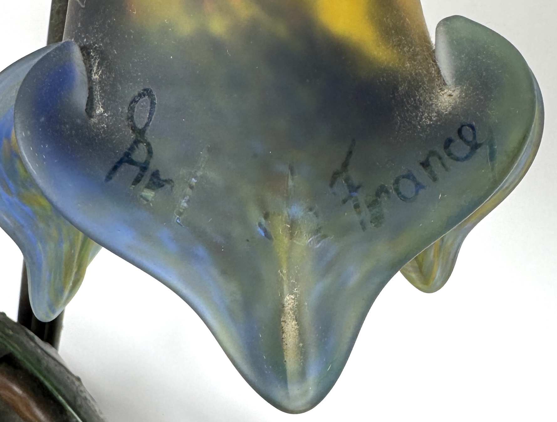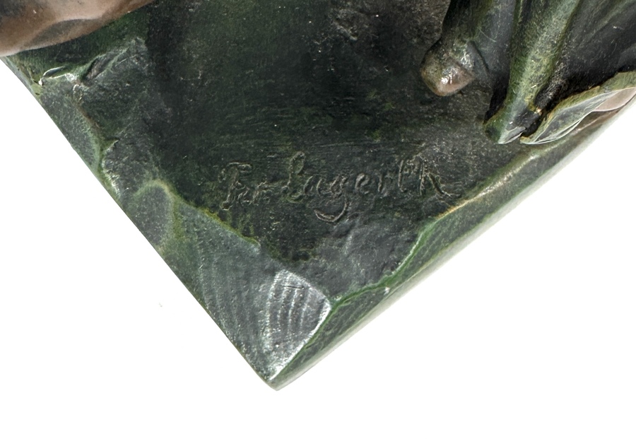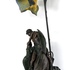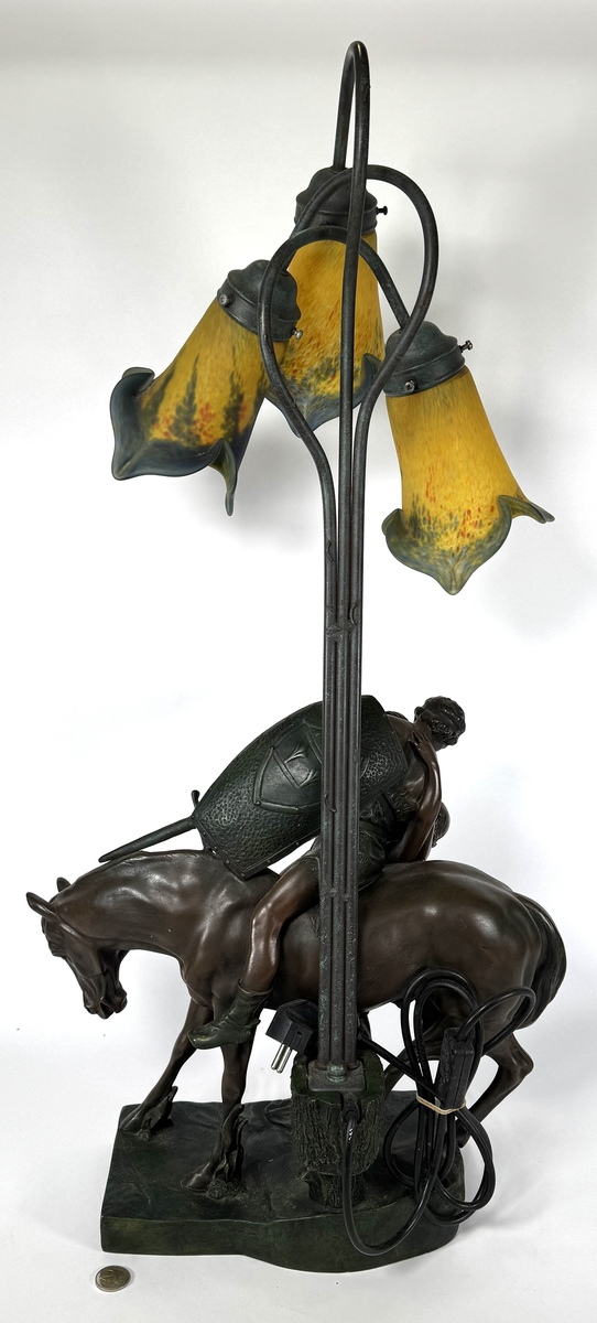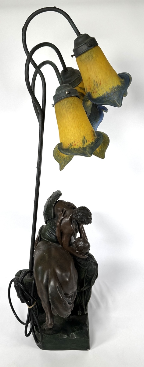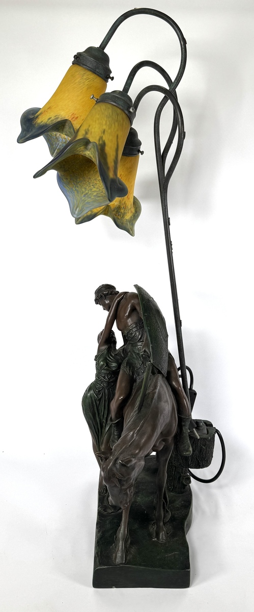 Franse bronskleurig gepatineerde polystone lamp in Art Nouveau stijl, met voet naar het beeld “Siegfried en Brünhild” van Ferdinand Lügerth. Voorzien van drie pâte-de-verre bloemvormige kappen gemerkt “Art de France”. Decoratieve uitvoering met expressieve figuratieve voorstelling, Frankrijk, 20e eeuw. Kom langs tijdens de kijkdagen (28 t/m 30 november) en ontdek deze lamp zelf! |