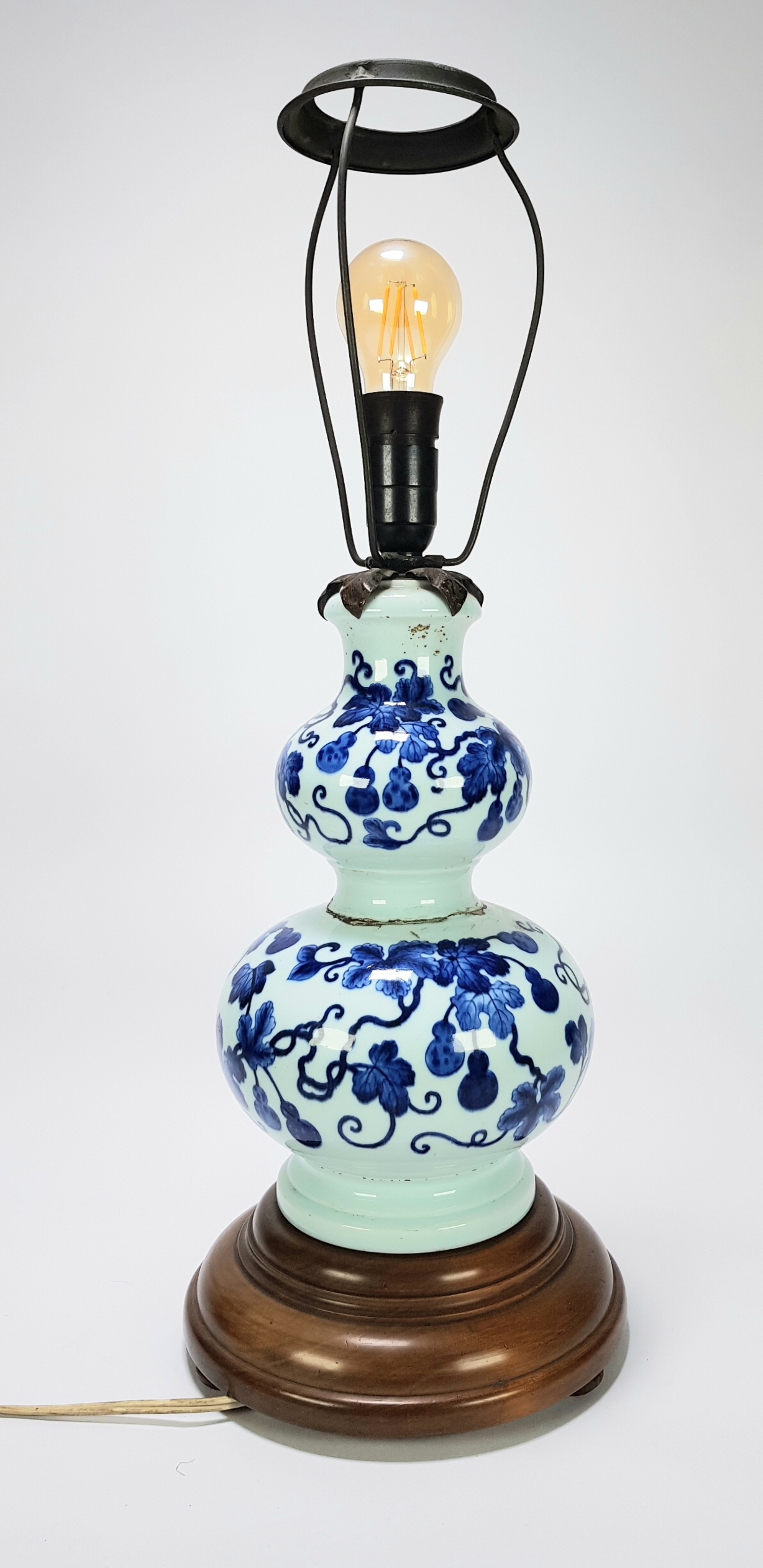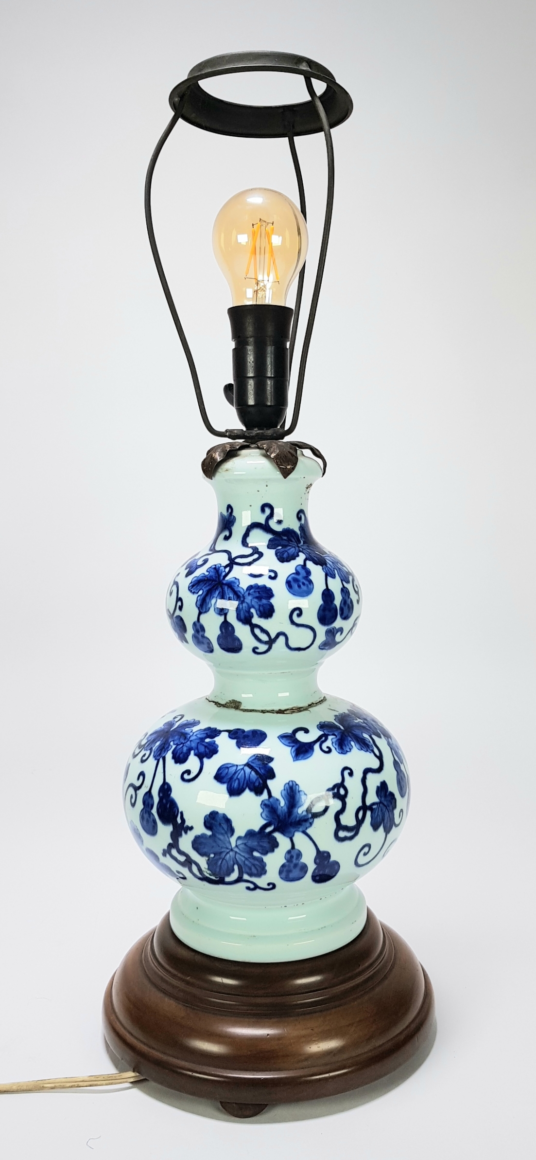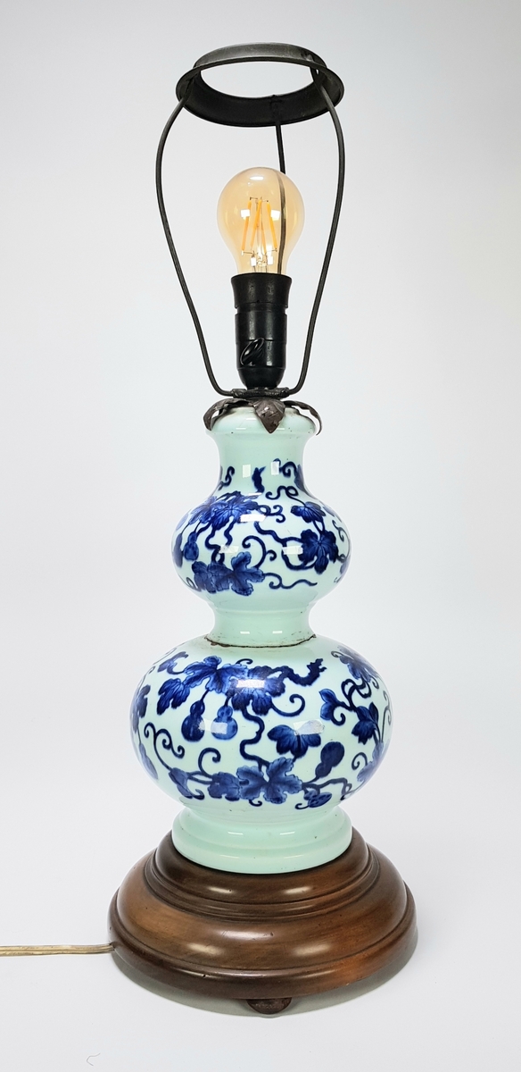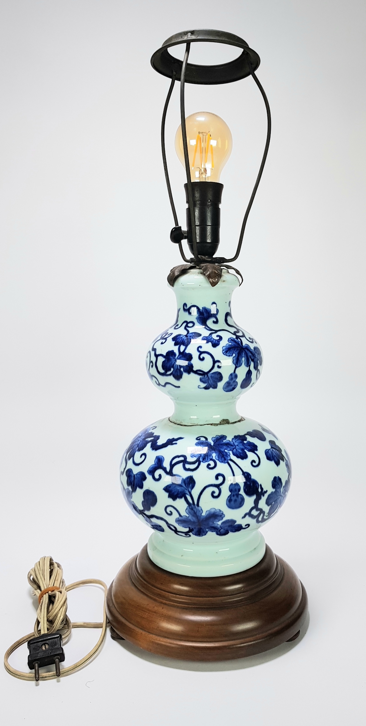 Tafelamp samengesteld uit een Chinese porseleinen flesvaas, beschilderd in blauw op wit met rankende wijnranken en kalebassen. De vaas is gemonteerd in een houten voet en voorzien van metalen armatuur met fitting. Uitgevoerd in traditionele Qing-dynastie stijl, vervaardigd in China, midden 20e eeuw. Geïnteresseerd? Bezoek onze kijkdagen op 28, 29 of 30 november van 11:00 tot 17:00 uur! |
