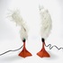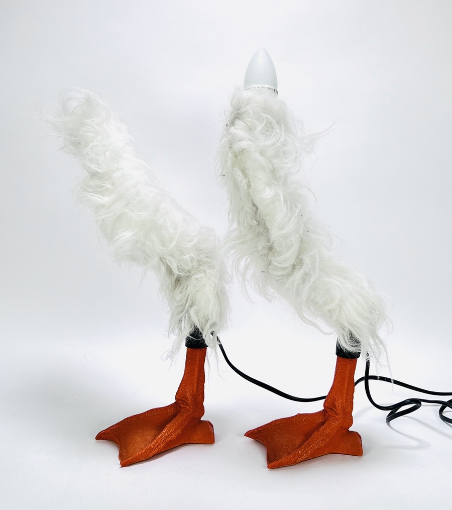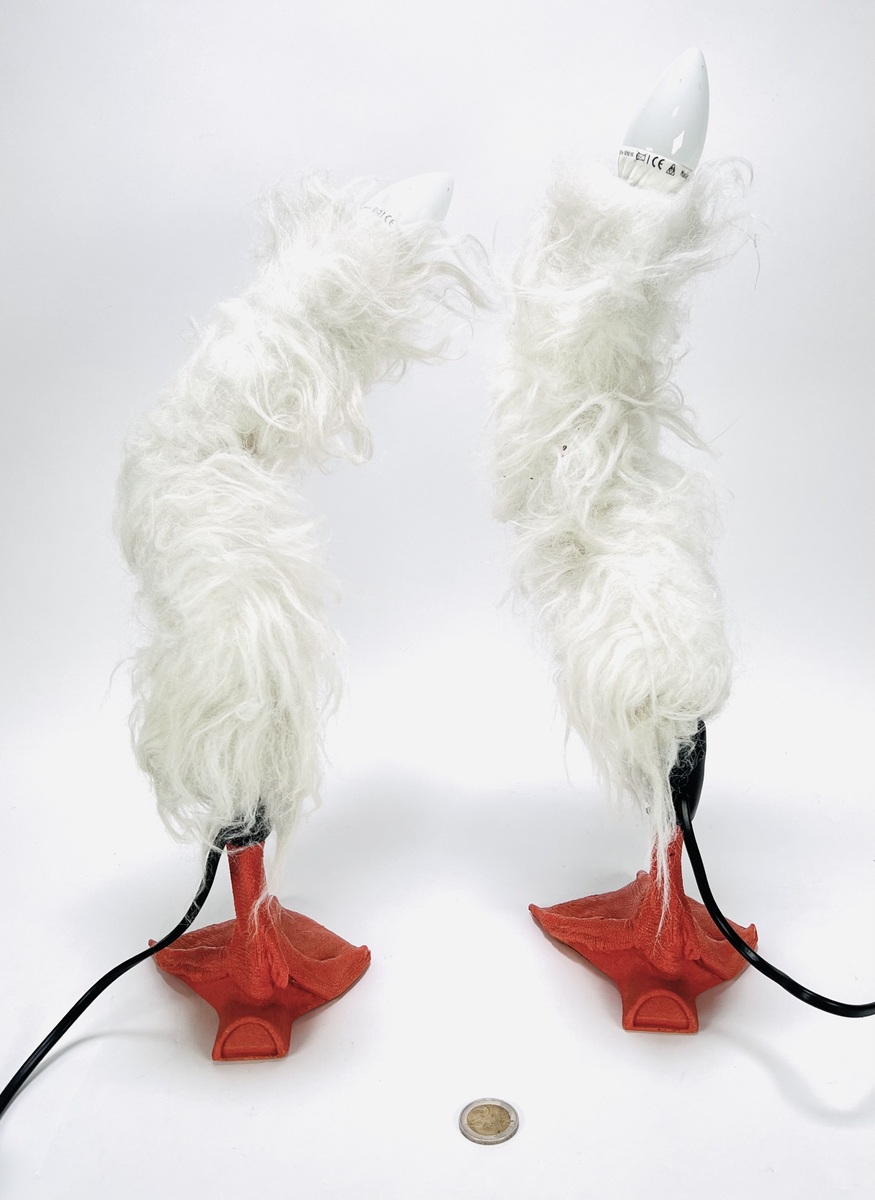 Stel van twee satirische tafellampen (popart Duck lamp), uitgevoerd in een postmoderne designstijl uit eind 20e eeuw. De lampen zijn vervaardigd uit gegoten kunststof en lange witte textielvezels. Het ontwerp toont een ironische weergave van ganzenpoten met een oranje basis en een pluizige schacht. Klaar om te bieden? Registreer je nu en doe mee aan de veiling! |