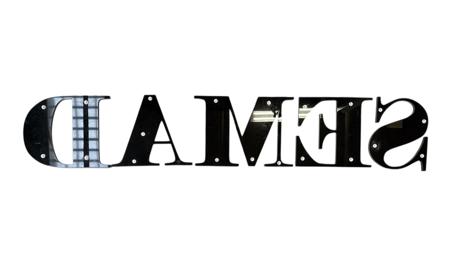 Vijf design gevelreclame letters die het woord "DAMES" vormen, gemaakt van roestvrij staal en kunststof, circa 2000–2025. De moderne letters zijn uitgevoerd in een strak sans-serif lettertype. Deze letters dienden als driedimensionale winkelreclame. Kom langs tijdens de kijkdagen (28 t/m 30 november) en ontdek deze gevelreclame letters zelf! |