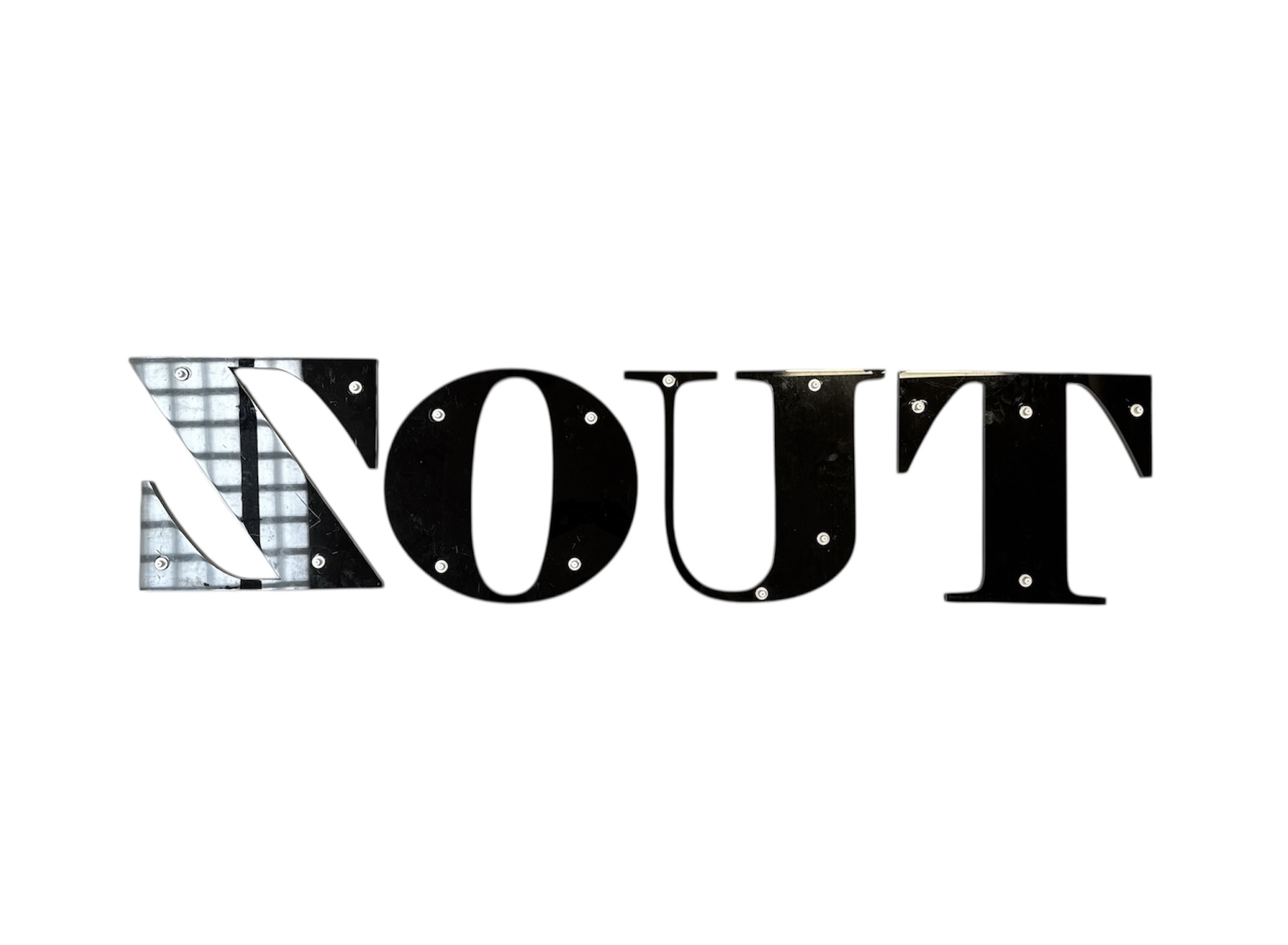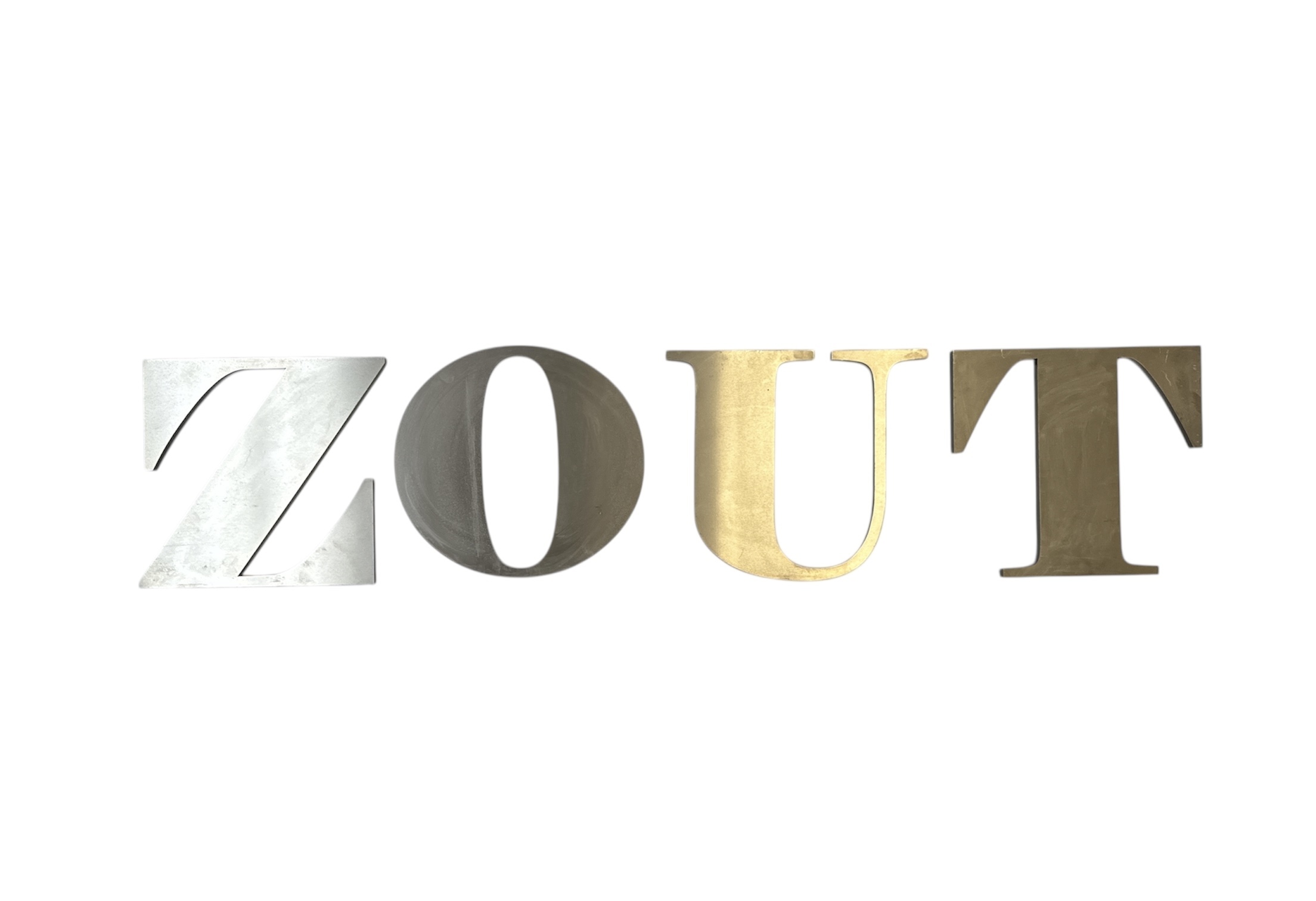 Vier design gevelreclame letters die het woord "ZOUT" vormen, gemaakt van roestvrij staal en kunststof, circa 2000–2025. De moderne letters zijn uitgevoerd in een strak sans-serif lettertype. Dit letters diende als driedimensionale winkelreclame. Kom langs tijdens de kijkdagen (28 t/m 30 november) en ontdek deze gevelreclame letters zelf! |