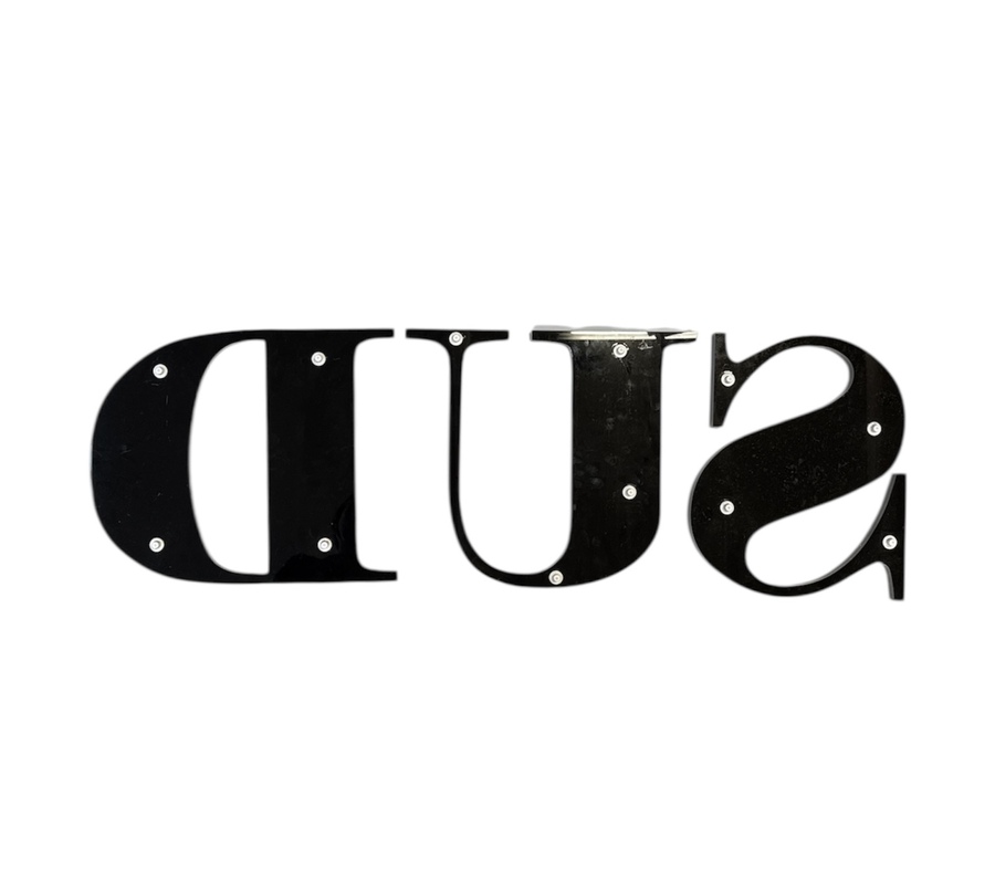 Drie design gevelreclame letters die het woord "DUS" vormen, gemaakt van roestvrij staal en kunststof, circa 2000–2025. De moderne letters zijn uitgevoerd in een strak sans-serif lettertype. Deze letters dienden als driedimensionale winkelreclame. Kom langs tijdens de kijkdagen (28 t/m 30 november) en ontdek deze gevelreclame letters zelf! |