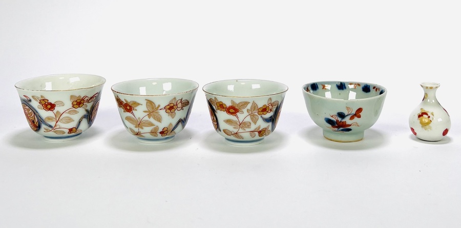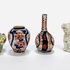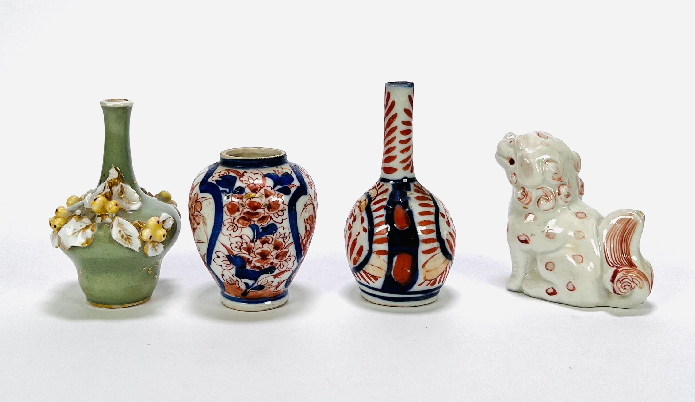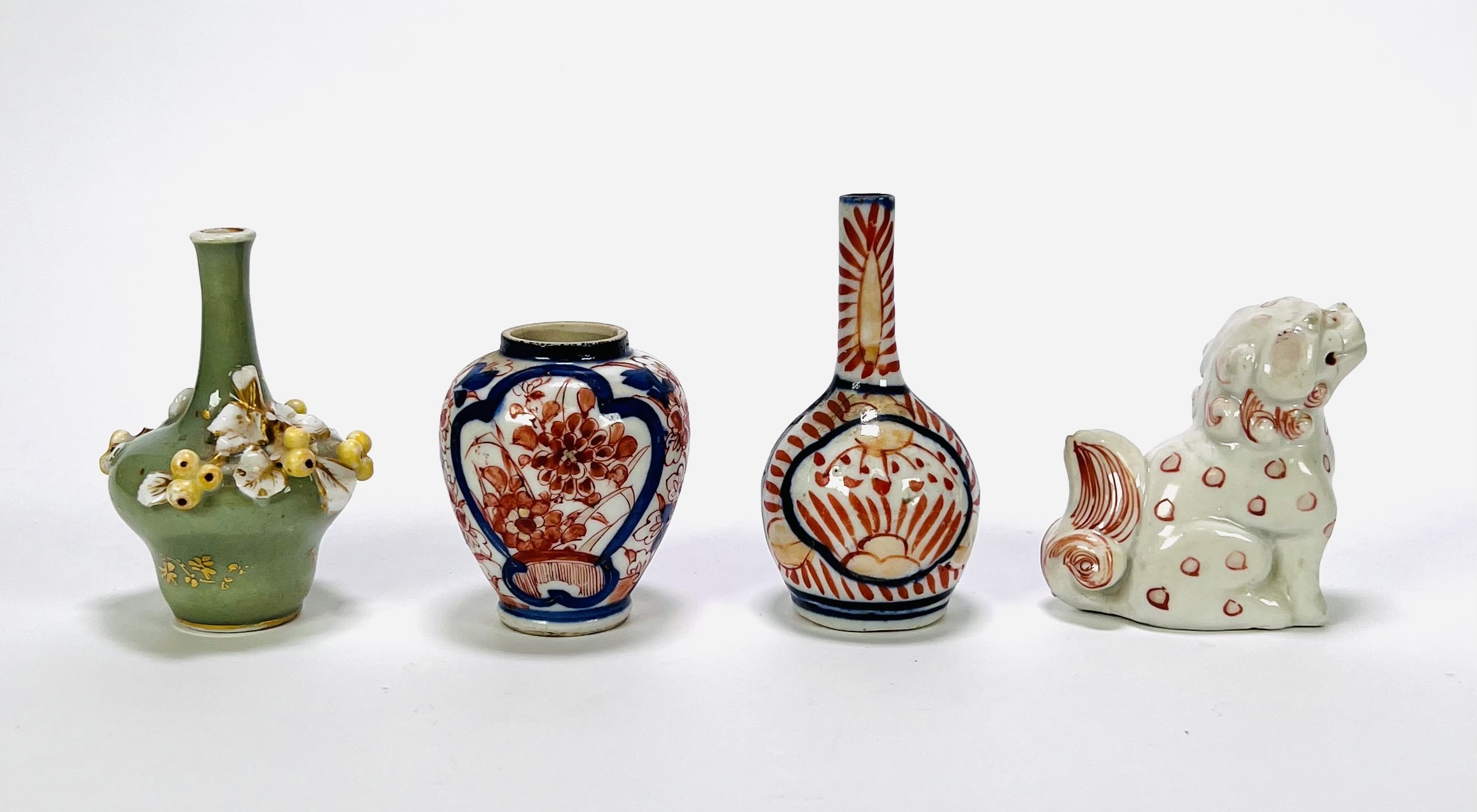 Collectie van keramiek uit de Aziatische exporthandel, daterend uit circa 19e/20e eeuw. Het lot omvat vier kleine porseleinen vazen, een gegoten Fu-hond en diverse handbeschilderde schaaltjes/kommen. De voorwerpen vertonen polychrome decoraties in kobaltblauw, roestbruin en goud, Kom langs tijdens de kijkdagen (28 t/m 30 november) en ontdek dit object zelf! |