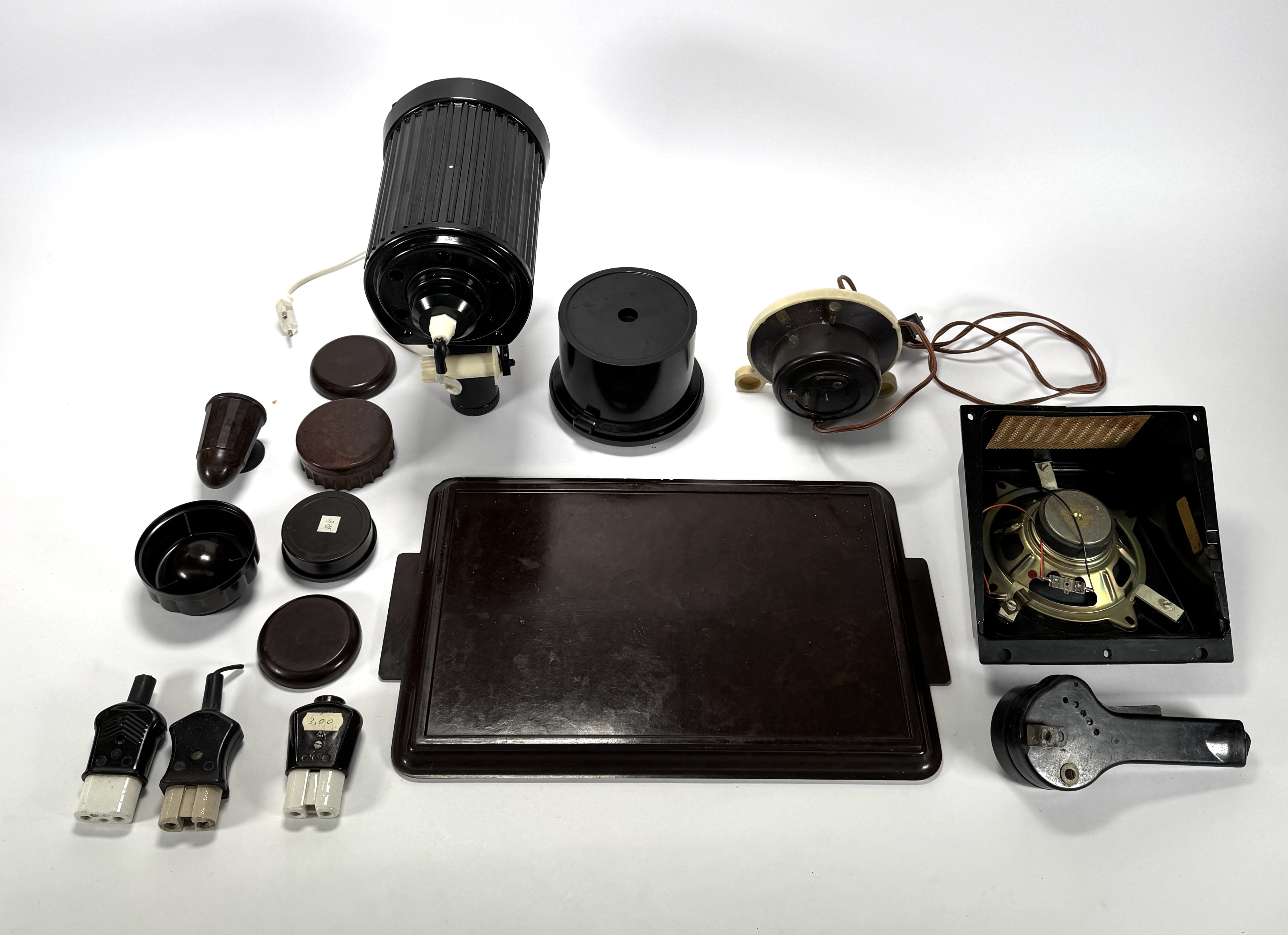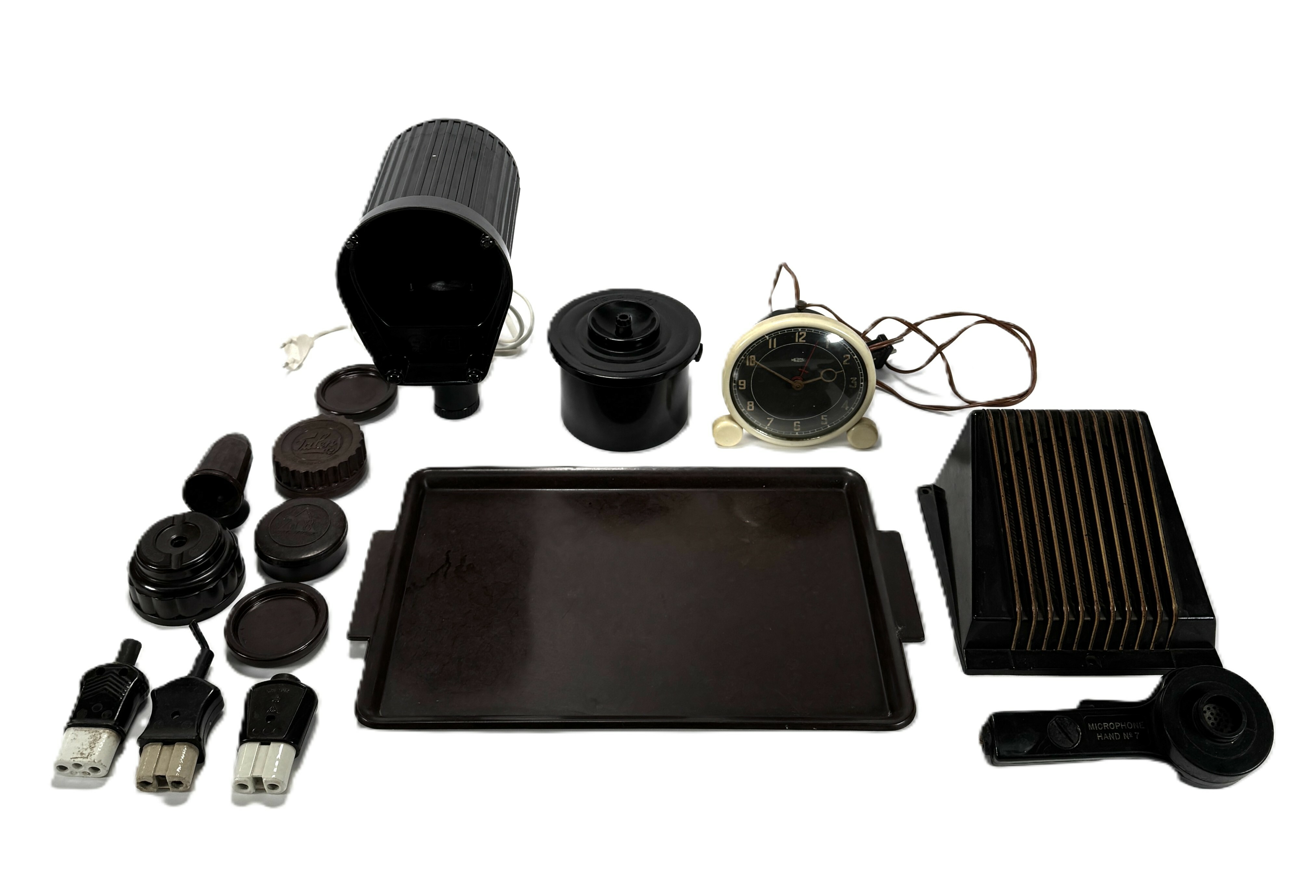 Collectie van bakelieten objecten uit de periode 1930–1960, bestaande uit onder andere elektrische onderdelen, een klok, schakelaars en behuizingen, vervaardigd uit bakeliet met metalen componenten. Je bent welkom op onze kijkdagen op 28, 29 en 30 november! |