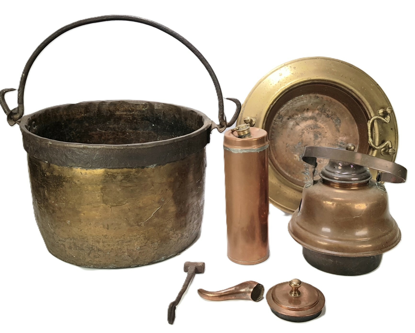 Lot van koperen en messing huishoudelijke voorwerpen uit de periode ca. 1850–1925. Het omvat onder andere een messing aker met ijzeren beugel, een koperen theepot, een messing schotel en koperen kruik. Kom langs tijdens de kijkdagen (28 t/m 30 november) en ontdek dit lot koper en messing zelf! |