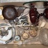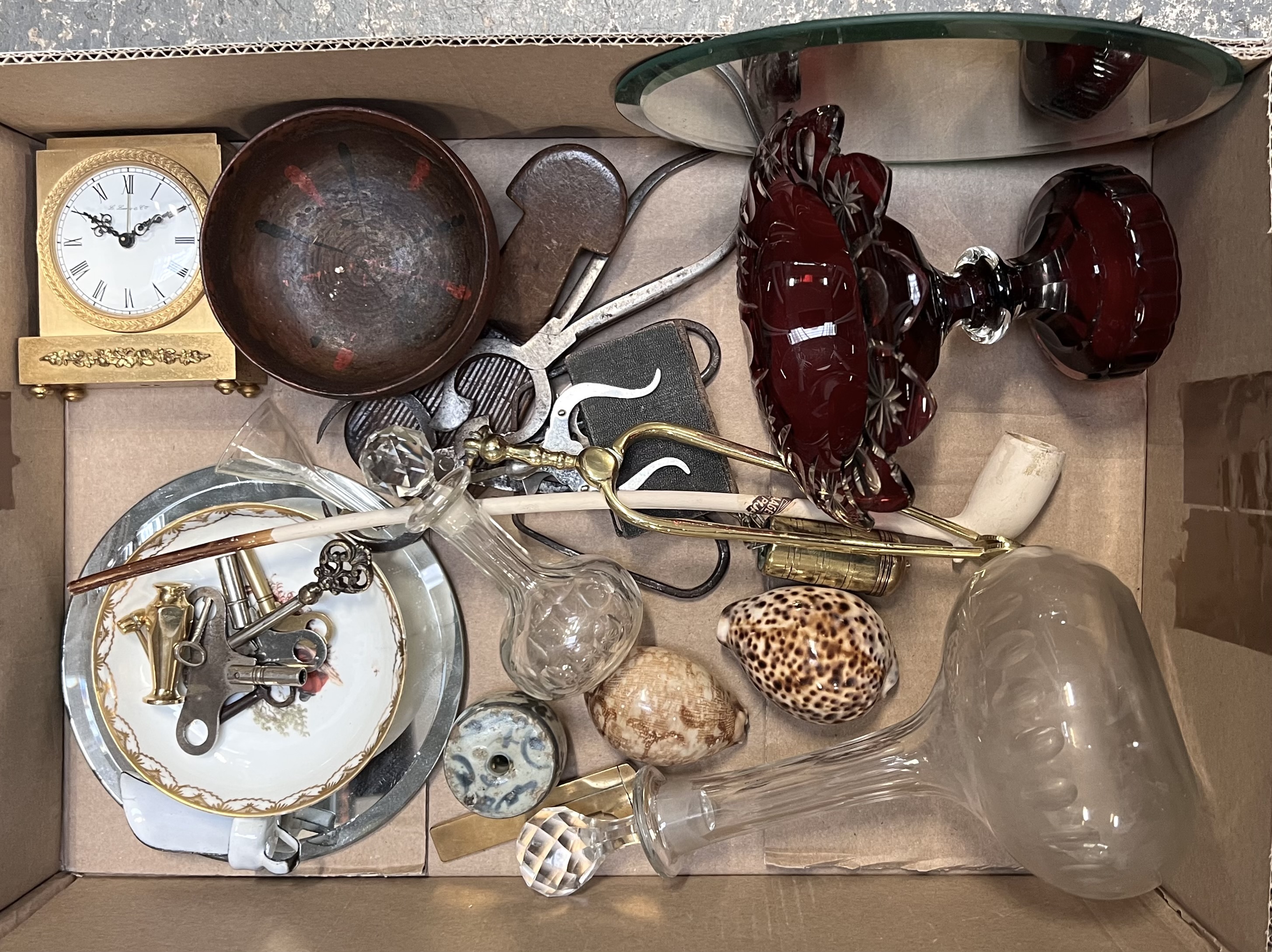 Een lot curiosa bestaande uit diverse decoratieve objecten, daterend uit de tweede helft 19e eeuw tot de 20e eeuw. De verzameling bevat voorwerpen van glas, messing, porselein en hout, waaronder een messing klokje, een roodglazen bokaal met geperste decoratie, glazen karaf, sleutels en schelpen. Klaar om te bieden? Registreer je nu en doe mee aan de veiling! |