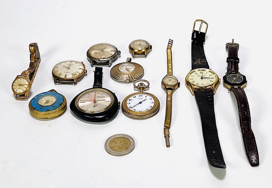 Diverse lot van elf horloges, daterend uit circa 1920–1990, omvat polshorloges, zakhorloges en een pendanthologe. De horloges zijn uitgevoerd in onedele metalen, verguld of geëmailleerd door middel van galvanisatie, mechanische en kwartsuurwerken. Geïnteresseerd? Bezoek onze kijkdagen op 28, 29 of 30 november van 11:00 tot 17:00 uur! |