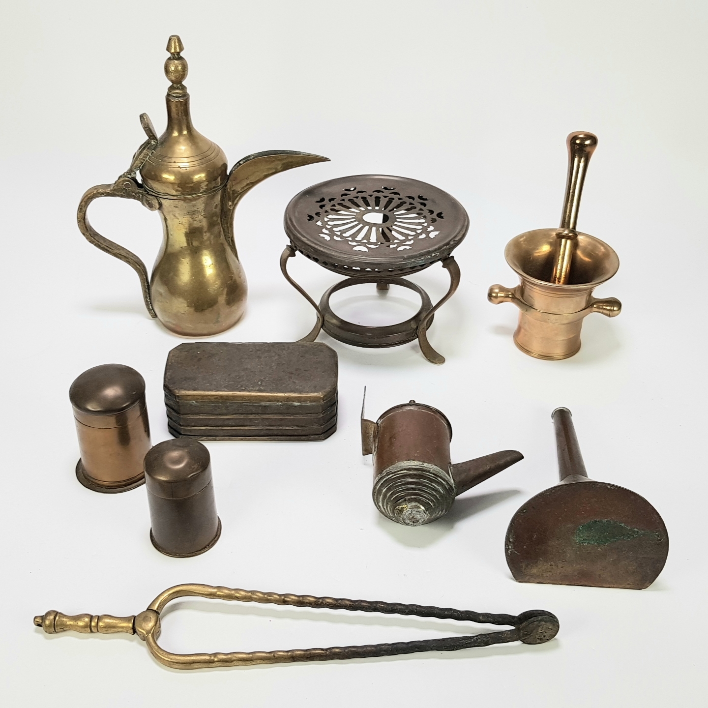 Een lot curiosa bestaande uit negen koperen en messing huishoudelijke voorwerpen, daterend uit de 19e en 20e eeuw. De collectie omvat onder andere een Arabische dallah (messing koffiekan), een messing komfoor en een koperen vijzel met stamper. Zeker zijn van deelname? Plaats vanaf 21 november een schriftelijk bod online! |