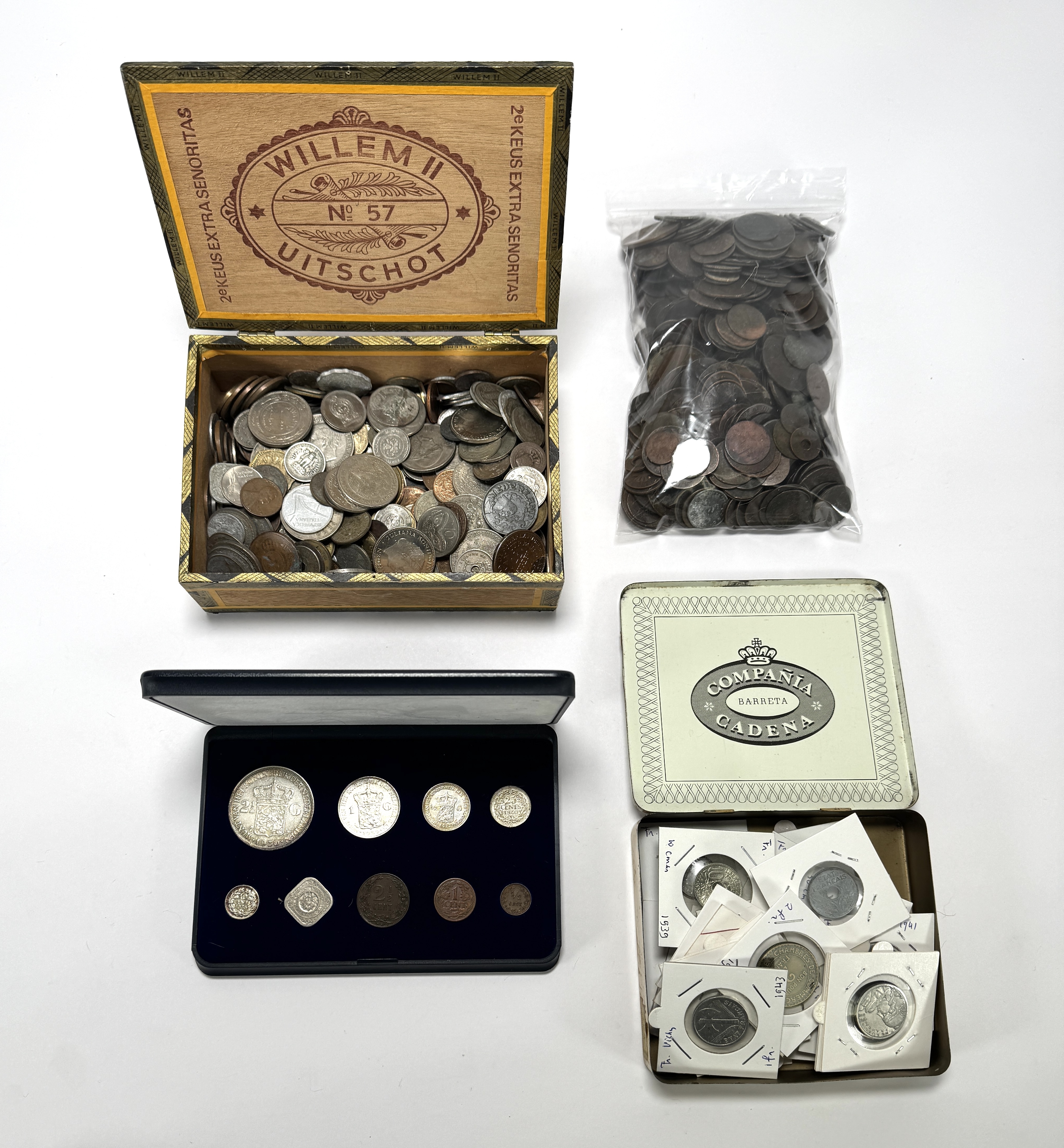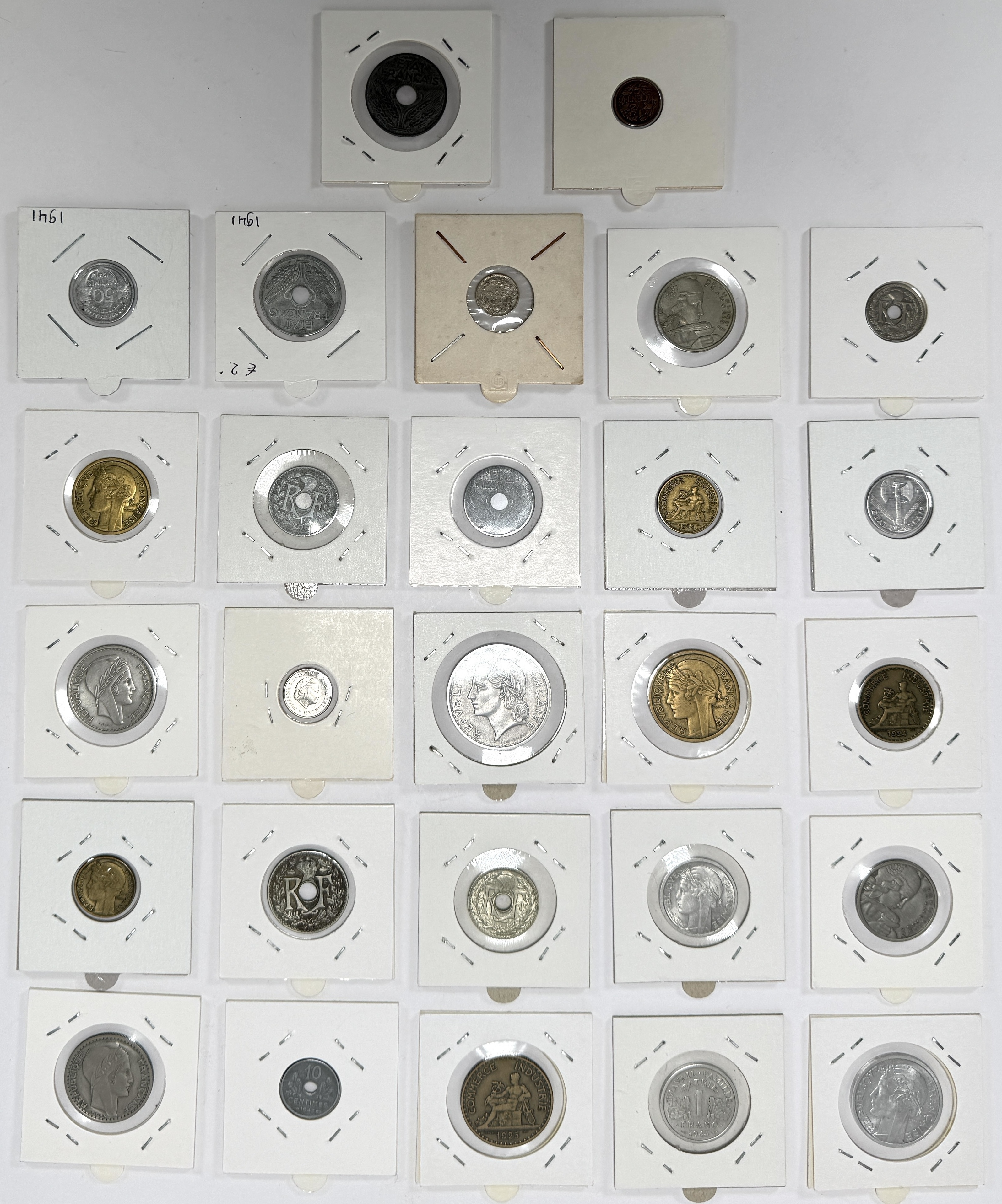 Collectie munten van Frankrijk en Nederland, geslagen uit diverse legeringen waaronder zilver en nikkel. De munten dateren voornamelijk uit de periode circa 1920–1960 en tonen een sterke vertegenwoordiging van de oorlogs- en naoorlogse periode. Het lot bevat een formele set en een hoeveelheid circulatiemunten in verschillende condities. Klaar om te bieden? Registreer je nu en doe mee aan de veiling! |
