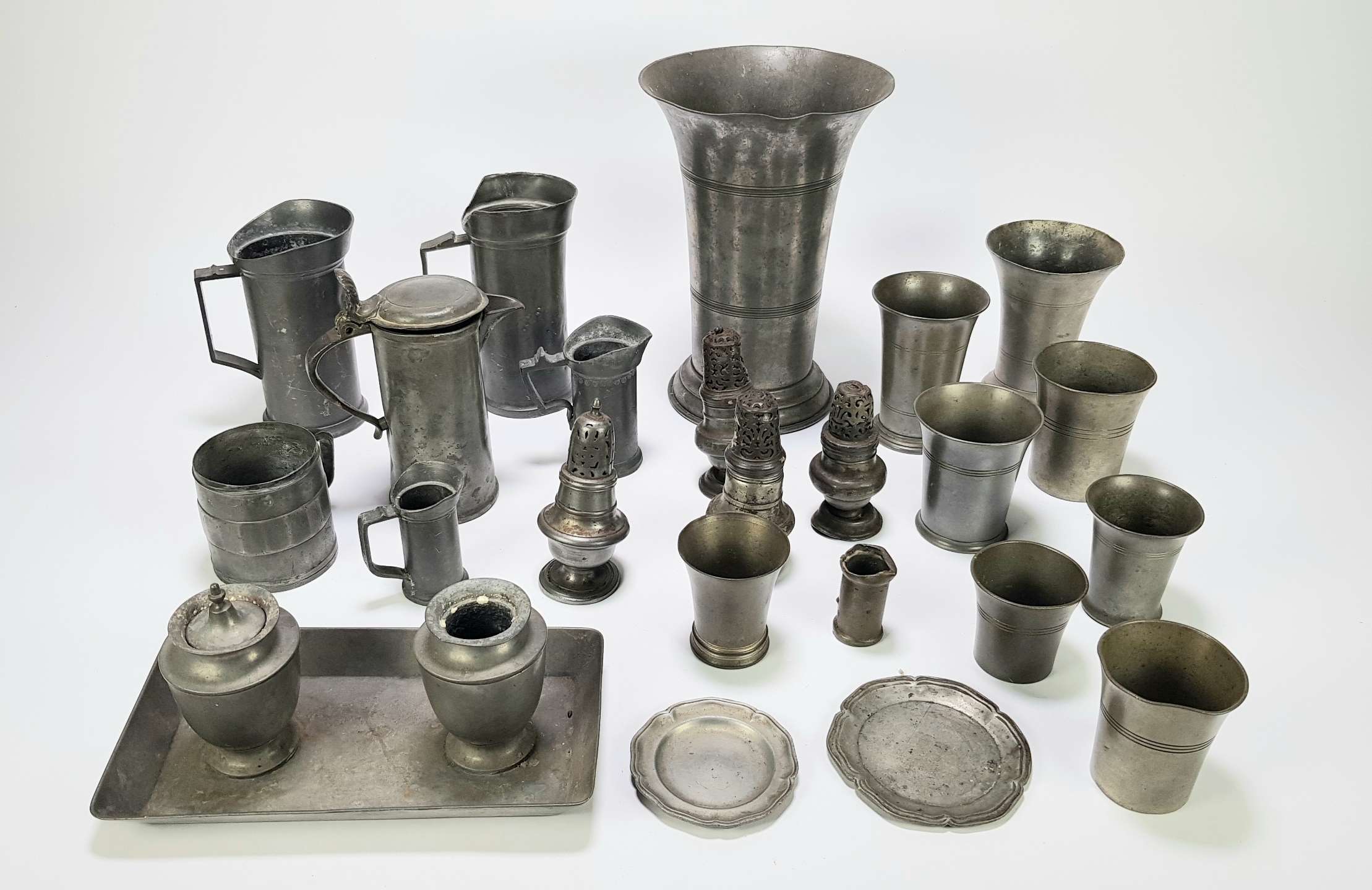 Diverse lot tinnen gebruiksvoorwerpen, daterend uit de 19e en 20e eeuw, bestaande uit onder andere kannen, bekers, schalen. De voorwerpen zijn vervaardigd door middel van gieten, solderen en deels draaiwerk en vertonen een overwegend utilitair-traditionele stijl. Geïnteresseerd? Bezoek onze kijkdagen op 28, 29 of 30 november van 11:00 tot 17:00 uur! |