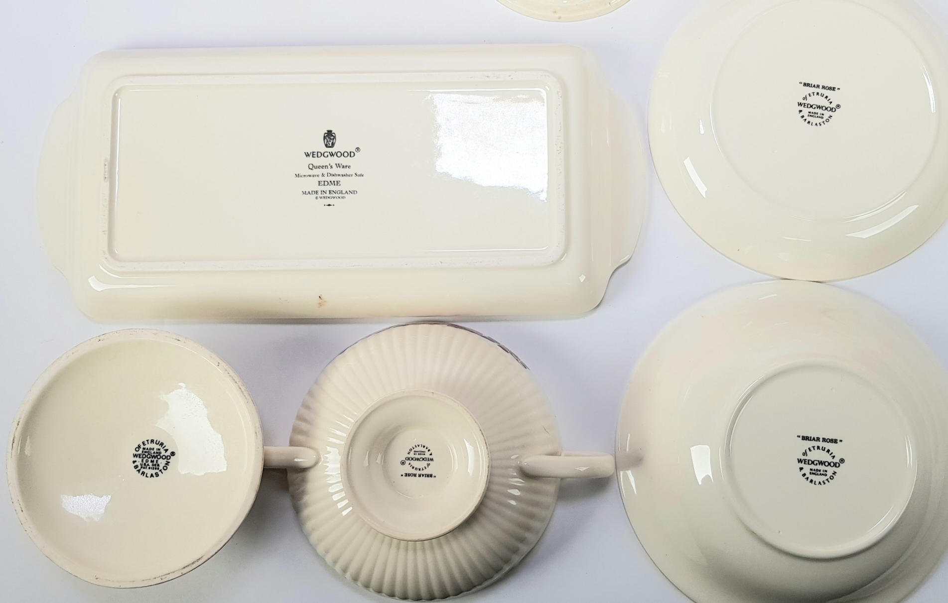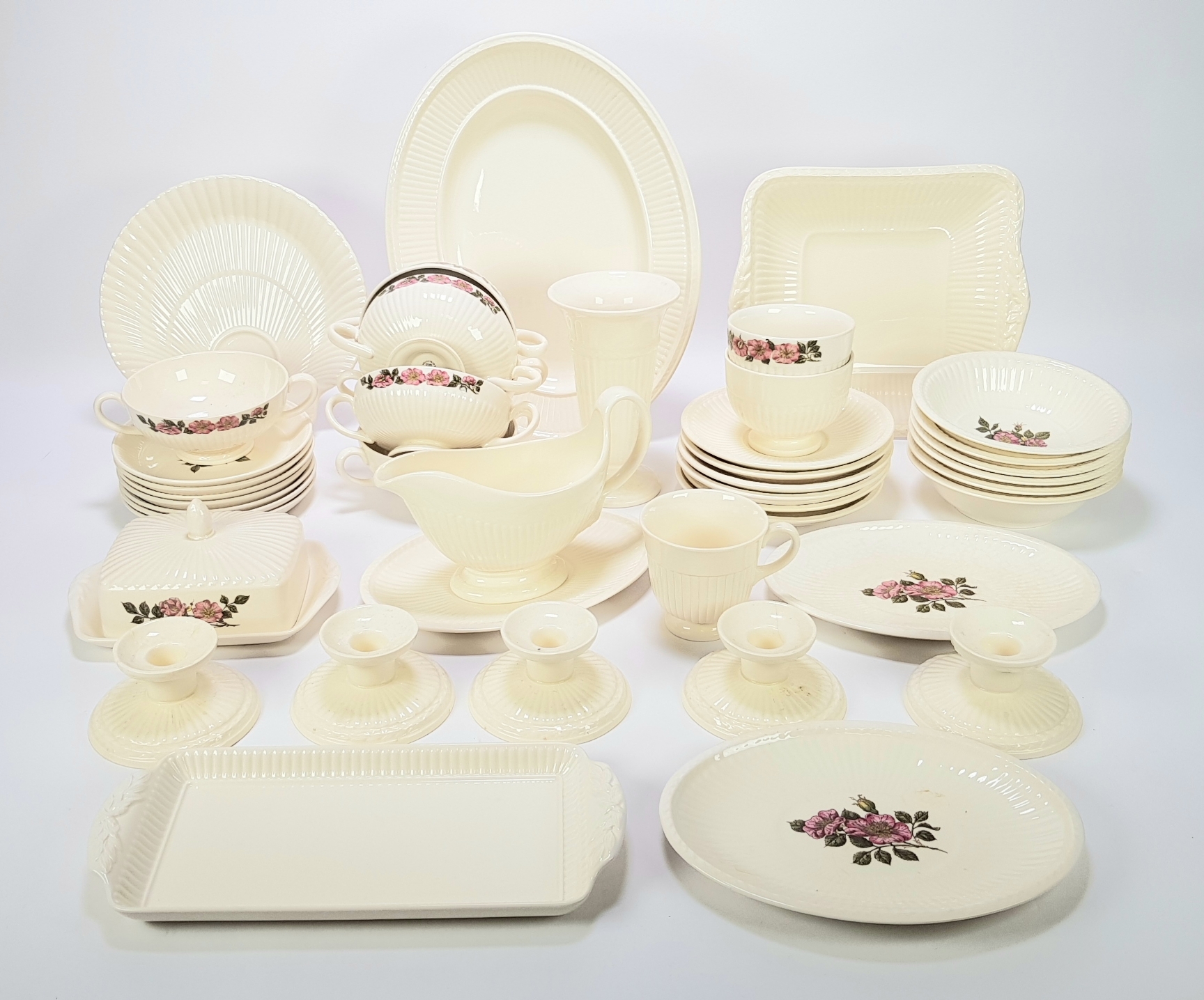 Queens Ware van Wedgwood, in het Edme-model met verticaal geribbelde randen, Engeland, eind 20e eeuw. Het lot omvat diverse stukken, waaronder borden, terrines en kandelaars. De stukken zijn deels gedecoreerd met een roosmotief in overglazuur transferdecoratie. Eerst dit lot zien voordat je biedt? Bezoek onze kijkdagen op 28, 29 en 30 november van 11:00 tot 17:00 uur! |
