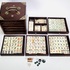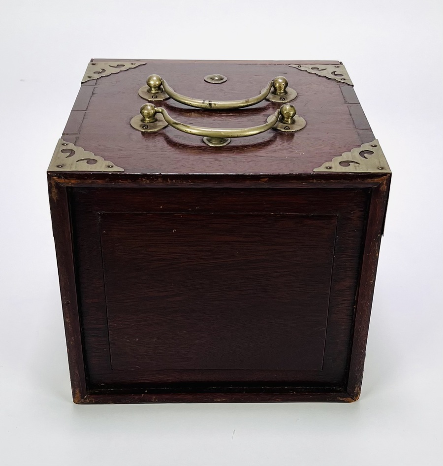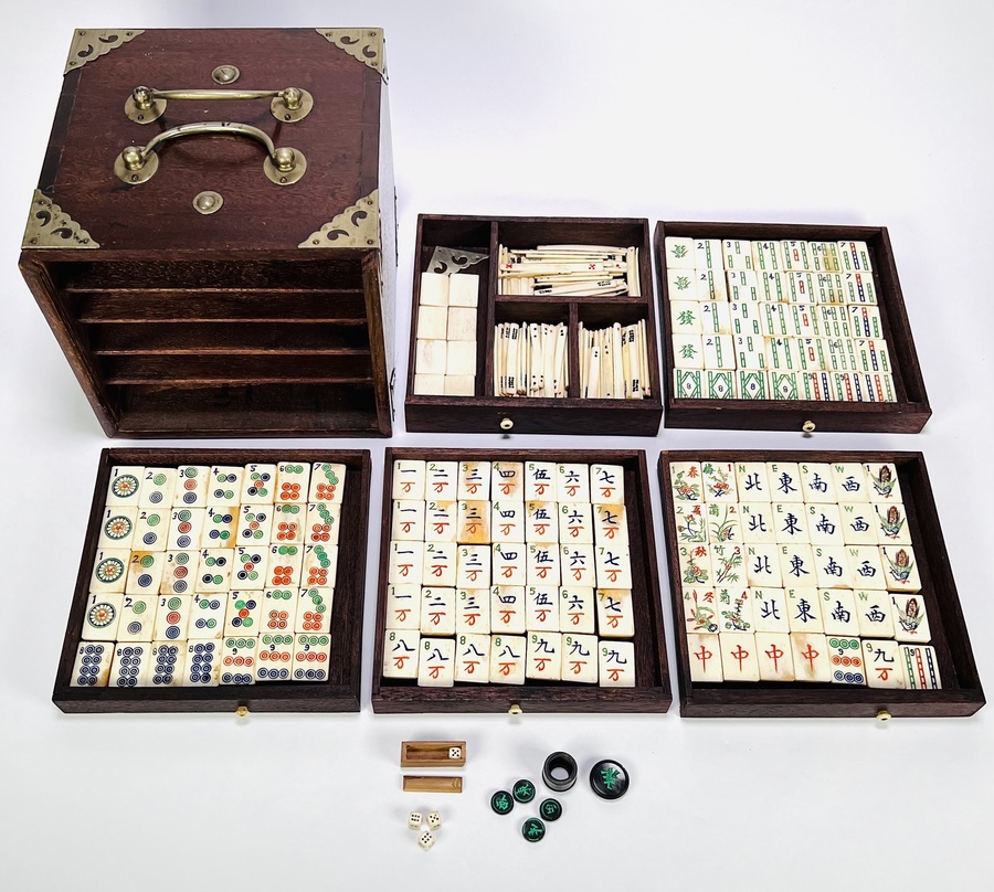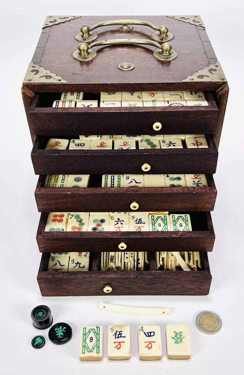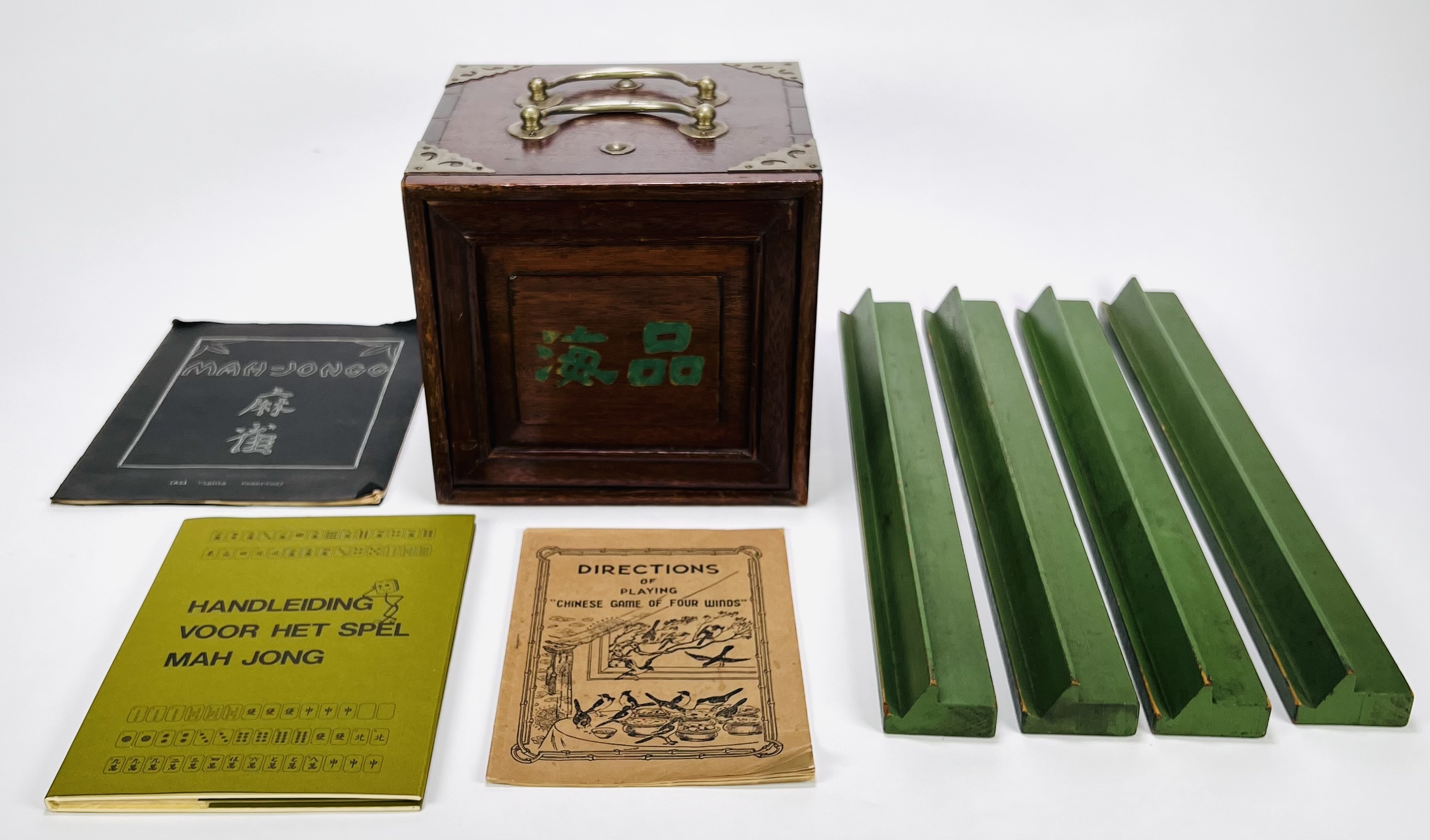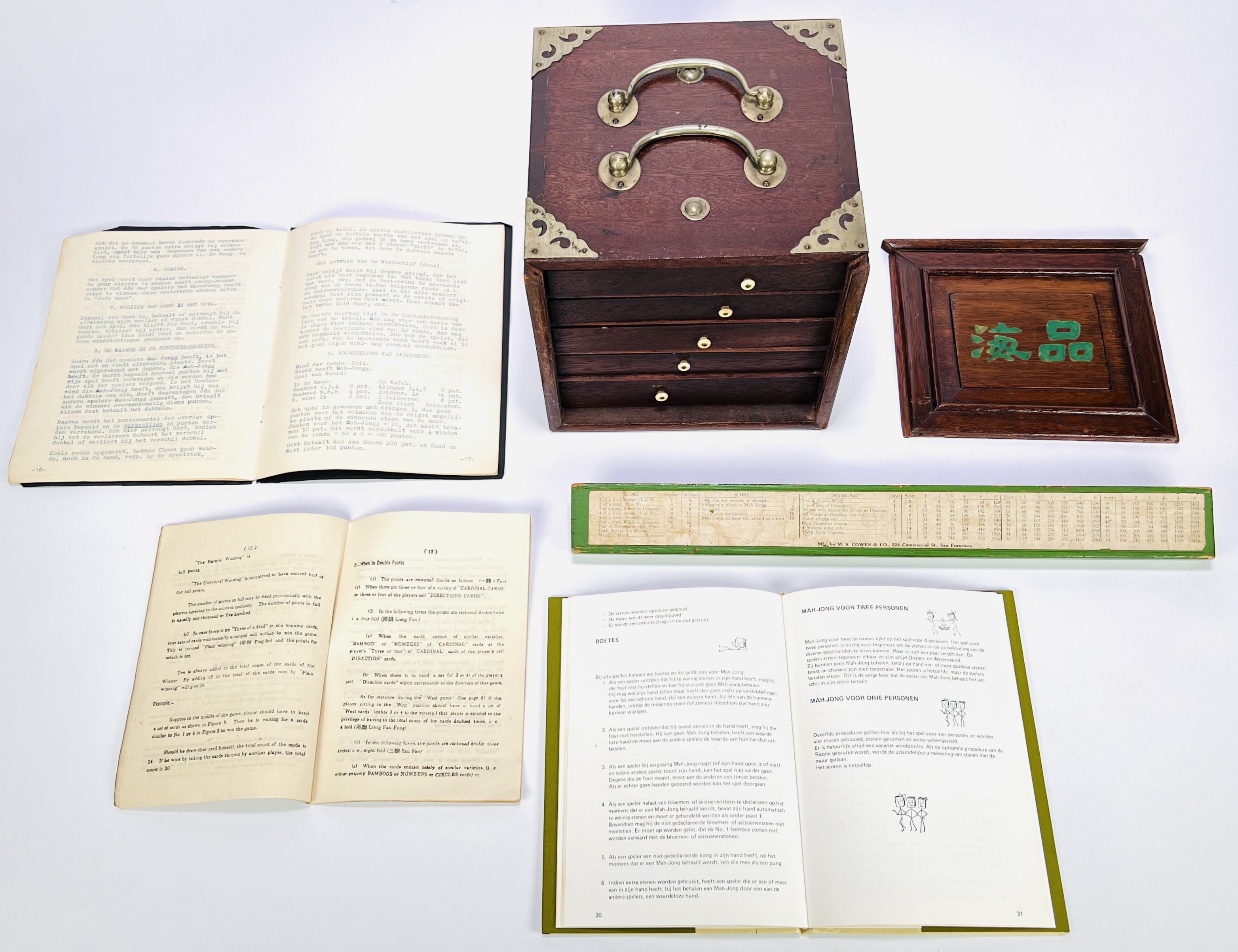 Compleet mahjong spel in een donker houten kist met vijf laatjes en messing beslag. De stenen zijn vervaardigd in een techniek van been en bamboe, met gegraveerde en ingekleurde Chinese karakters. De set bevat vier groene houten latten, fiches, dobbelstenen en drie handleidingen. Dit Chinese exportspel in de traditionele stijl dateert uit de periode ca. 1920–1940. Geïnteresseerd? Bezoek onze kijkdagen op 28, 29 of 30 november van 11:00 tot 17:00 uur! |