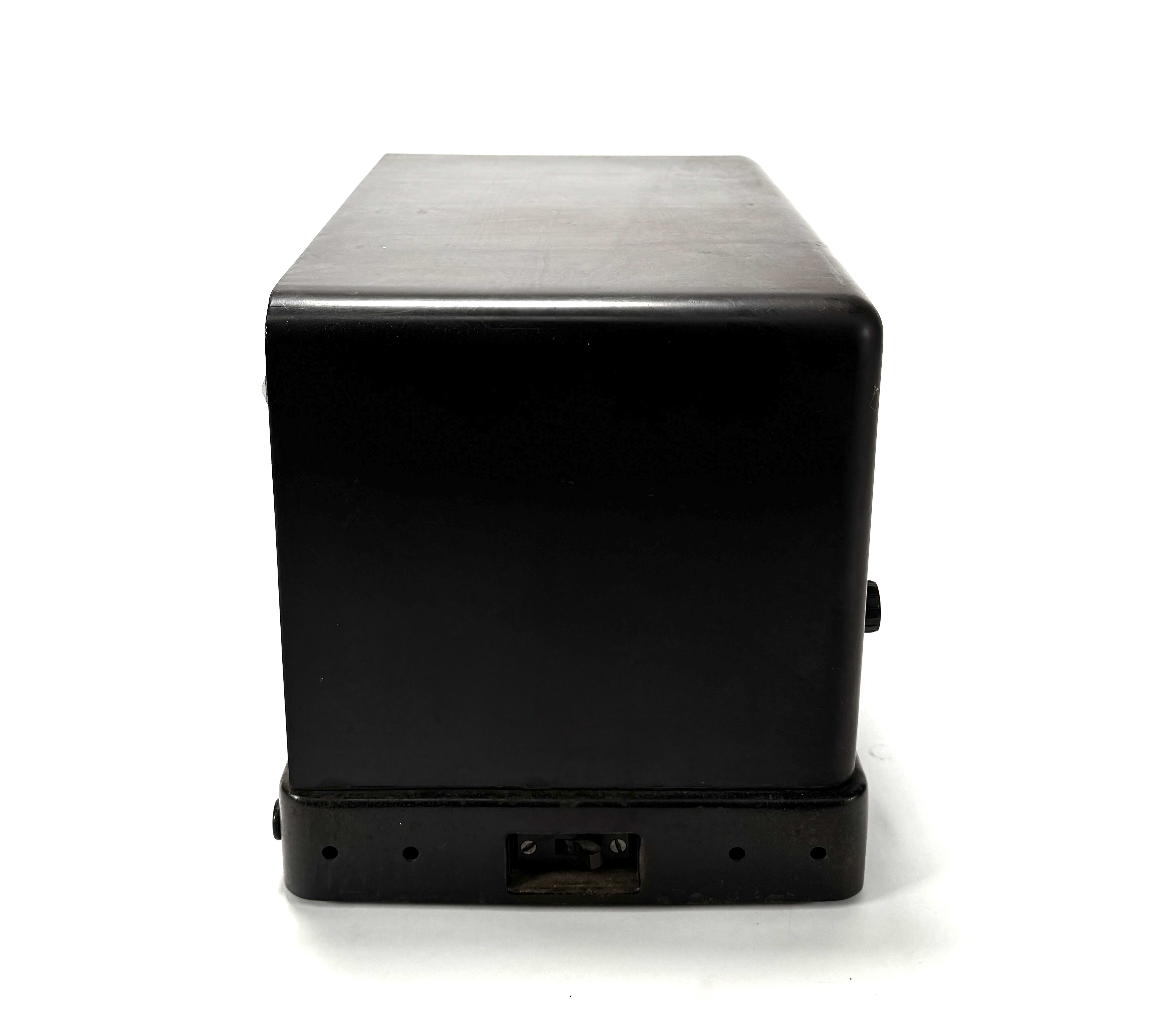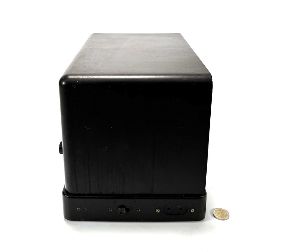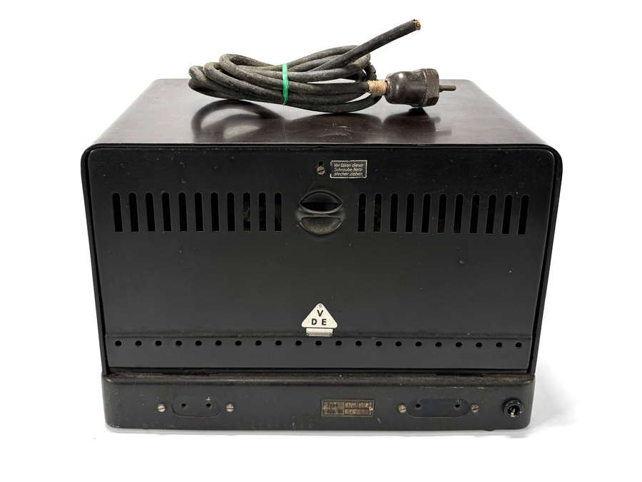Mende 169W Art Deco buizenradio, daterend 1934,Duitsland. De behuizing is vervaardigd uit donkerbruin bakeliet en kenmerkt zich door een robuuste, gestroomlijnde vorm. De radio heeft een schaalverdeling met frequentie-indicator en drie bedieningsknoppen. Dit model behoort tot de vroege elektrische tafelradio’s van Mende Werke Dresden, kenmerkend voor interbellumontwerp. Zeker zijn van deelname? Plaats vanaf 21 november een schriftelijk bod online! |