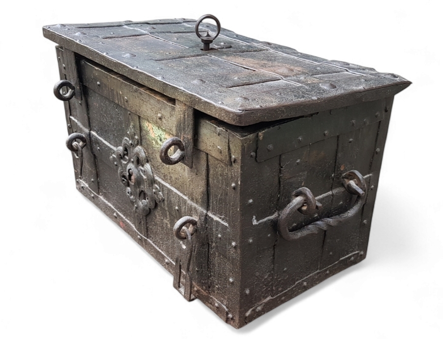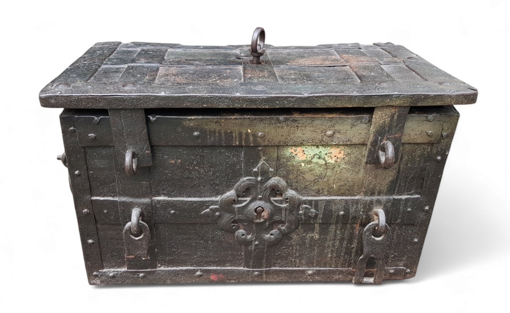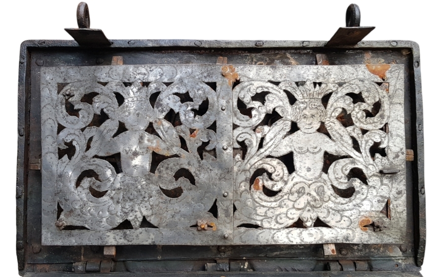 IJzeren geldkist met gegraveerd slotmechanisme - Renaissance, eerste helft 17e eeuw