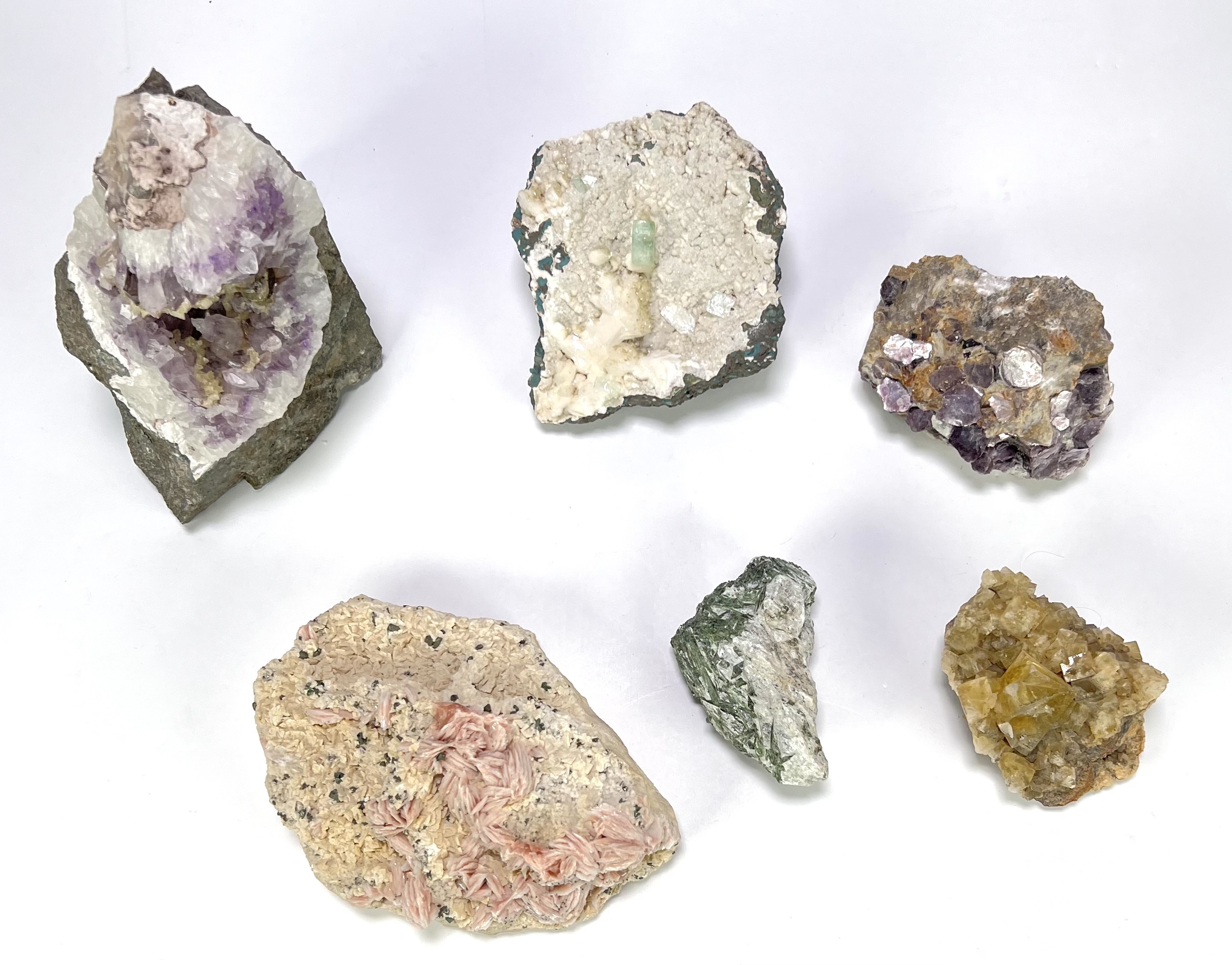 Lot van zes onbewerkte mineraalstukken uit diverse vindplaatsen wereldwijd. Het lot bevat onder andere amethist (paars kwarts), rhodochrosiet (roze mangaan-carbonaat), woestijnroos en een apofylliet/kwarts cluster met een groen kristal. De mineraalstukken zijn verkregen door splijting van het matrixgesteente en tonen hun natuurlijke kristallisatie. Dit mineralen zelf beoordelen? Je bent welkom op onze kijkdagen op 28, 29 en 30 november! |