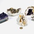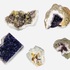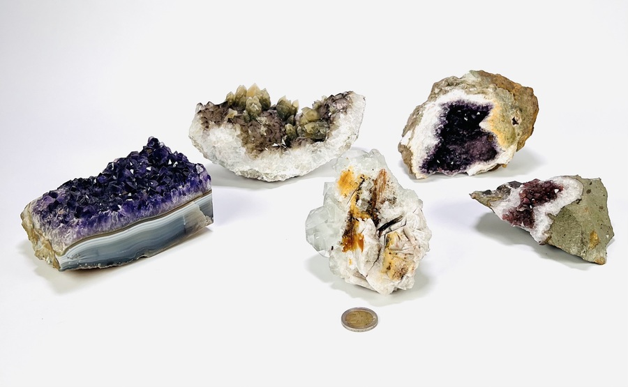 Verzameling van vijf mineralen bestaande uit een amethistgeode met paars kristalcluster, een calcietformatie met transparante kristallen, een kwartsgeode met donker centrum, een cluster met rookkwarts en calciet en een stuk bergkristal met insluitsels. De stukken tonen natuurlijke kristalgroei en variatie in kleur en structuur. Ontstaan door geologische processen, verzameld in de 20e eeuw. Ontdek deze mineralen en voeg het toe aan jouw collectie! Registreer nu voor de veiling. |