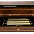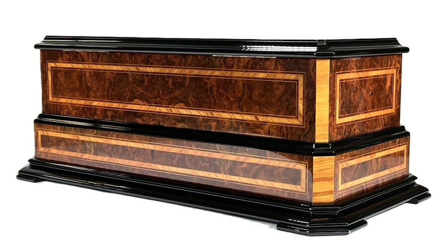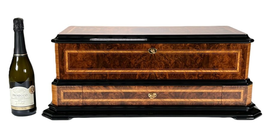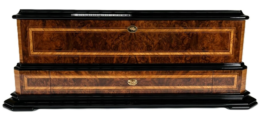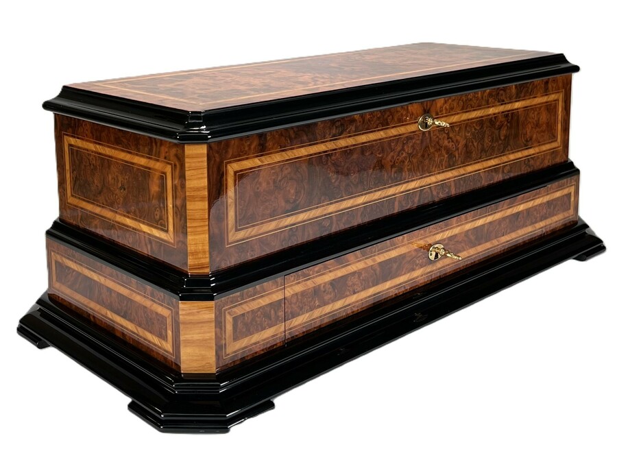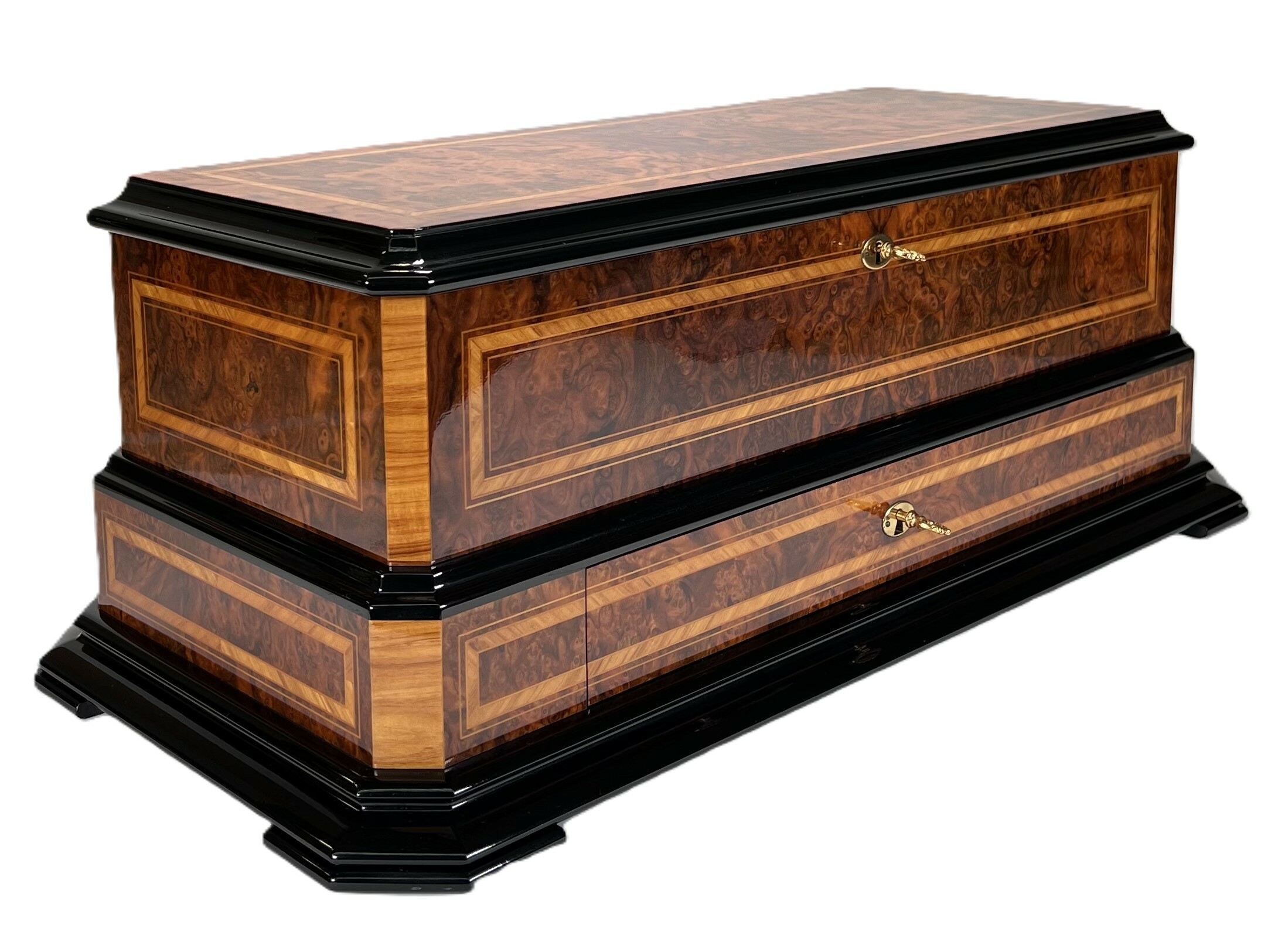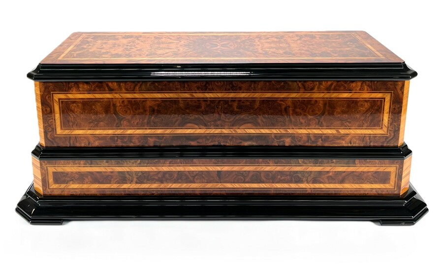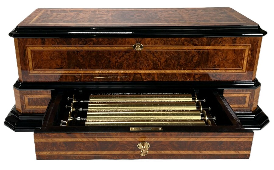 Reuge "Grand Cartel" SH 4/144 muziekdoos met het complexe 144-noot "Sublime Harmonie" mechanisme, circa 1990, uit Sainte-Croix Zwitserland. De muziekdoos bestaat uit een houten constructie bekleed met hoogglans gelakt wortelnoten fineer. Het mechanisme is gemerkt met "REUGE SWITZERLAND 026" en het tunesheet met "REUGE MUSIC SAINTE CROIX SWITZERLAND" Het mechanische deel is een gepind cilinder speelwerk van het 144-noot type, waarbij het geluid wordt geproduceerd door de pinnen op de cilinder die een tweedelige stalen klankkam tokkelen. De muziekdoos maakt gebruik van een verwisselbaar mechanisme voor de cilinders en is voorzien van een opwindmechanisme met een precisie aangedreven snelheidsregelaar en bevat een lade voor vijf verwisselbare cilinders met twintig klassieke melodieën. Het 144-toetsen speelwerk van messing en staal is van de hoogste Reuge kwaliteit en vakmanschap. Inclusief originele transportkist. Geïnteresseerd? Bezoek onze kijkdagen op 28, 29 of 30 november van 11:00 tot 17:00 uur! |