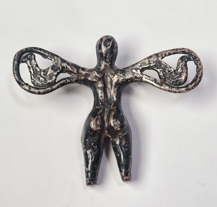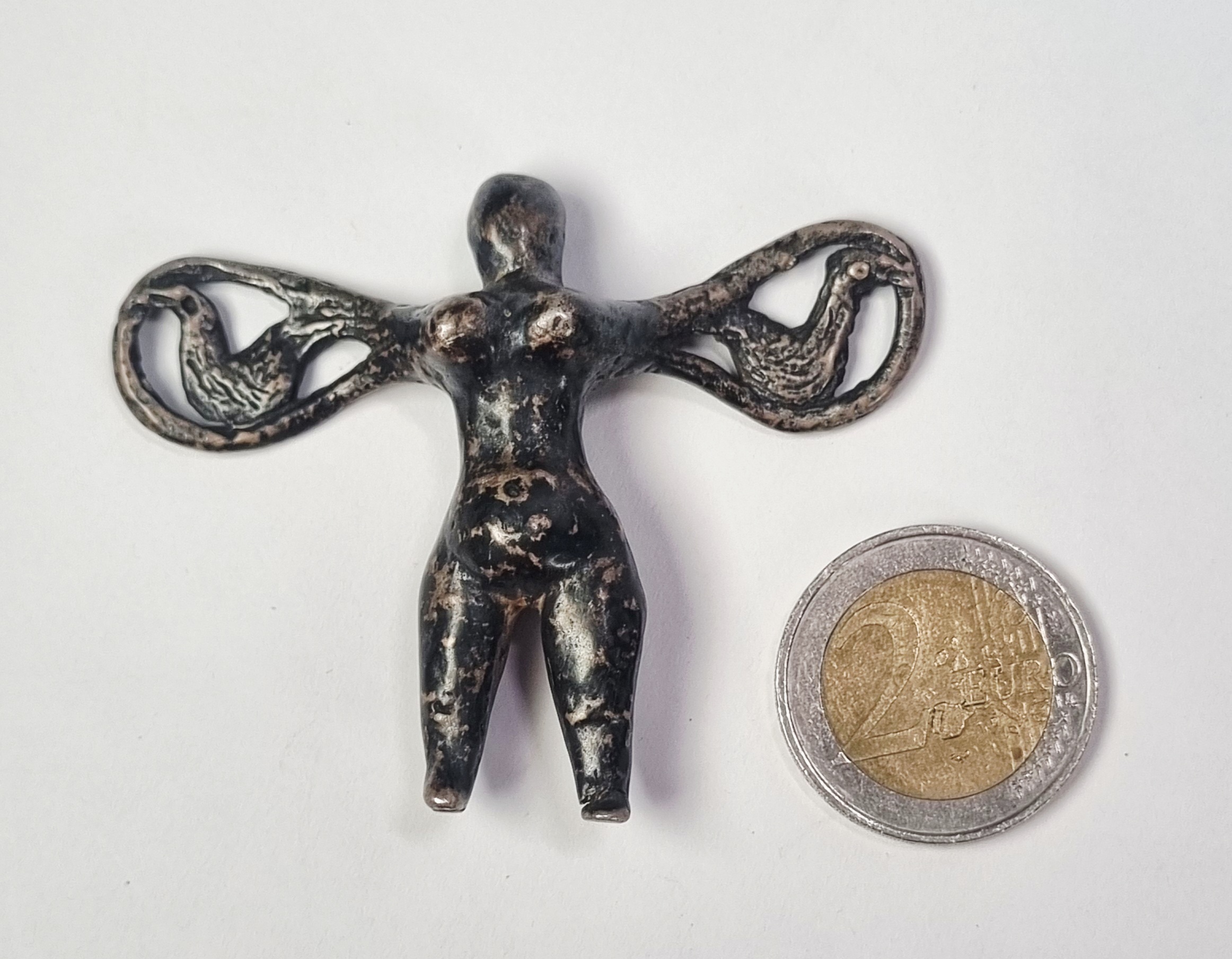 Bronzen beeldje van een gestileerde, vrouwelijke figuur, door Maja van Hall-Blom (1937). Het werk is vervaardigd door middel van bronsgieten (verloren-wasmethode) met een donkere, contrasterende patina. De figuratieve stijl met primitivistische invloeden dateert uit de periode ca. 1970–1990. Het beeldje van Nederlandse herkomst toont een archetypische voorstelling van een naakt figuur met in de armen twee gestileerde vogels. Wil je direct deelnemen? Plaats vanaf 21 november alvast een schriftelijk bod via onze website! |
