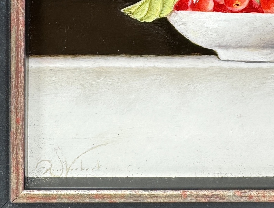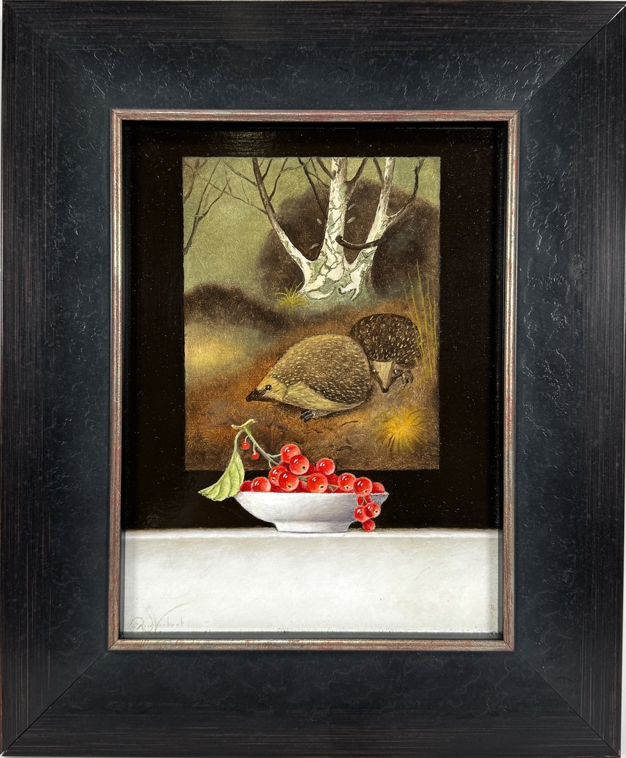 Olieverfschilderij op paneel, getiteld "Ode aan Jan Mankes" (Ezeltjes in het bos), van de Nederlandse schilder Ruud Verkerk. Het is uitgevoerd in een hedendaagse figuratieve stijl met een fijne penseelvoering. De voorstelling toont een stilleven van rode bessen en een bosgezicht met twee egels op de achtergrond. Het werk is gesigneerd linksonder en gedateerd 2017 op de achterzijde. Het bevindt zich in een dubbele houten lijst met goudkleurige binnenrand. Registreer nu en bied eenvoudig online mee op dit paneel! |