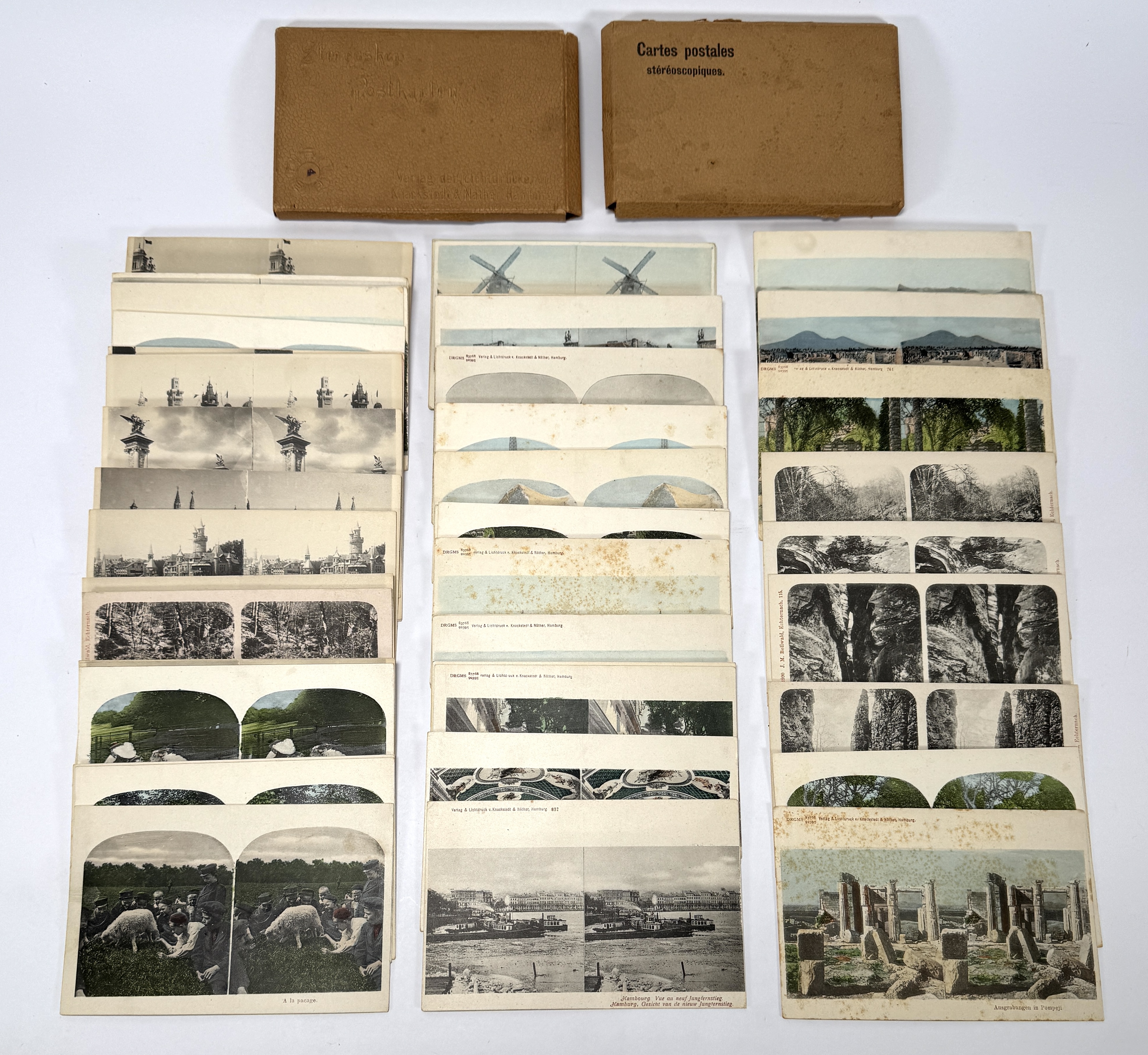 Collectie van circa 40 historische stereofoto's , daterend uit de periode circa 1900–1915. De kaarten zijn op karton door de Duitse uitgever A. Schroll & Söhne in München. Ze tonen diverse topografische scènes (molens, stadsgezichten, ruïnes) en zijn deels handmatig ingekleurd. Deze fotografische platen worden geleverd in twee originele doosjes. Geïnteresseerd? Bezoek onze kijkdagen op 28, 29 of 30 november van 11:00 tot 17:00 uur! |
