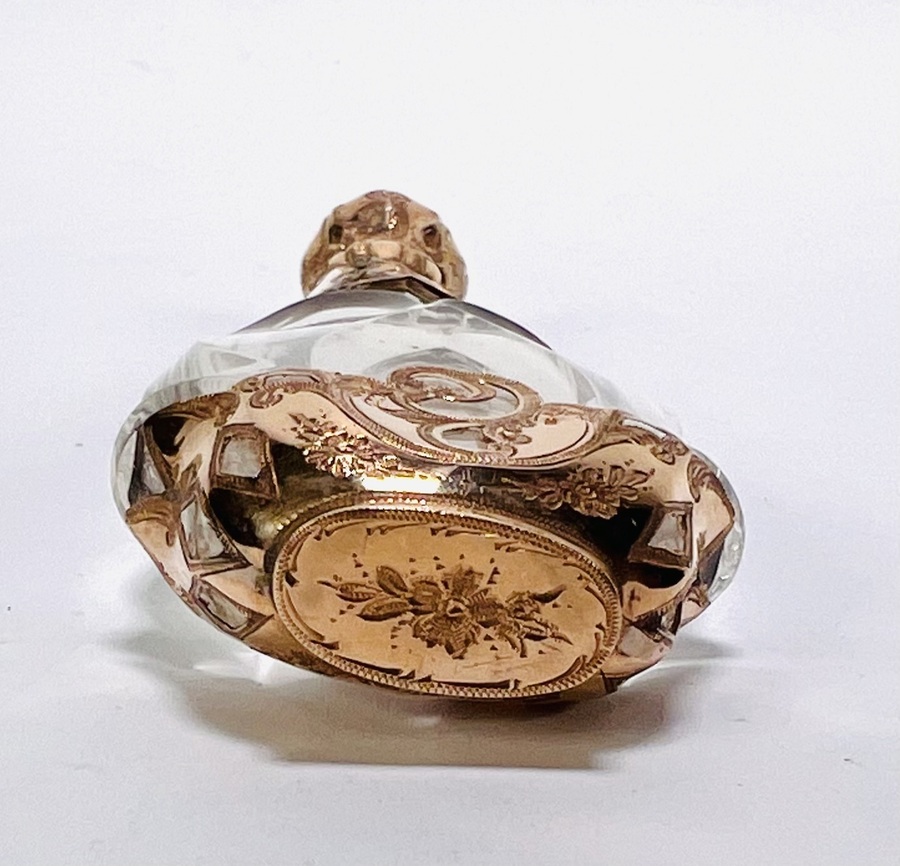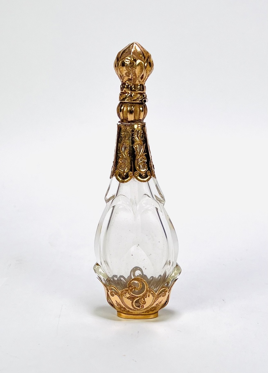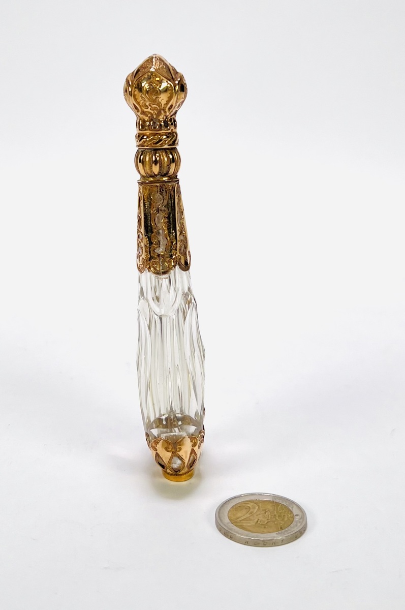 Parfumflesje van helder geslepen kristal met rijk gegraveerde 14 karaat gouden monturen gemerkt met eikenblad, vervaardigd in de tweede helft van de 19e eeuw, Europa. Het peervormig parfumflesje toont florale ornamentiek en reliëfdecoratie aan hals, voet en scharnierend dopdeksel, met bijbehorend glazen stopje. Dit parfumflesje zelf beoordelen? Je bent welkom op onze kijkdagen op 28, 29 en 30 november! |