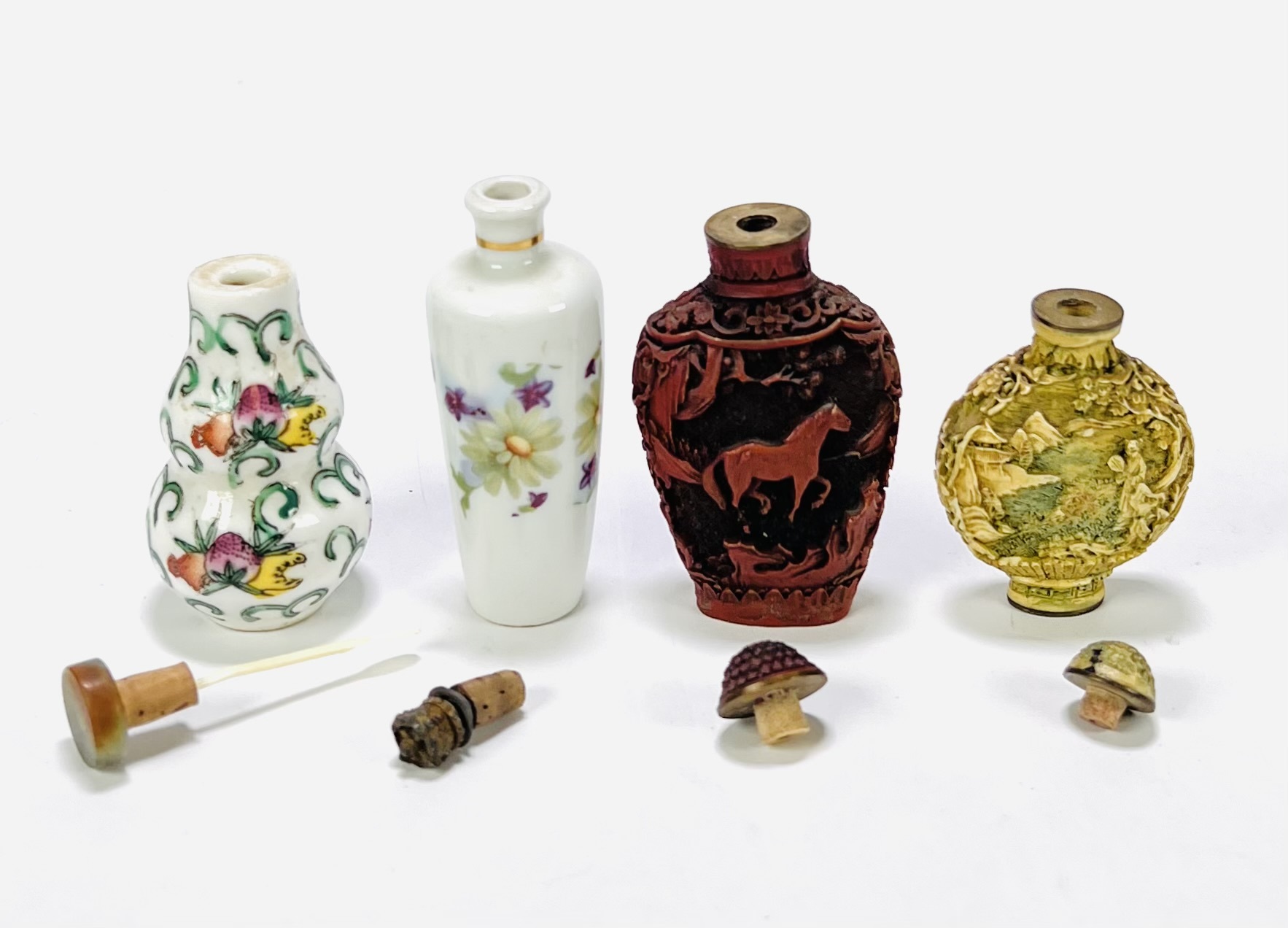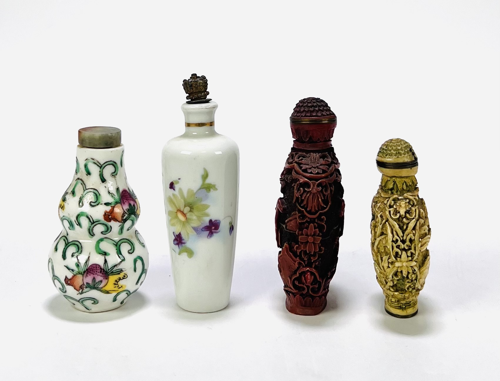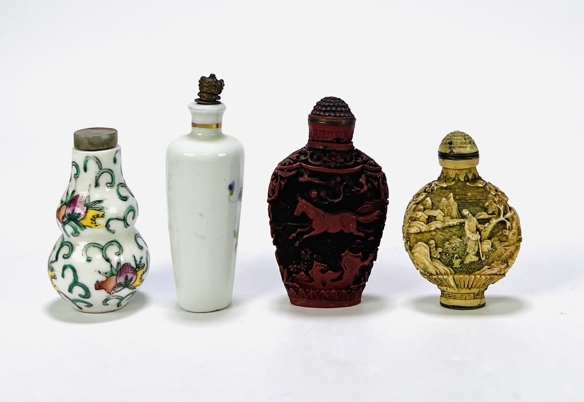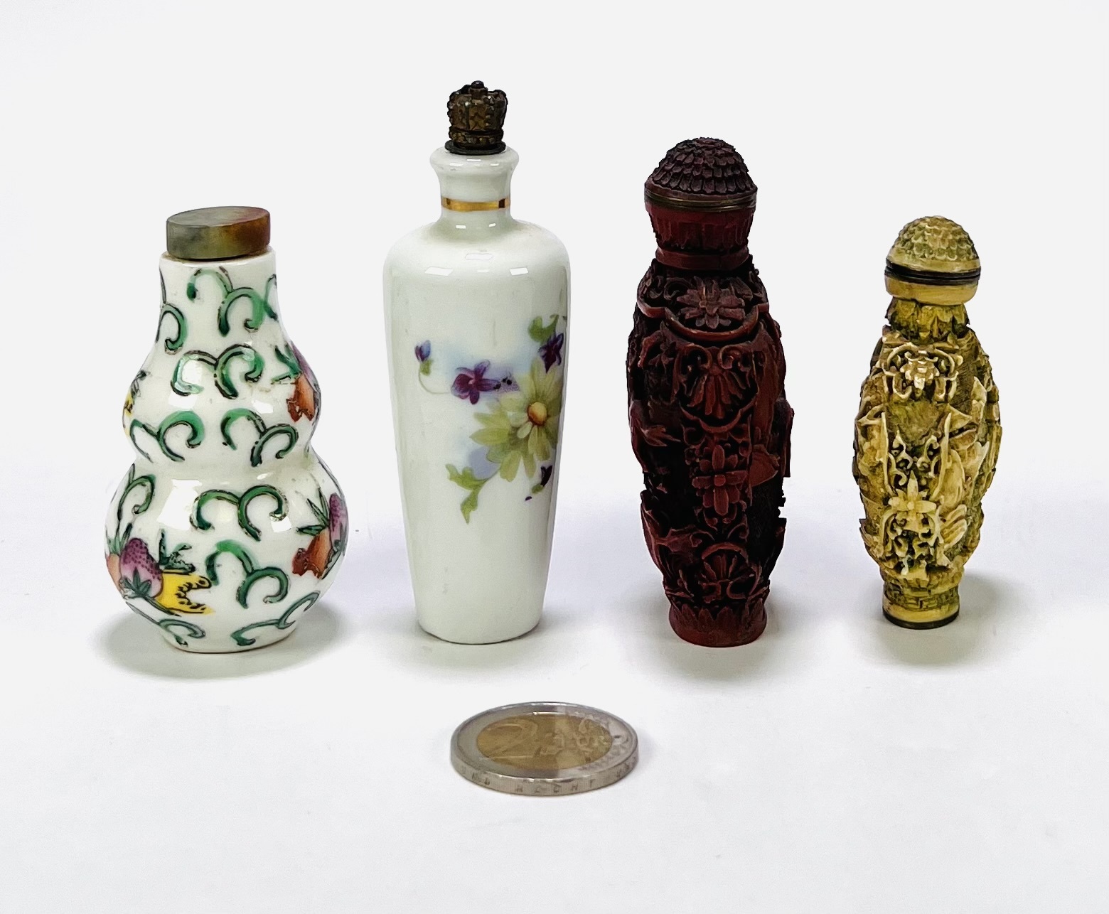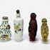Vier Chinese snuifflesjes (snuff bottles), daterend uit de 20e eeuw. De flesjes zijn vervaardigd uit verschillende materialen; porselein met florale beschildering en fijn gesneden hars met imitatie-ivoorafwerking en cinnebar. Geïnteresseerd? Bezoek onze kijkdagen op 28, 29 of 30 november van 11:00 tot 17:00 uur! |