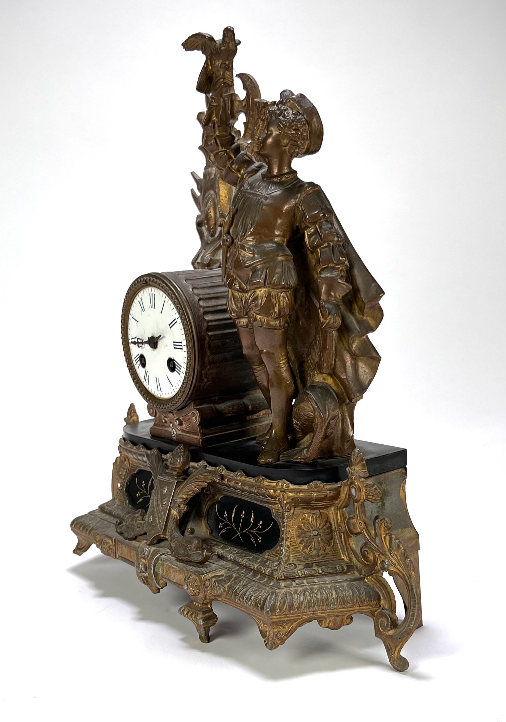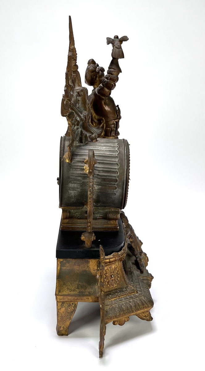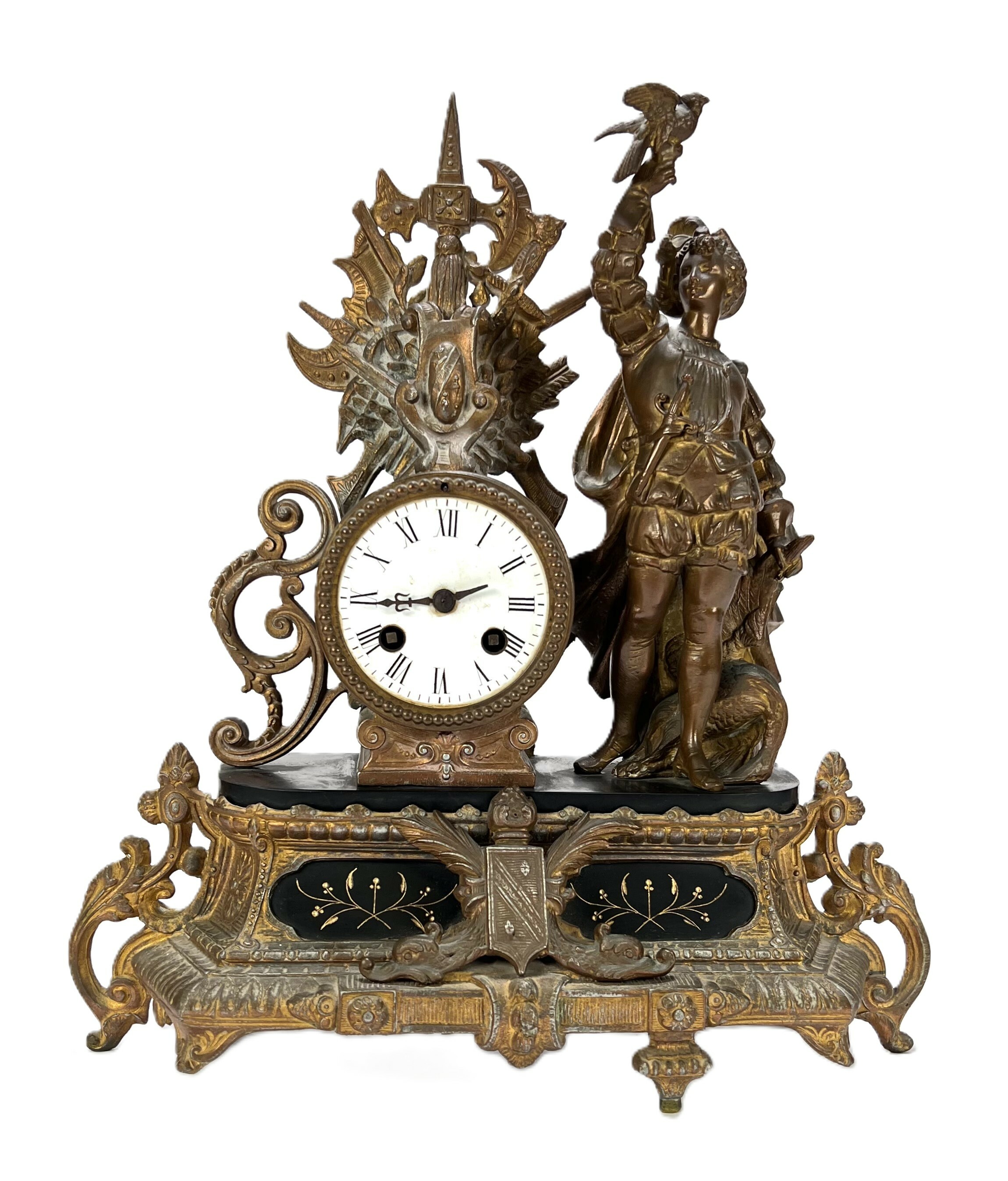 Figurale mantelklok in de neorococo stijl, gedateerd circa 1875–1910, van de firma Deprez & Cie uit Frankrijk. De kast is gegoten witmetaal, gepatineerd en met goudkleurige afwerking op een stenen basis. De voorstelling toont een jonge man met een vogel naast een uurwerk met Romeinse cijfers. De basis is rijk versierd met rocaille ornamenten. Klaar om te bieden? Registreer je nu en doe mee aan de veiling! |