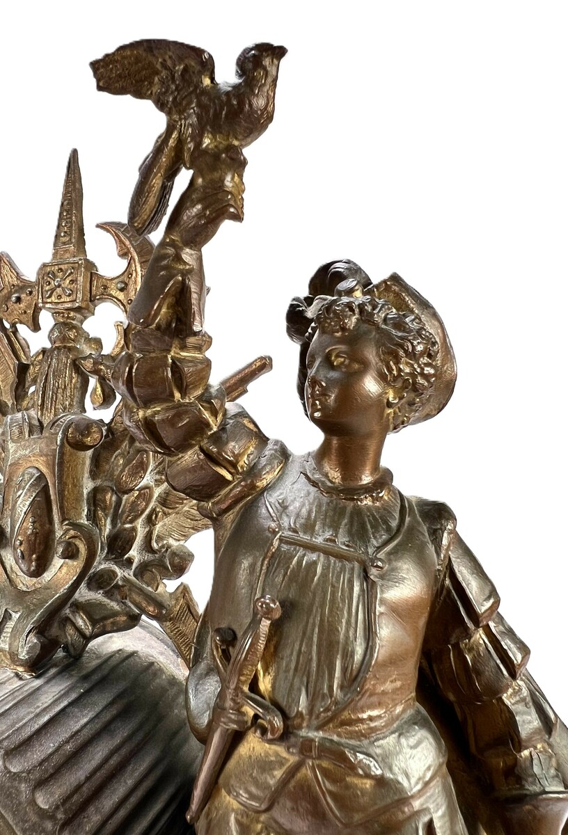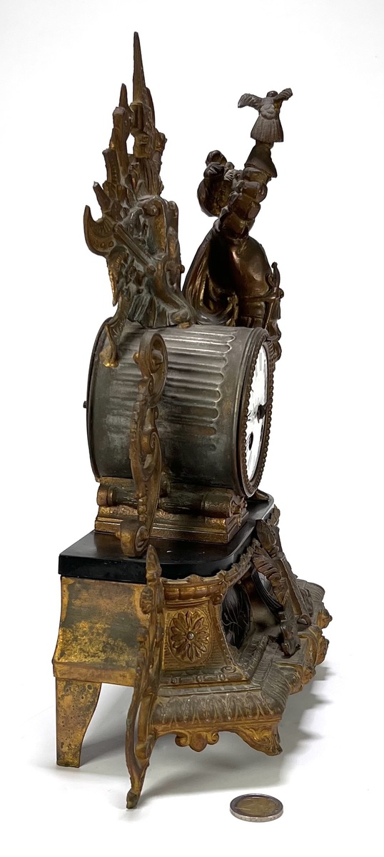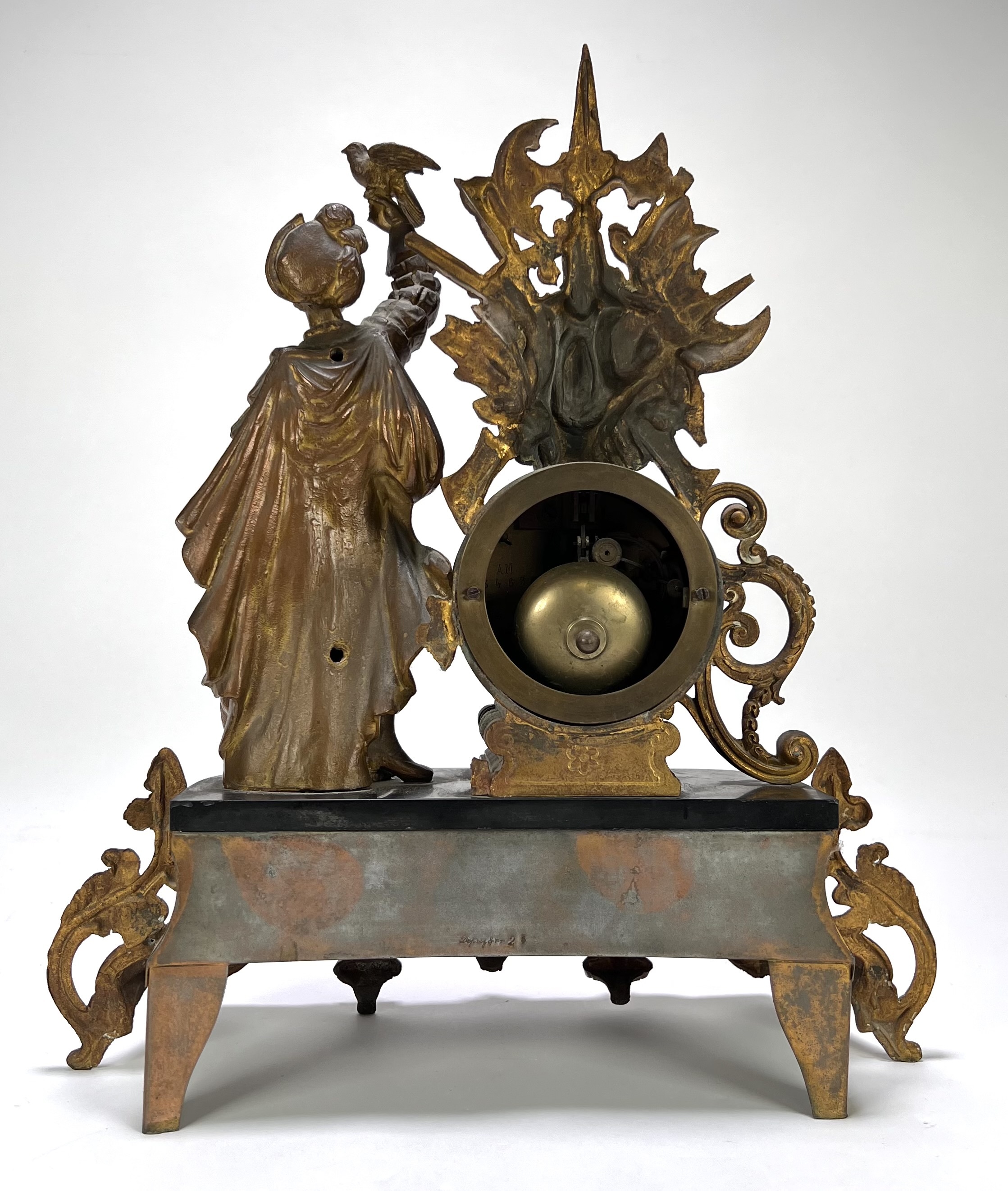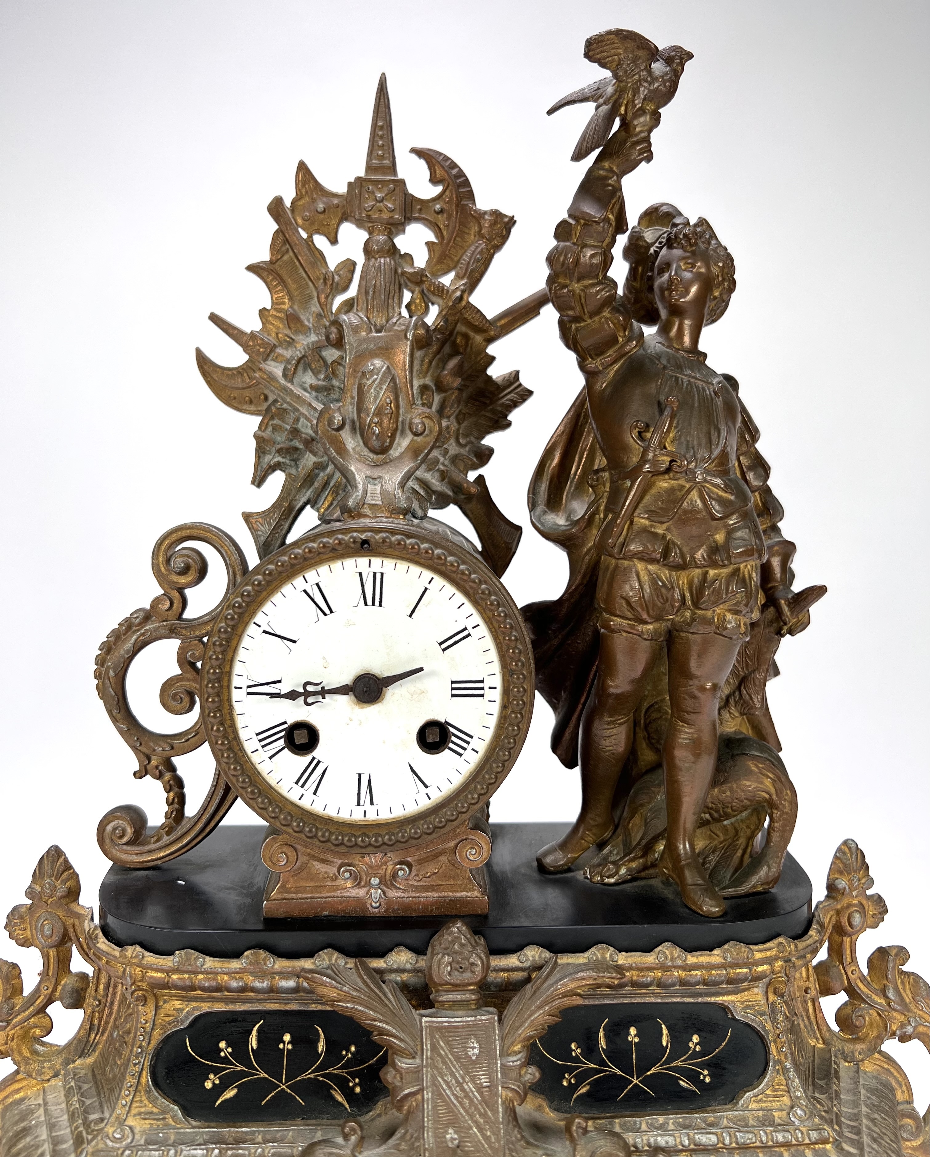 Figurale mantelklok in de neorococo stijl, gedateerd circa 1875–1910, van de firma Deprez & Cie uit Frankrijk. De kast is gegoten witmetaal, gepatineerd en met goudkleurige afwerking op een stenen basis. De voorstelling toont een jonge man met een vogel naast een uurwerk met Romeinse cijfers. De basis is rijk versierd met rocaille ornamenten. Klaar om te bieden? Registreer je nu en doe mee aan de veiling! |