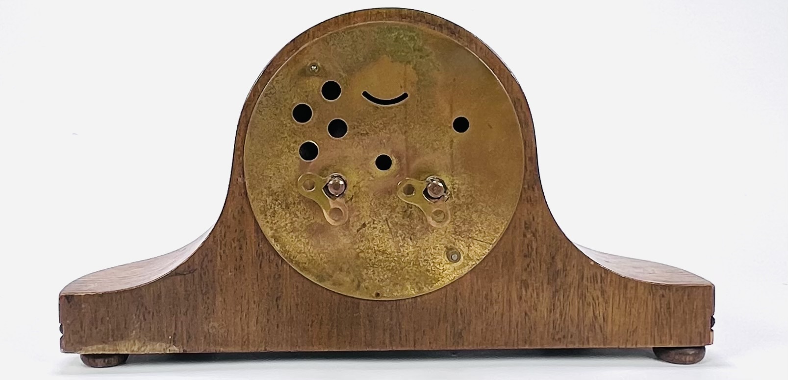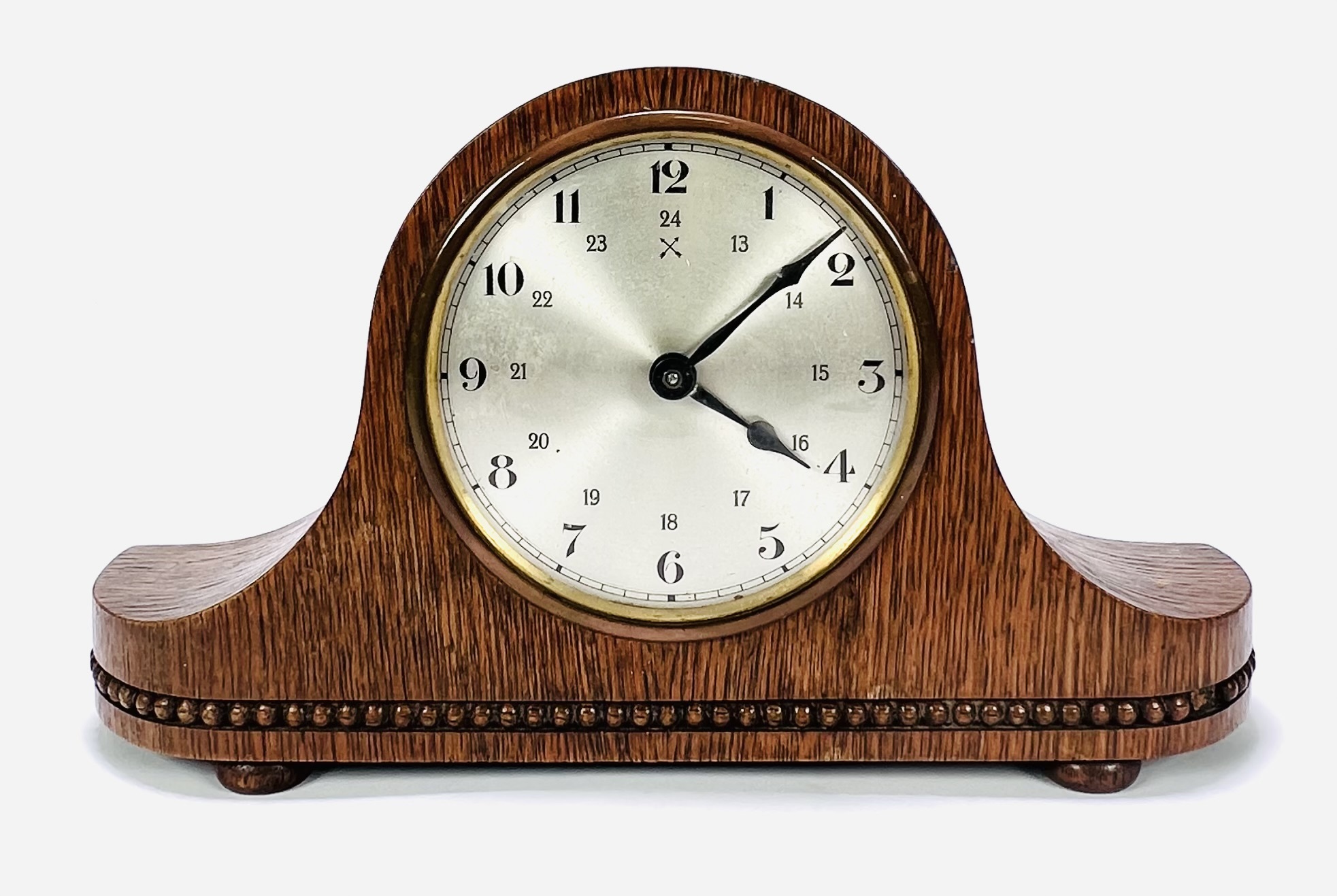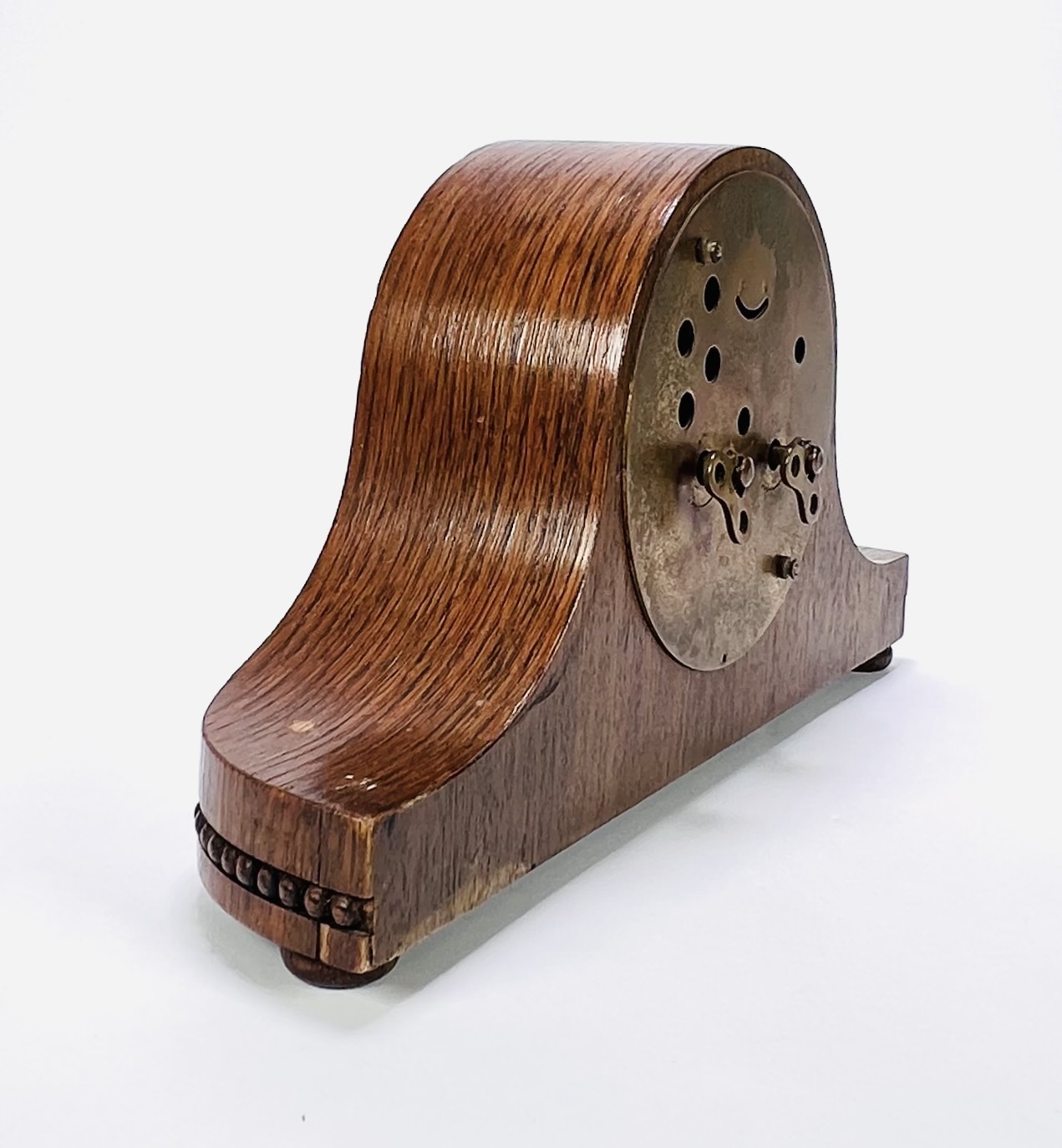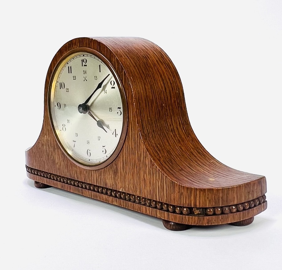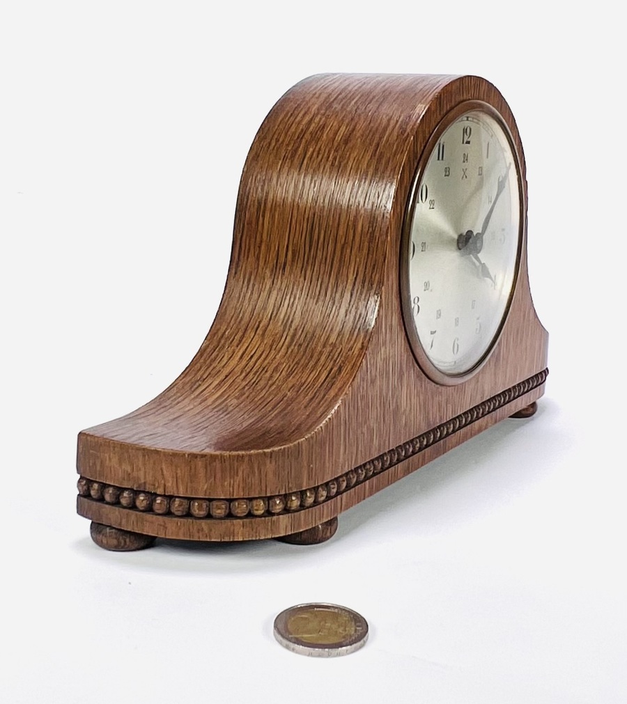 Art Deco pendule met een mechanisch uurwerk en slagwerk, geplaatst in een gebogen houten kast met een gefineerde afwerking. De klok heeft een 24-uurs wijzerplaat met Arabische cijfers, kenmerkend voor de Art Deco van de periode ca. 1930–1940. De kast is gestroomlijnd en versierd met een parelmotief langs de basis. Wil je deze klok in het echt bekijken? Kom naar de kijkdagen op 28, 29 en 30 november |