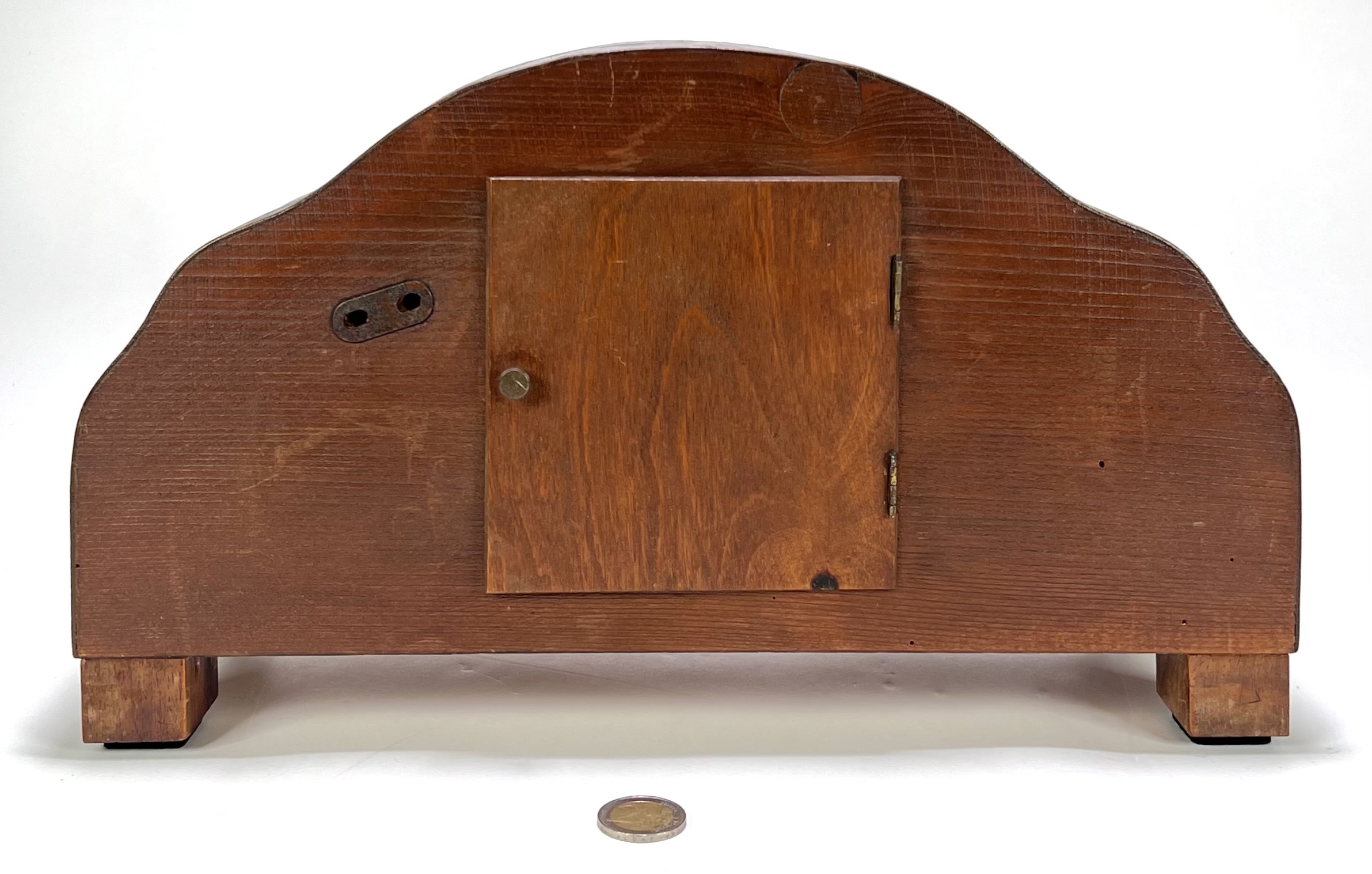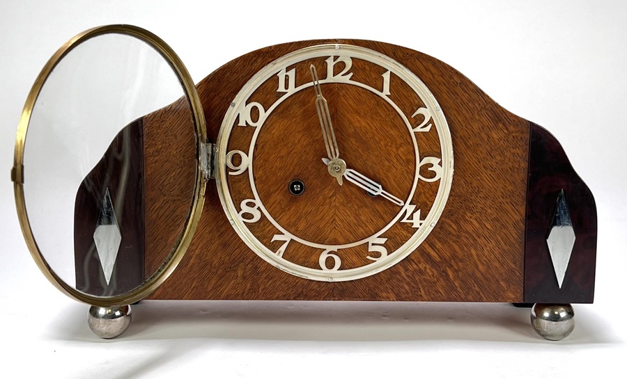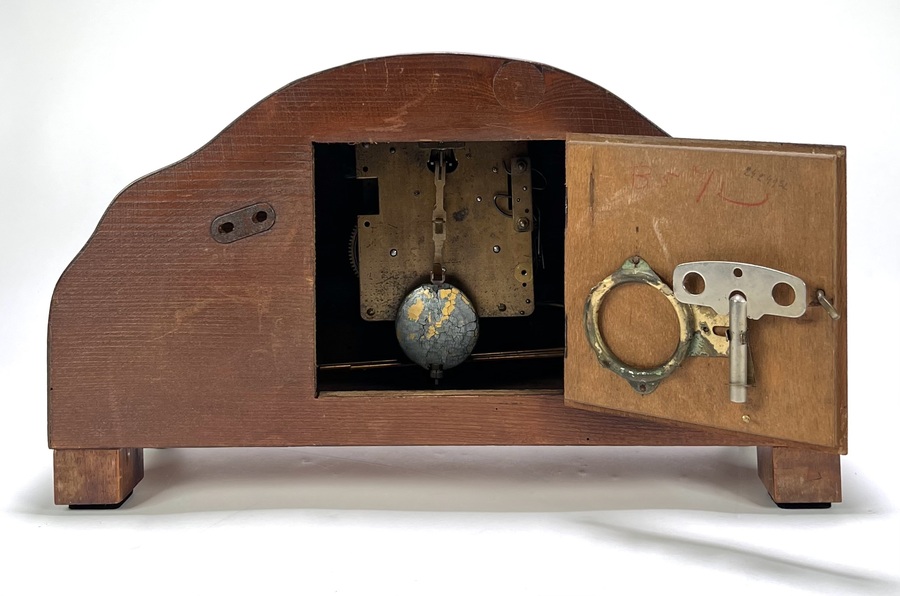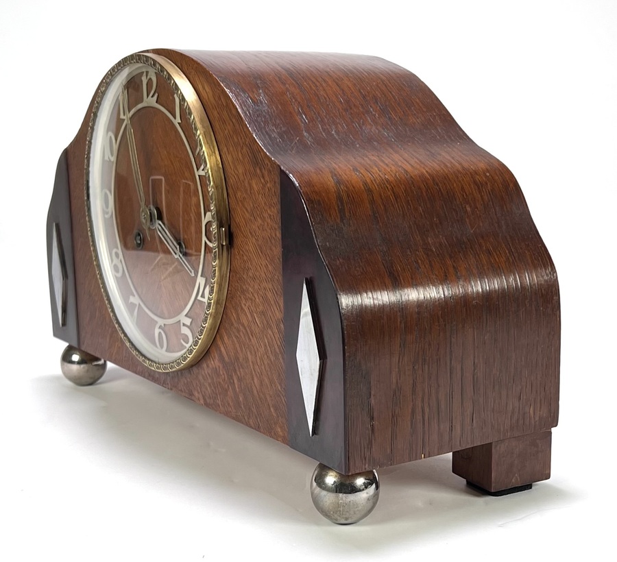 Art Deco mantelklok, vervaardigd circa 1920–1930, met een houten kast en donkere contrasterende zijpanelen. Opvallende kenmerken zijn de twee gestileerde diamantvormige metalen ornamenten en de bolvormige pootjes. Het mechanische uurwerk met slinger en opwindmogelijkheid heeft gongslag op twee staven. Kom langs tijdens de kijkdagen (28 t/m 30 november) en ontdek deze klok zelf! |