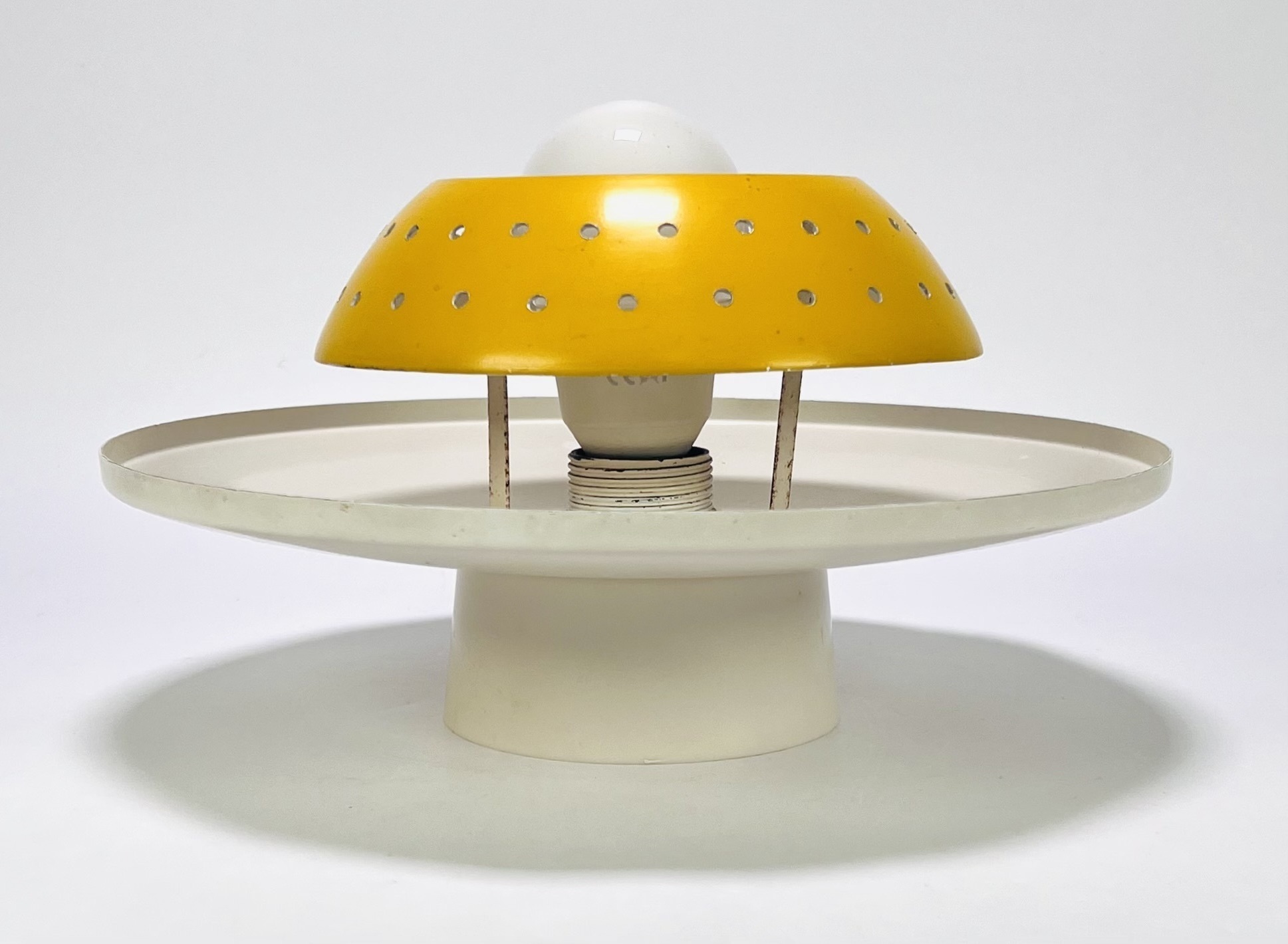 Plafondlamp, een Mid-century modern design, toegeschreven aan de Nederlandse fabrikant Dijkstra Lampen, gedateerd circa 1960–1975. De lamp is uitgevoerd in gelakt metaal met een karakteristiek gelaagd ontwerp. De kleuren zijn geel en wit, waarbij de onderste kom is voorzien van geperforeerde stansgaten. Registreer nu en bied eenvoudig online mee op deze lamp! |