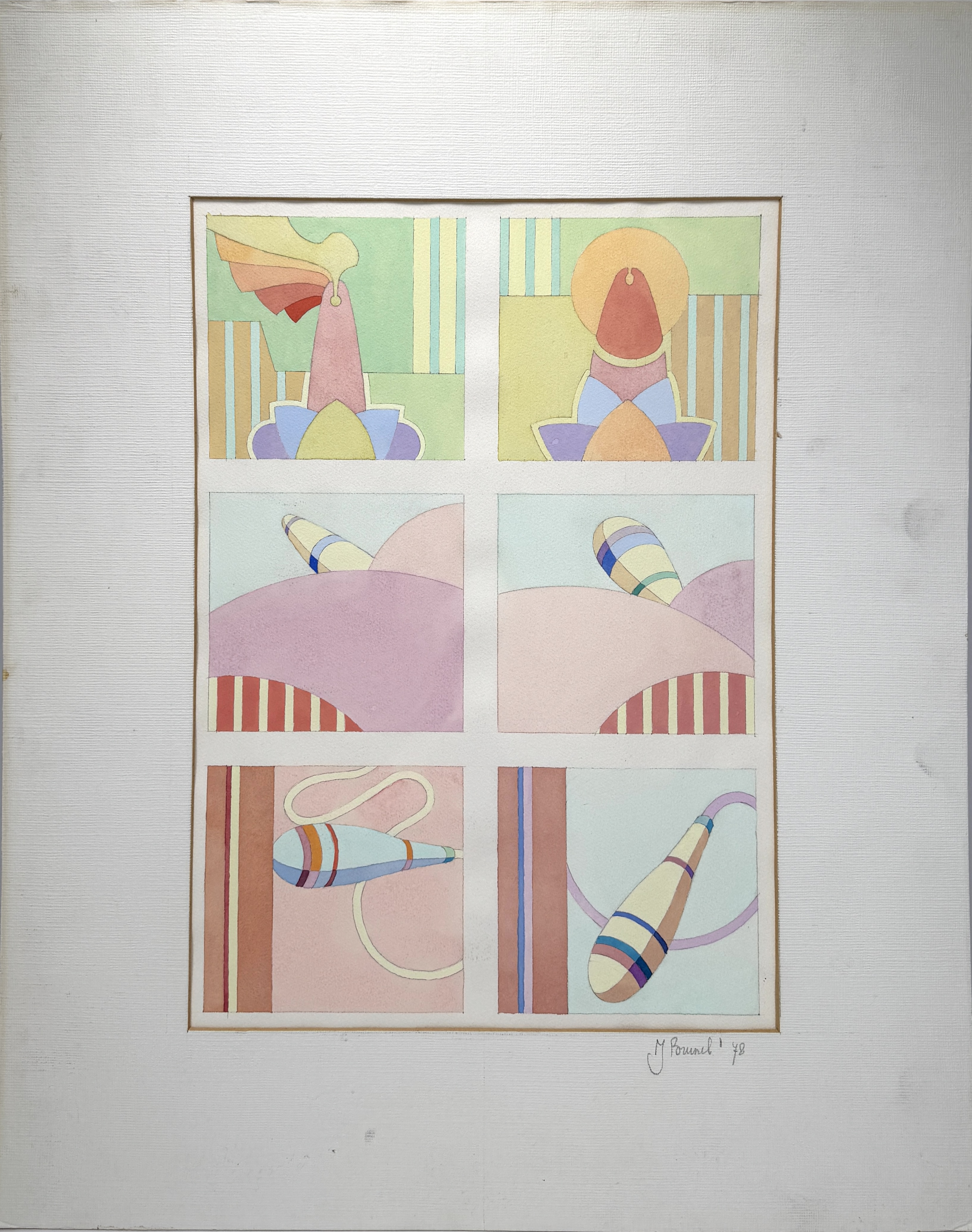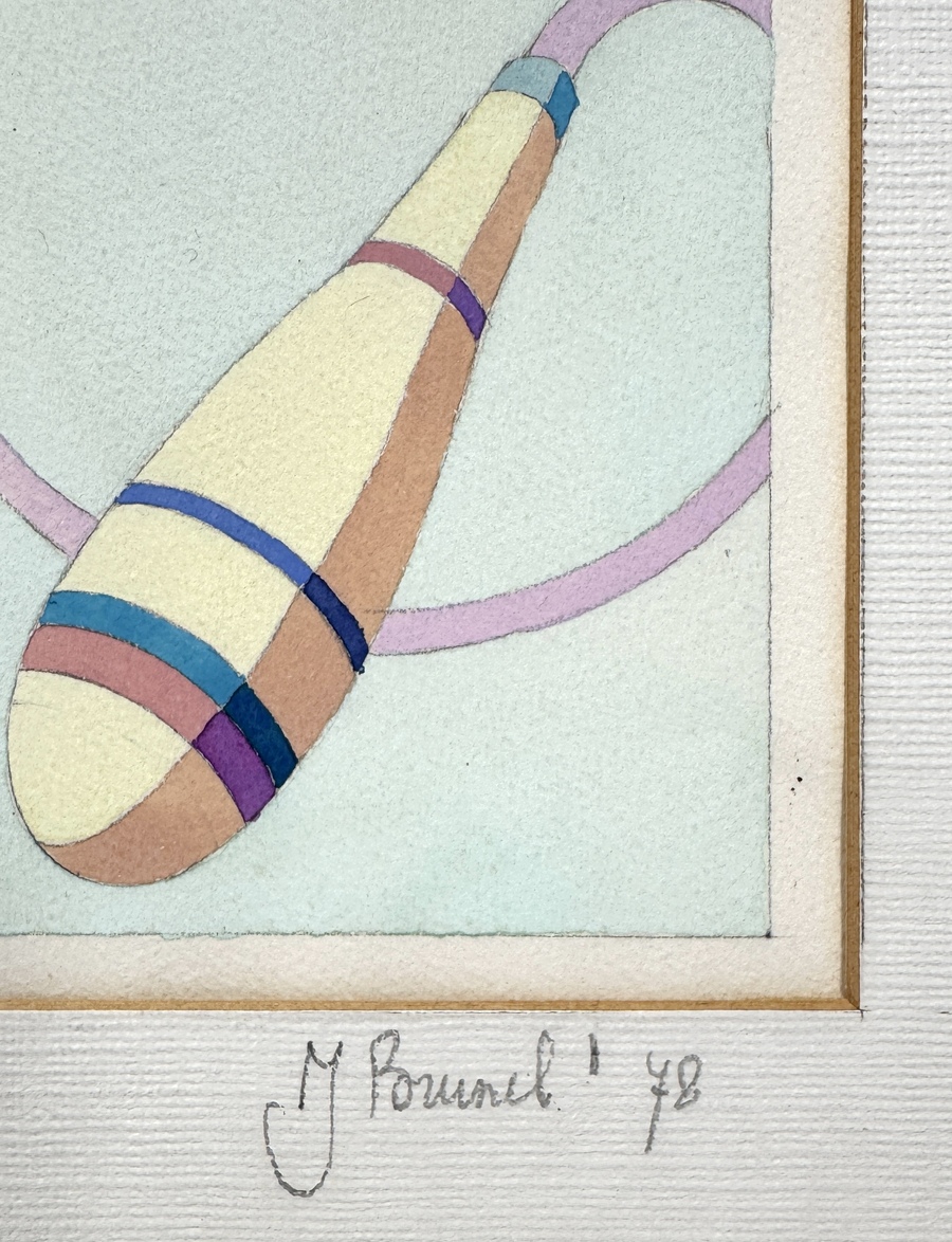 Aquarel met compositietekening op papier, getiteld 'Compositie', gesigneerd en gedateerd “J. Brunel ‘78”. rechtsonder. Het werk is een abstract geometrische studie in een rasterindeling van zes vakken met gestileerde en symbolische vormen. Eerst deze aquarel zien voordat je biedt? Bezoek onze kijkdagen op 28, 29 en 30 november van 11:00 tot 17:00 uur! |