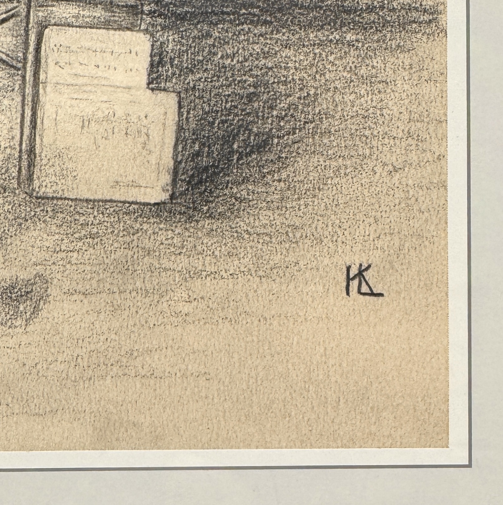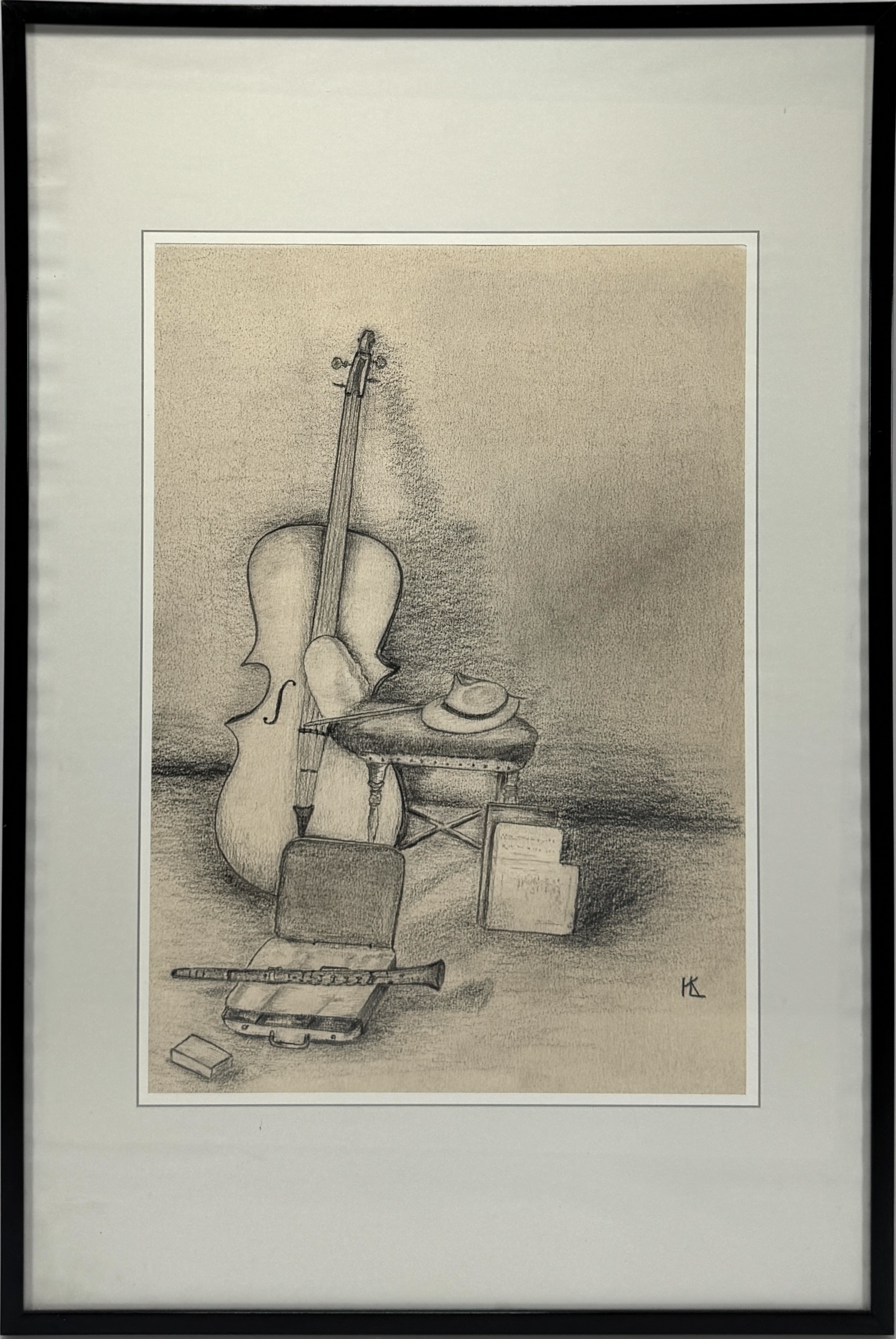 Tekening in potlood/houtskool op papier met een realistisch stilleven van muziekinstrumenten, uitgevoerd in een academische stijl. Het werk toont een grote cello, een klarinet in een open kist en een hoed op een kruk. Het werk dateert uit circa 1920–1950 en is rechtsonder gesigneerd met monogram KL. Kom langs tijdens de kijkdagen (28 t/m 30 november) en ontdek deze tekening zelf! |