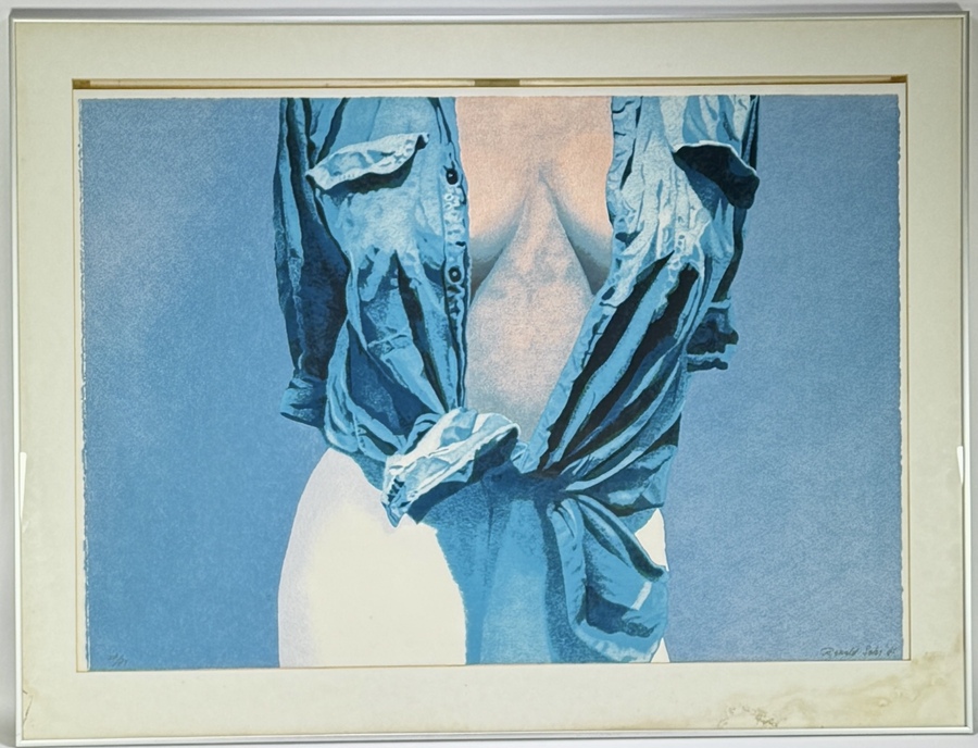 Zeefdruk door Ronald Sacks, gesigneerd en oplagenummer 58/85, in hyperrealistische stijl. Deze figuratie op papier is gedateerd 1985 en toont de torso van een vrouw in een openstaand denim blouse. Zeker zijn van deelname? Plaats vanaf 21 november een schriftelijk bod online! |
