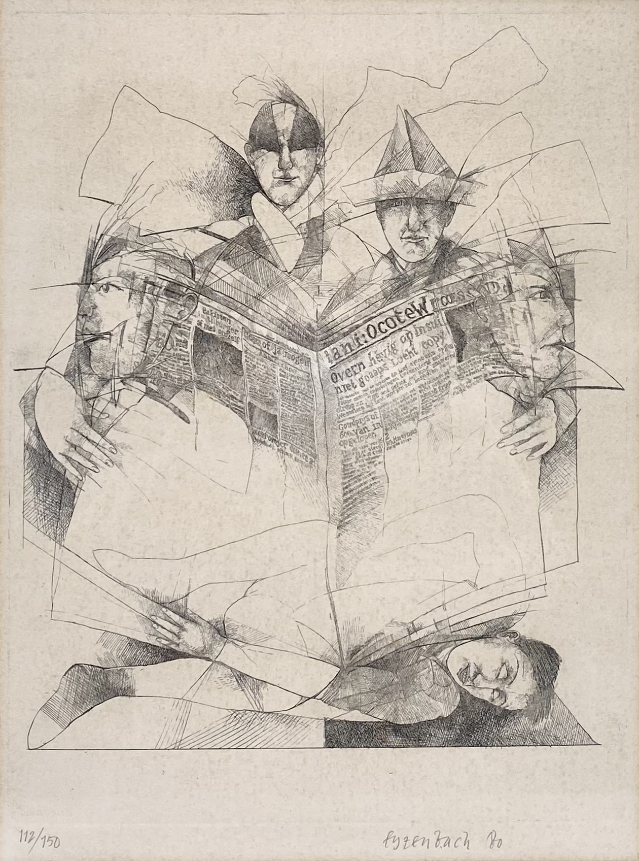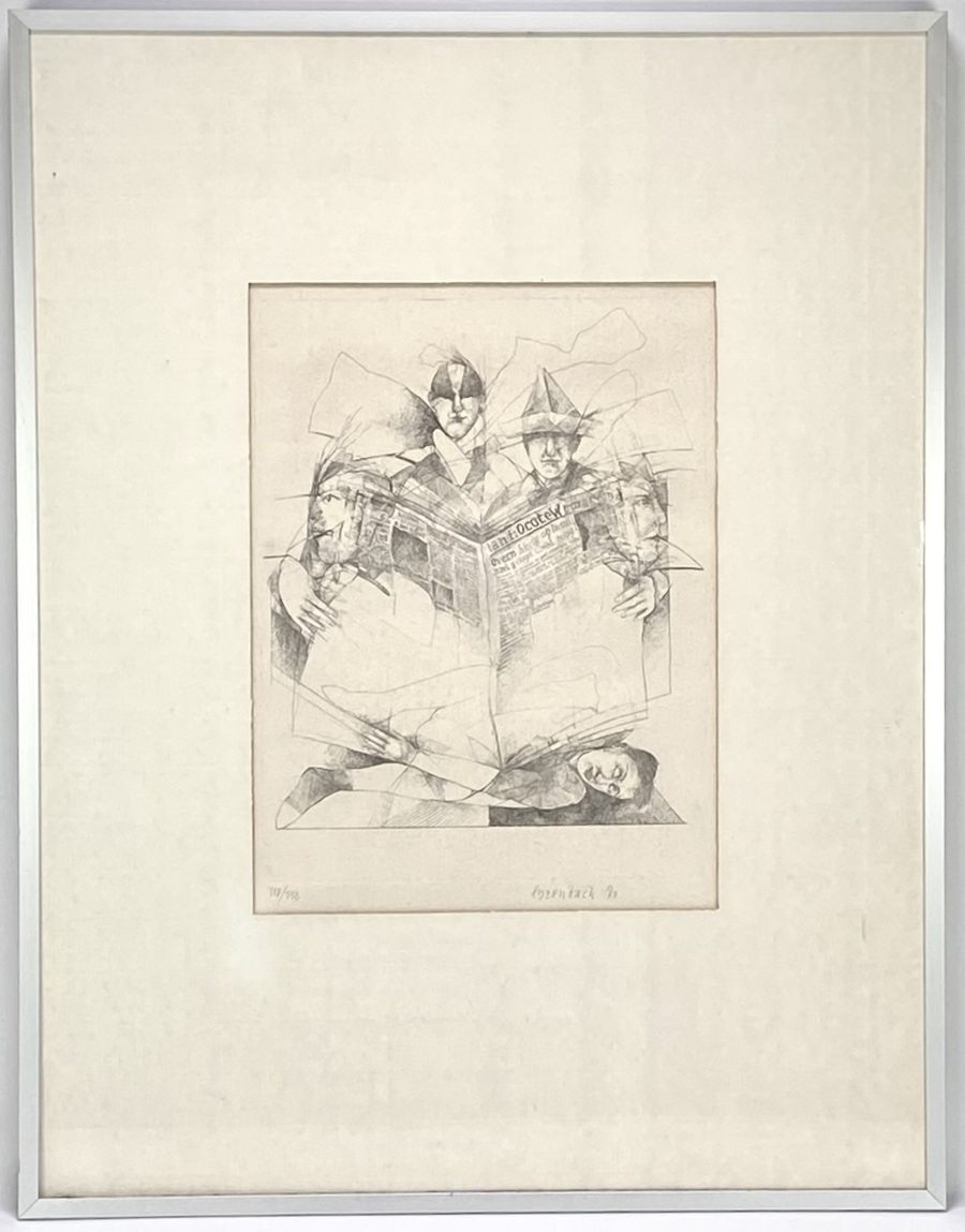 Ets door Tom Eyzenbach (1951) op papier, gedateerd 1980, oplagenummer 112/150, en gesigneerd "Eyzenbach '80" rechtsonder in potlood. De figuratieve voorstelling toont vier in elkaar overlopende figuren die een grote krant vasthouden, uitgevoerd in de stijl van modernisme en magisch realisme. Geïnteresseerd? Bezoek onze kijkdagen op 28, 29 of 30 november van 11:00 tot 17:00 uur! |