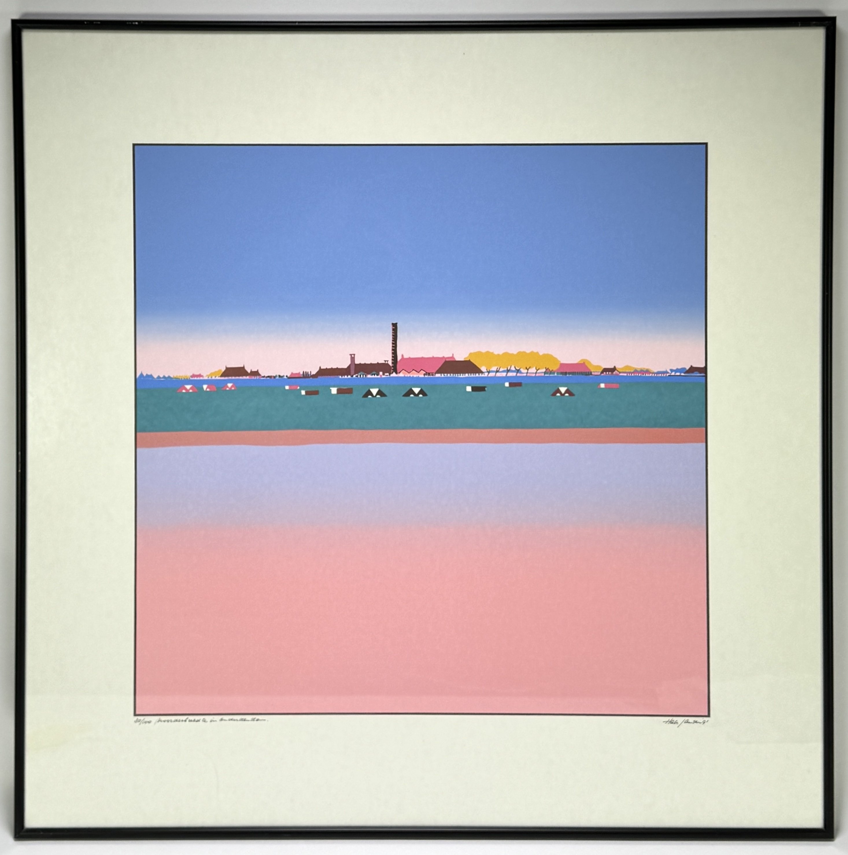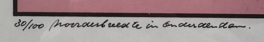 Zeefdruk door Han Jansen (1935) uit 1991, getiteld "Noorderbreedte in Onderdendam.". Het werk is uitgevoerd in de stijl van het grafisch realisme en minimalisme met heldere en vlakke kleurvlakken. De voorstelling toont een geabstraheerd landschap met een dorp en een dominante roze voorgrond. Het werk is genummerd 30/100 en gesigneerd Han Jansen '91. Geïnteresseerd? Bezoek onze kijkdagen op 28, 29 of 30 november van 11:00 tot 17:00 uur! |