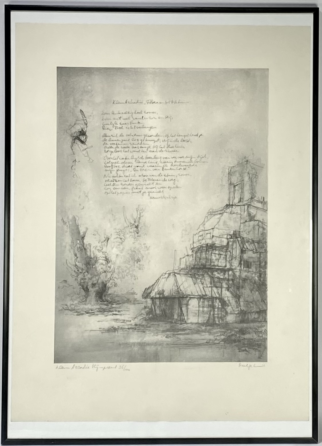 Lithografie op papier, linksonder in potlood oplagenummer 36/100, een autobiografisch werk van Dirkje Kuik (1929–2008) uit 1981. Het grafische werk draagt de titel "Klein Arcadie, Toren en Gebladerte" en combineert een fijn getekende, melancholische figuurlijke voorstelling met een compleet gedicht van de schrijfster. Rechtsonder gesigneerd in potlood. Dit lithografie zelf beoordelen? Je bent welkom op onze kijkdagen op 28, 29 en 30 november! |