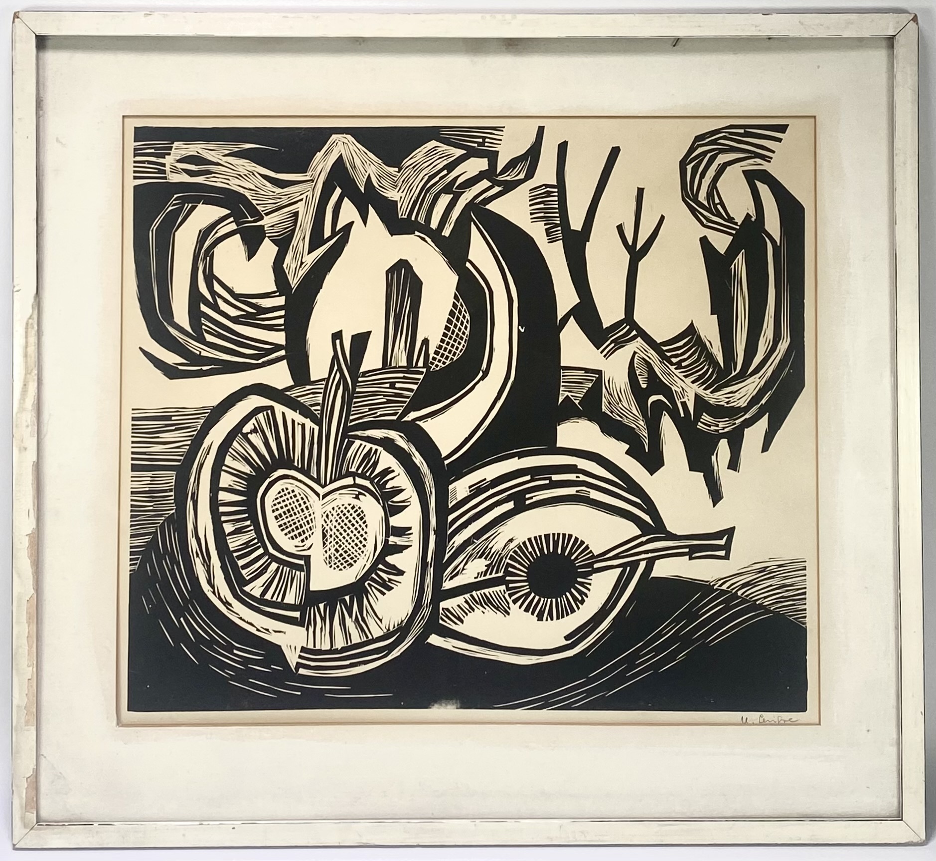 Houtsnede door Hubert Levigne (1905–1989), uitgevoerd in zwart op crème papier. De voorstelling toont een modernistisch stilleven in expressieve lijnvoering, tegen een abstracte achtergrond met golvende vormen. Gesigneerd in potlood rechtsonder “H. Levigne”. Nederlands werk uit de tweede helft van de 20e eeuw. Wil je direct deelnemen? Plaats vanaf 21 november alvast een schriftelijk bod via onze website! |