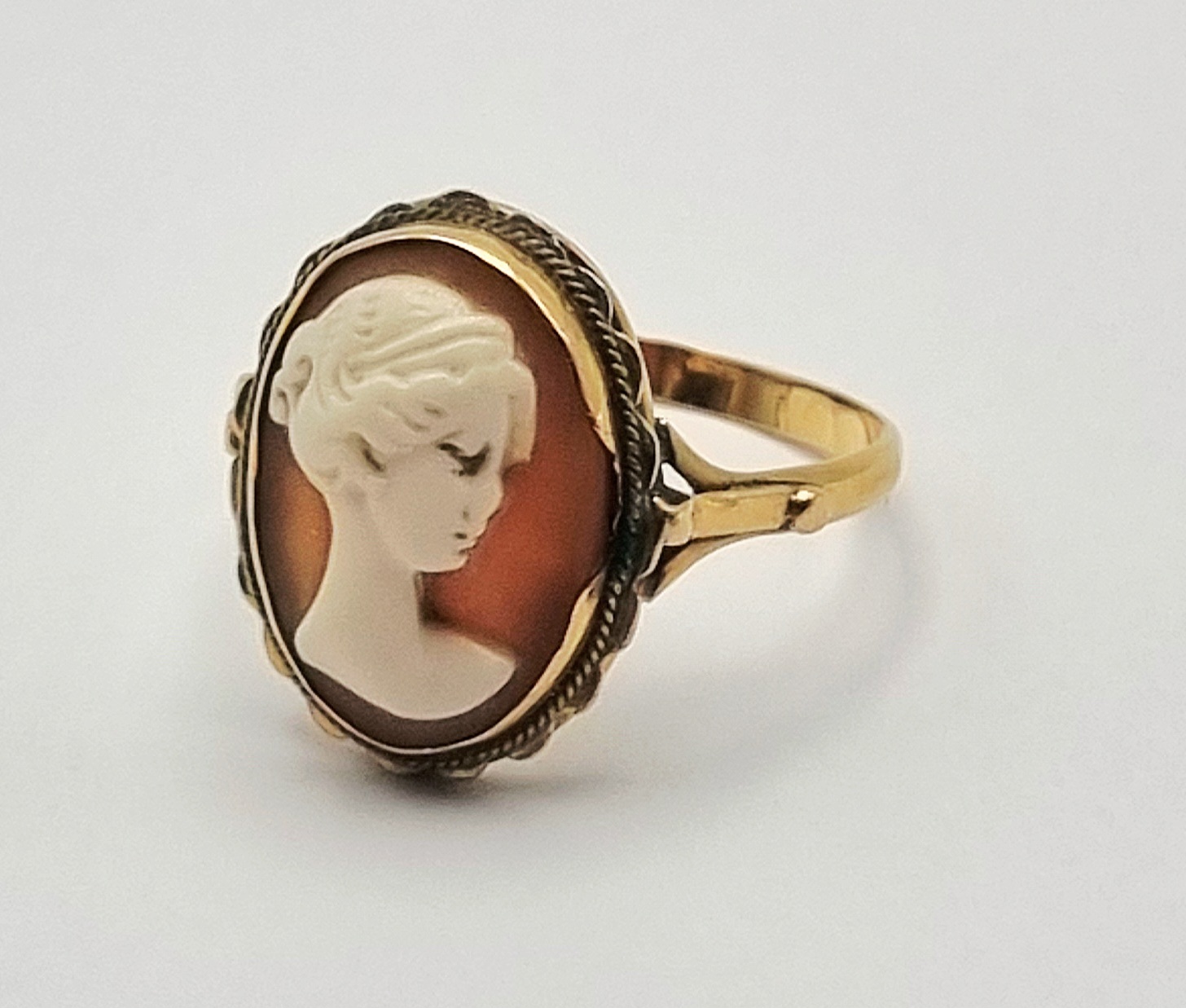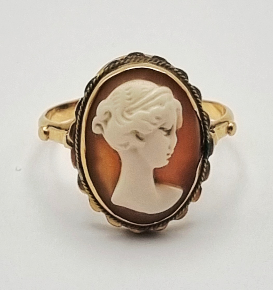 Goud gesmede ring met een ovaal gesneden schelpcamee uit de neoklassieke stijl, gedateerd ca. 1880–1910. De ring is uitgevoerd in 18 karaat geelgoud en gemerkt '750' op de binnenzijde van de band. Het snijwerk toont een naar links gericht vrouwenprofiel tegen een oranjebruine achtergrond, gevat in een zetting met gevlochten sierrand. Dit bijzondere object voor jouw collectie? Grijp je kans! |