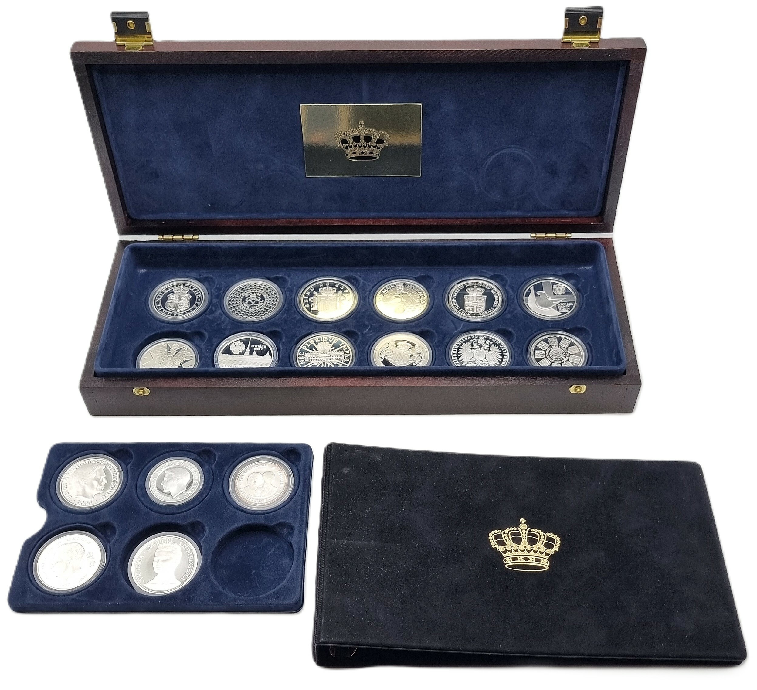 Collectie van zeventien zilveren herdenkingsmunten uit de reeks "Vorstenhuizen van Europa", uitgegeven circa 1993–1997. De munten zijn geslagen in 925/1000e zilver, proof-kwaliteit, en tonen portretten van diverse Europese monarchen zoals Beatrix, Margrethe II en Koning Juan Carlos. De verzameling is geplaatst in een luxe houten presentatiecassette met fluwelen interieur en de bijbehorende certificaten. Kom langs tijdens de kijkdagen (28 t/m 30 november) en ontdek deze munten zelf! |