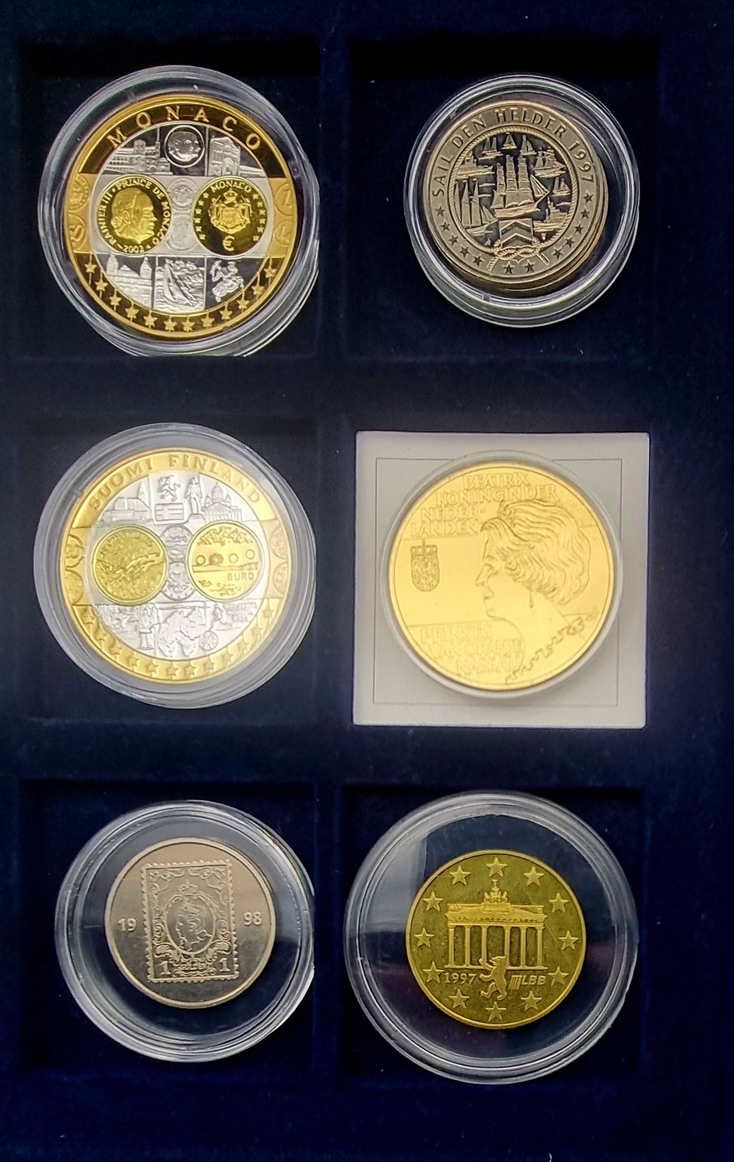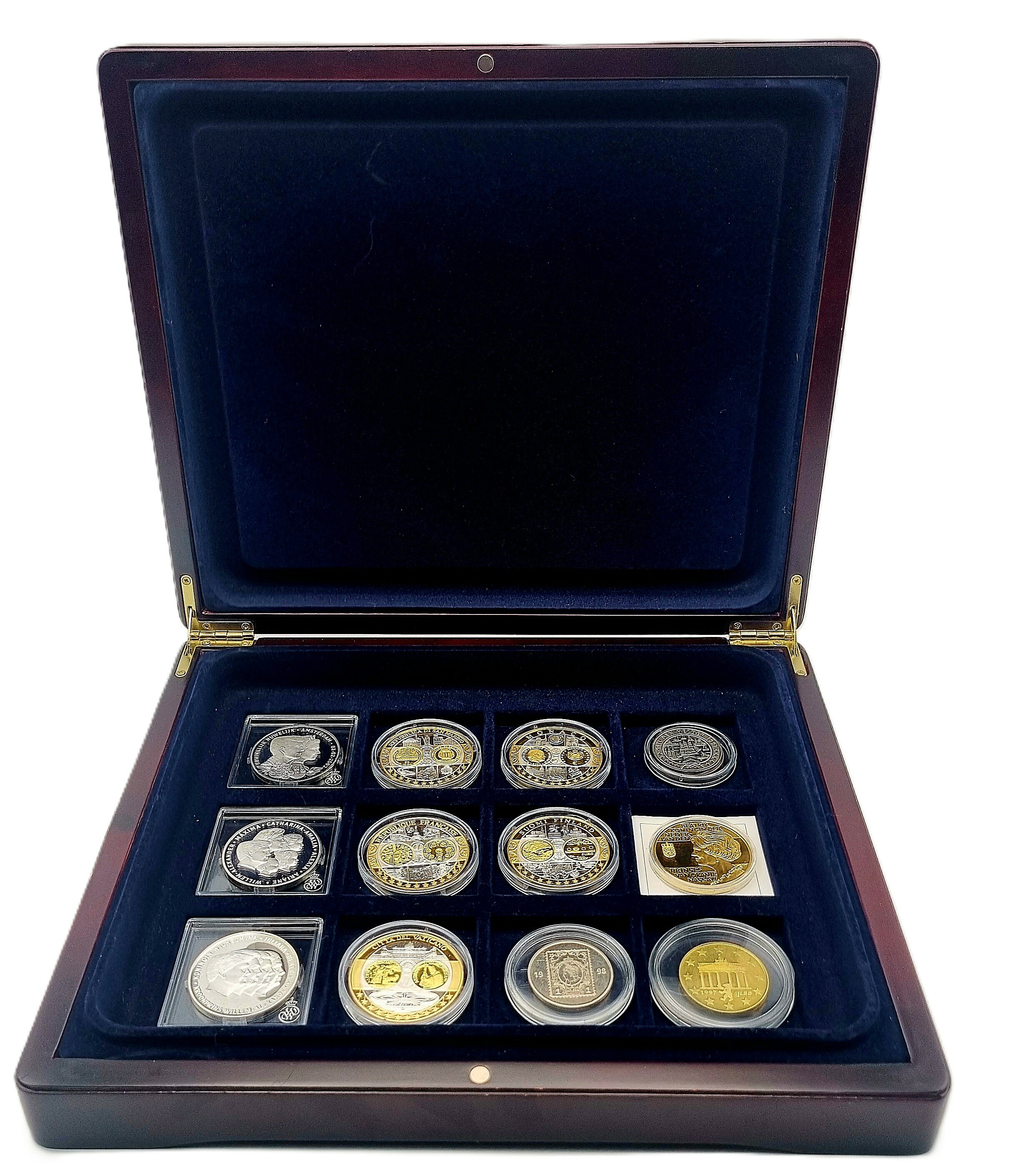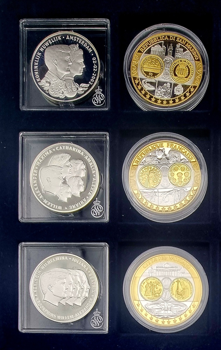 Muntenverzameling in luxe houten presentatiekist, samengesteld uit officiële herdenkingsmunten geslagen door de Koninklijke Nederlandse Munt en diverse Europese uitgiften. Bevat onder meer zilveren, zilveren met vergulding en bimetalen munten uit de series “Eerste Slag van de Eurolanden” (Monaco, Finland, San Marino, Frankrijk), en Nederlandse koninklijke munten rond Willem-Alexander en Máxima met bijbehorende certificaten van echtheid. Ontdek deze muntenverzameling en voeg het toe aan jouw collectie! Registreer nu voor de veiling. |