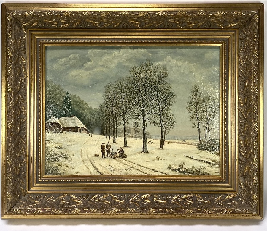 Olieverf op doek door P.A. van Dam, uitgevoerd in de romantisch realistische stijl met Haagse School invloeden, uit de periode circa 1880–1920. Het werk toont een Nederlands winterlandschap met een groep figuren op een besneeuwde weg nabij een rietgedekte boerderij. Het gedempte kleurenpalet benadrukt de sombere atmosfeer onder een wolkenlucht. De achterzijde is voorzien van de naam van de maker. Geïnteresseerd? Bezoek onze kijkdagen op 28, 29 of 30 november van 11:00 tot 17:00 uur! |