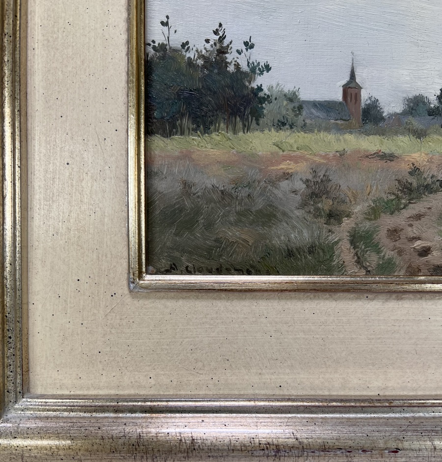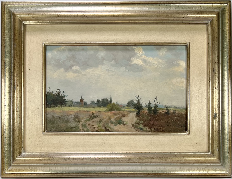Schilderij van een Hollands landschap met een kerk met spitse toren op de achtergrond, olieverf op board. Linksonder onduidelijk gesigneerd. Het impressionistische schilderij uit de eerste helft 20e eeuw (circa 1910–1940) geeft een atmosferische weergave van de lucht weer. Zeker zijn van deelname? Plaats vanaf 21 november een schriftelijk bod online! |